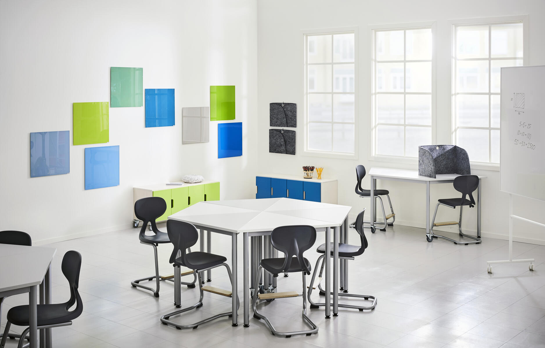 En skolestol med en fleksibel støtte til ryggen. Det ergonomiske design giver brugeren af stolen en bedre kropsholdning. Man kan stable maks. 4 stole i højden og hænge den på et bord ved at vende den. Nem at rengøre. Skal i polyuretan. Sortlakeret understel RAL 9005. Mål: Siddehøjde 50 cm. Sædebredde 38 cm. Sædedybde 34 cm. Inklusive justerbar fodstøtte.
