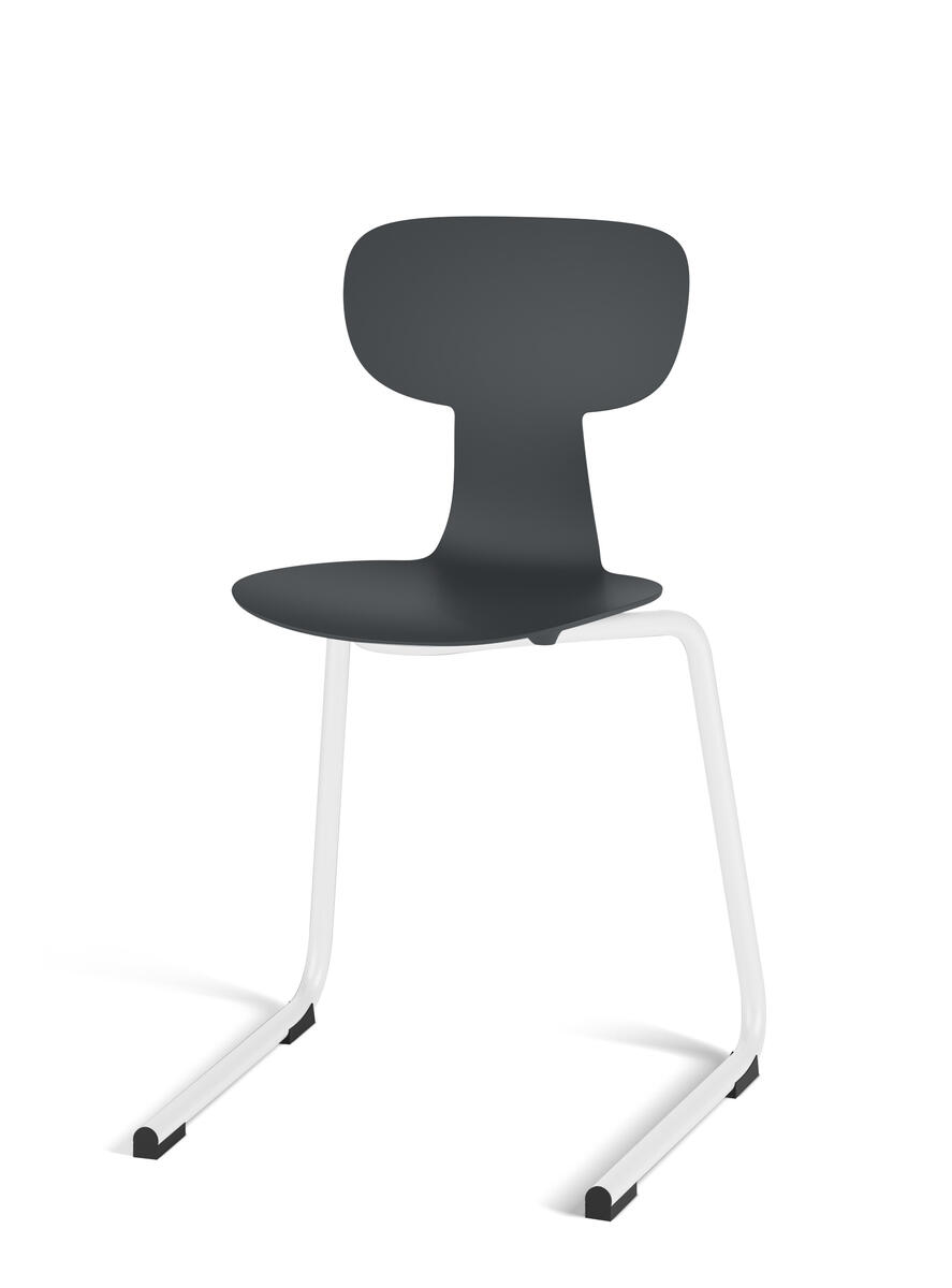 Giver fleksibel støtte til ryggen. Kan stables, maks. 4 stole, og understellet er udformet, så stolen let kan hænges op. Nem at rengøre. Skal i polyuretan. Hvidlakeret understel RAL 9003.