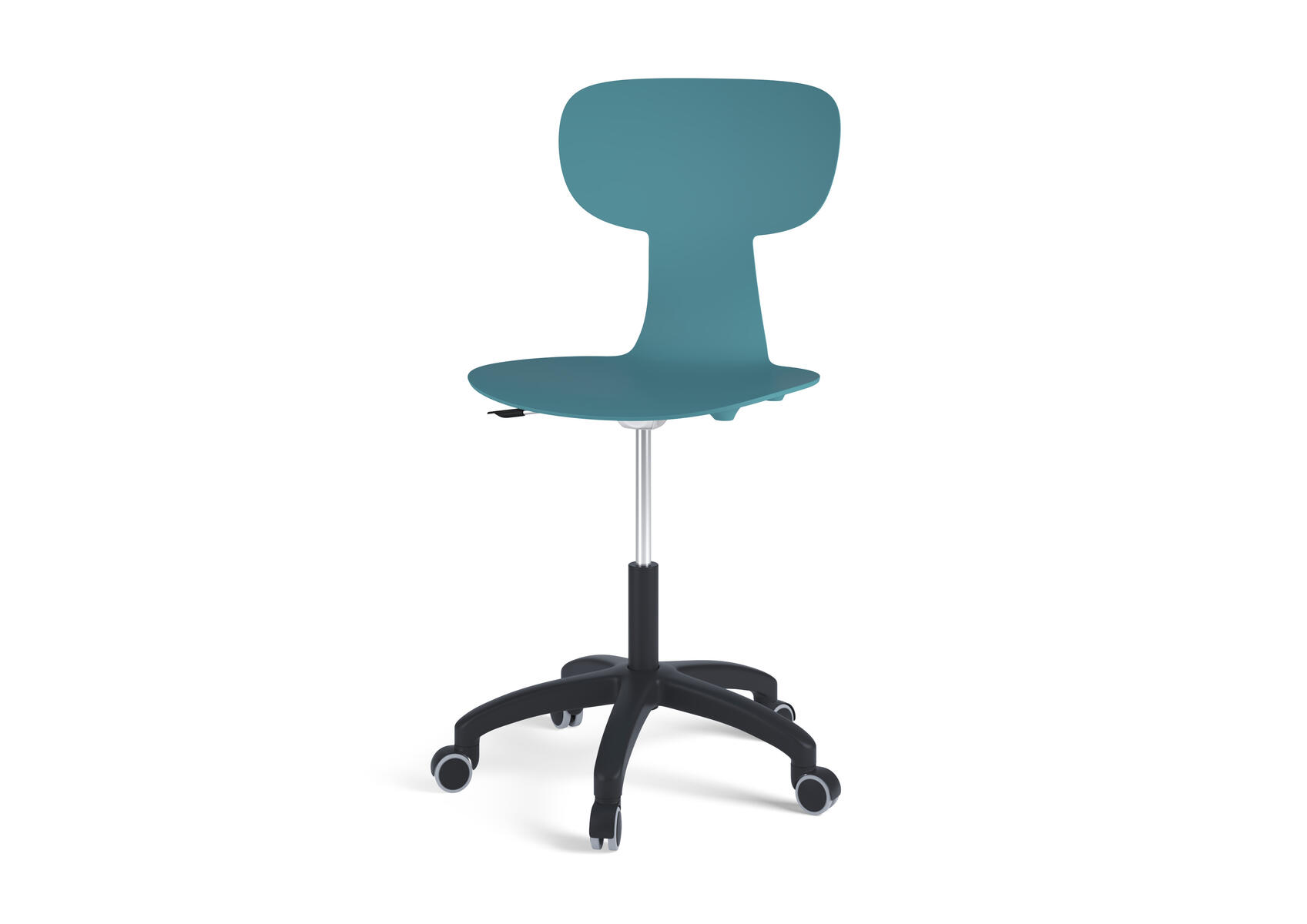 Særdeles holdbar og ergonomisk korrekt stol. Skallen er let fremadhældende, og dens elasticitet understøtter alle kroppens bevægelser. Siddehøjde 50-70 cm. Plastfod monteret med hjul. Skal i PUR.