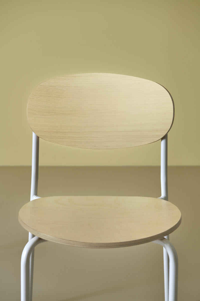 Collab stol med stel fremstillet af 16 mm rør, pulverlakeret i RAL 9003. Sæde og ryg er i formpresset krydsfinér for stabilitet og komfort. Produktet er testet og godkendt i henhold til EN 1729-2:2023. Stolen er stabelbar.