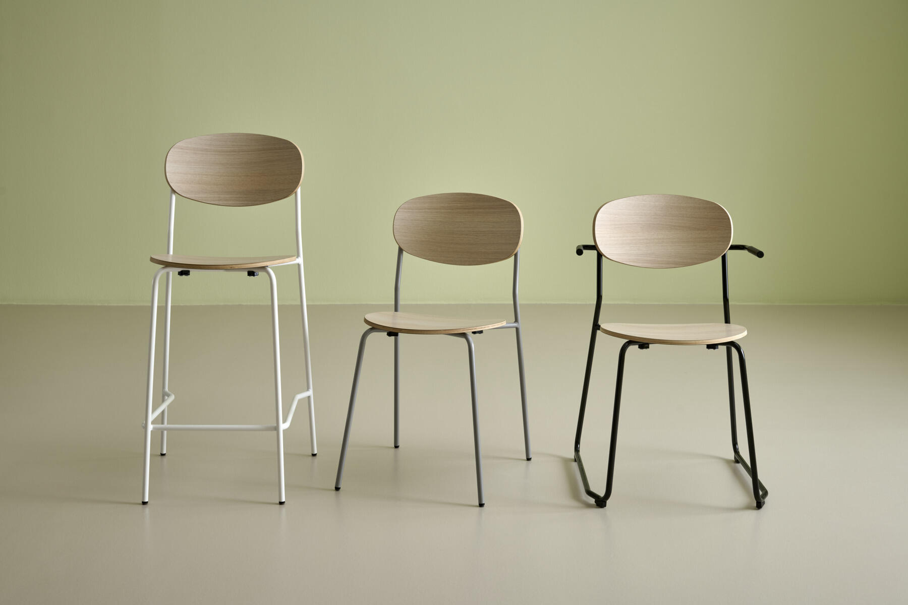 Collab stol med stel fremstillet af 16 mm rør, pulverlakeret i RAL 9003. Sæde og ryg er i formpresset krydsfinér for stabilitet og komfort. Produktet er testet og godkendt i henhold til EN 1729-2:2023. Stolen er stabelbar.