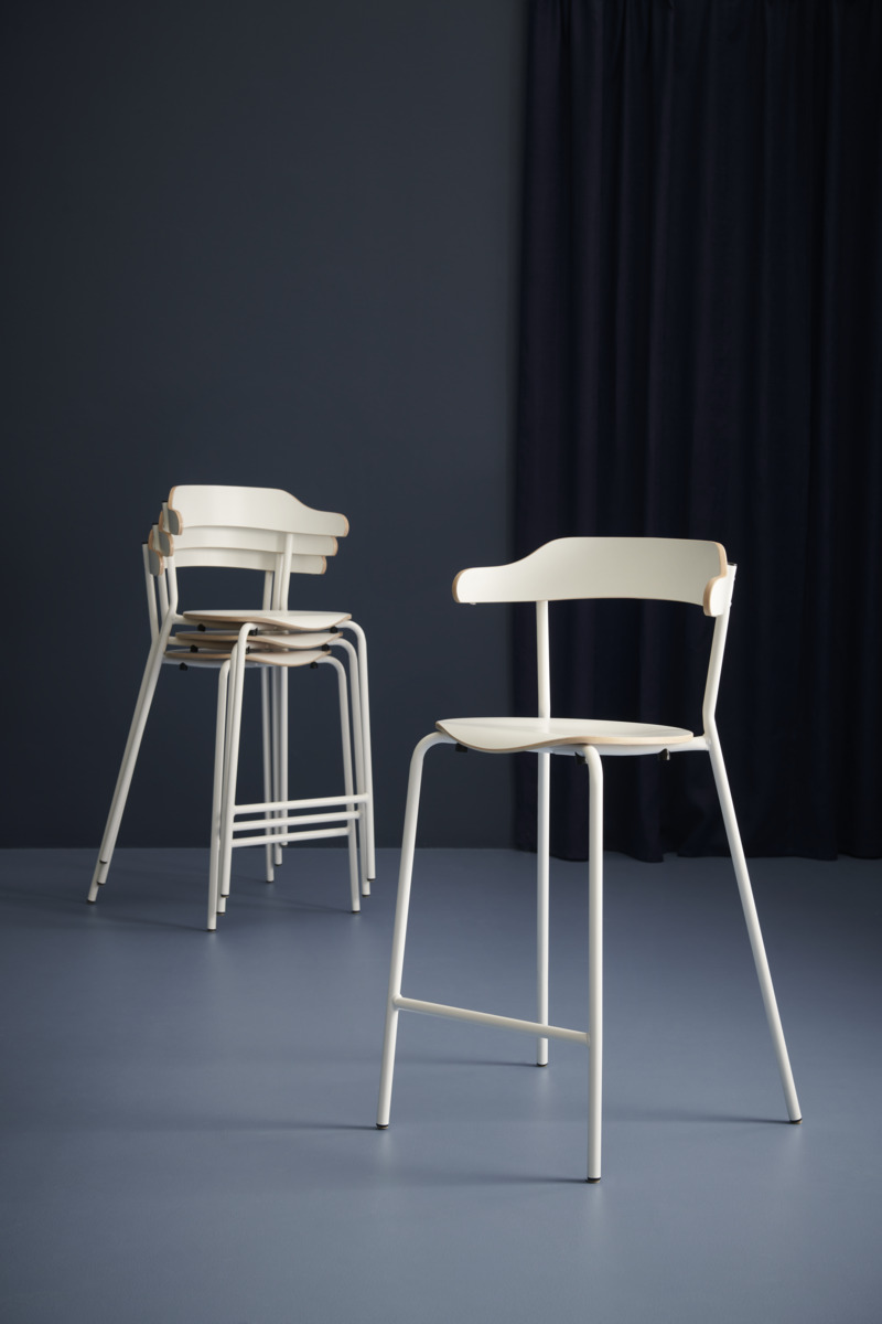 Kan stables (maks. 8 stole) og hænges op. Med lyddæmpende dupper under fødderne. Sæde og ryg i højtrykslaminat. Epoxylakeret understel af hvid RAL9003. Siddehøjde 43 cm, siddedybde 38 cm, siddebredde 50 cm. Vægt 3,75 cm. Testet og godkendt til offentlige miljøer i henhold til gældende europæiske krav.