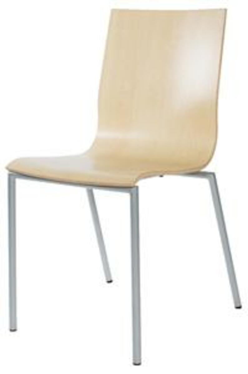 Stol i højtrykslaminat og birk med epoxylakeret understel i sølv RAL9006. Kan stables. Filtbelagte ben. Siddehøjde 46 cm, siddedybde 40 cm, siddebredde 38,5 cm. Totalhøjde 81 cm, bredde 44 cm, dybde 50 cm. Vægt 7 kg.