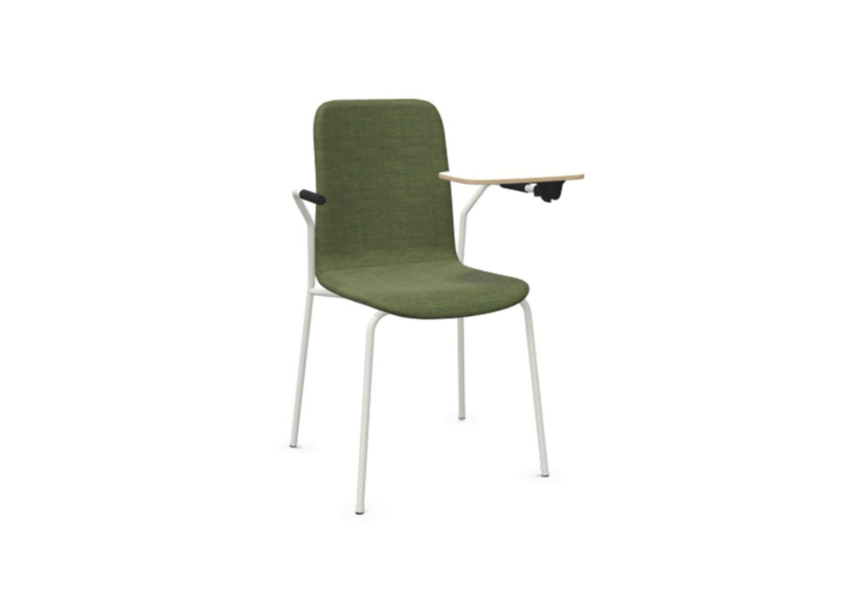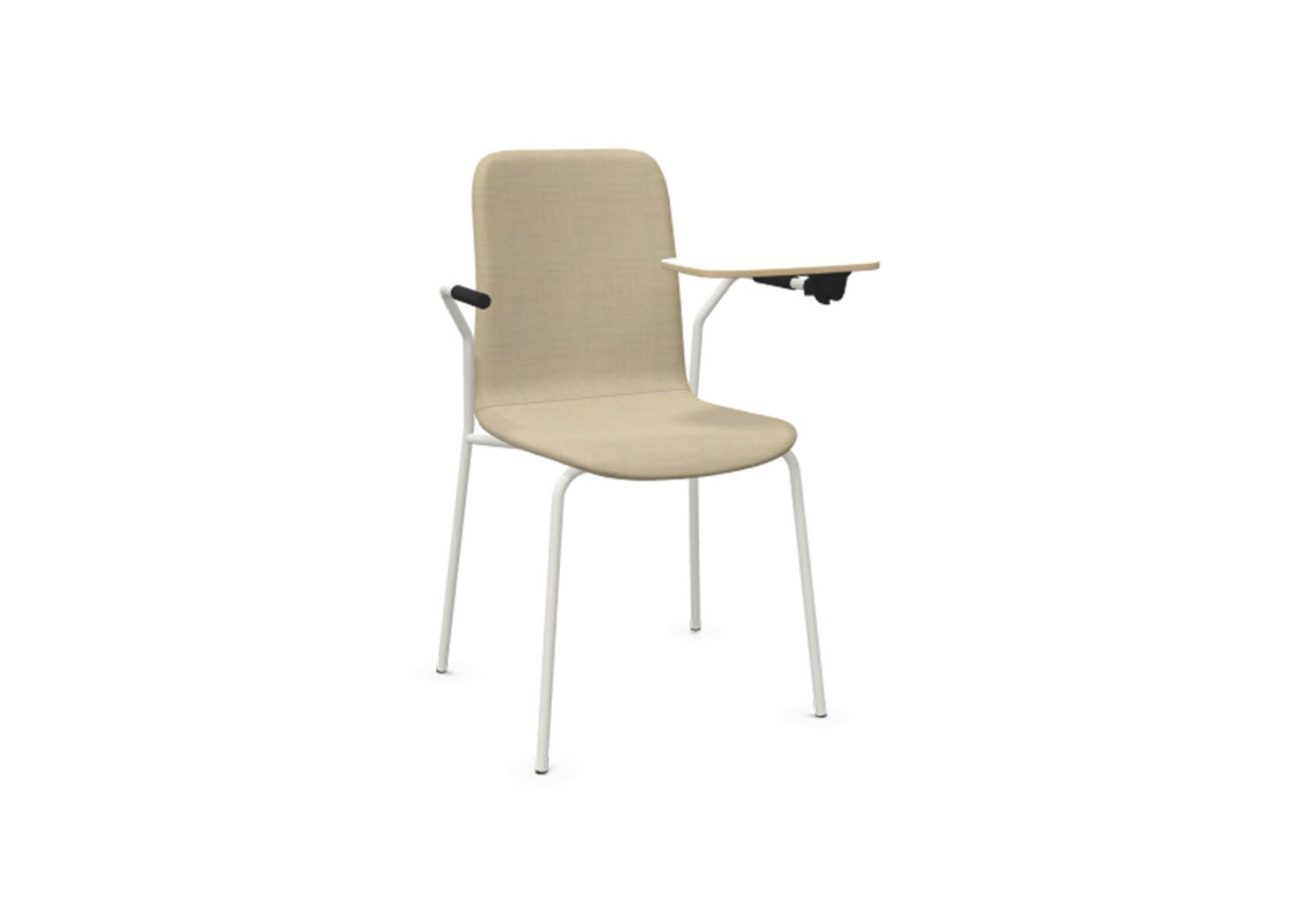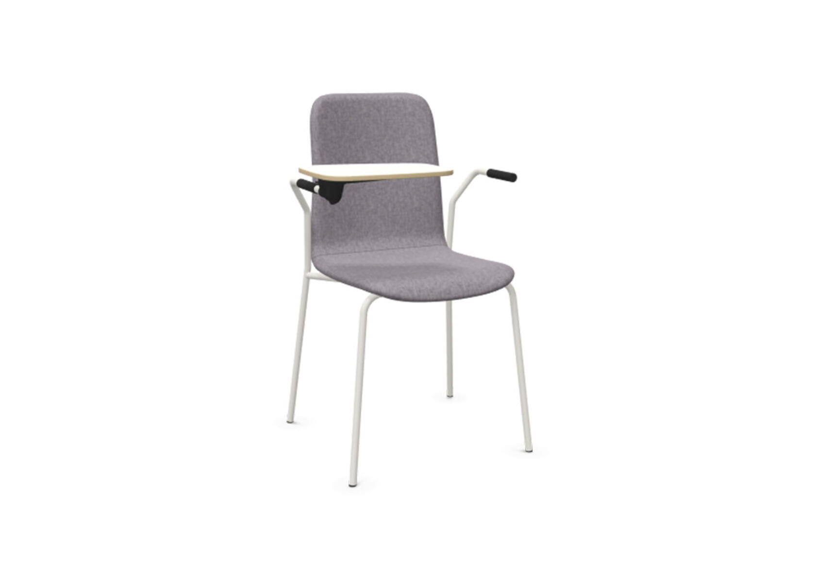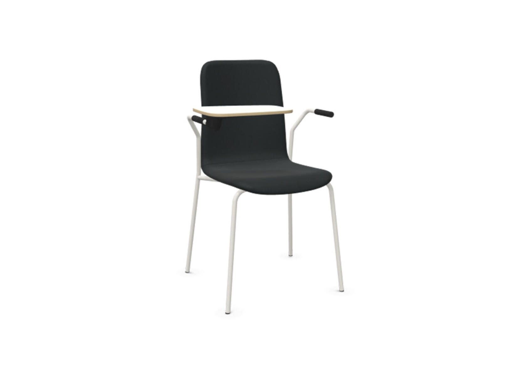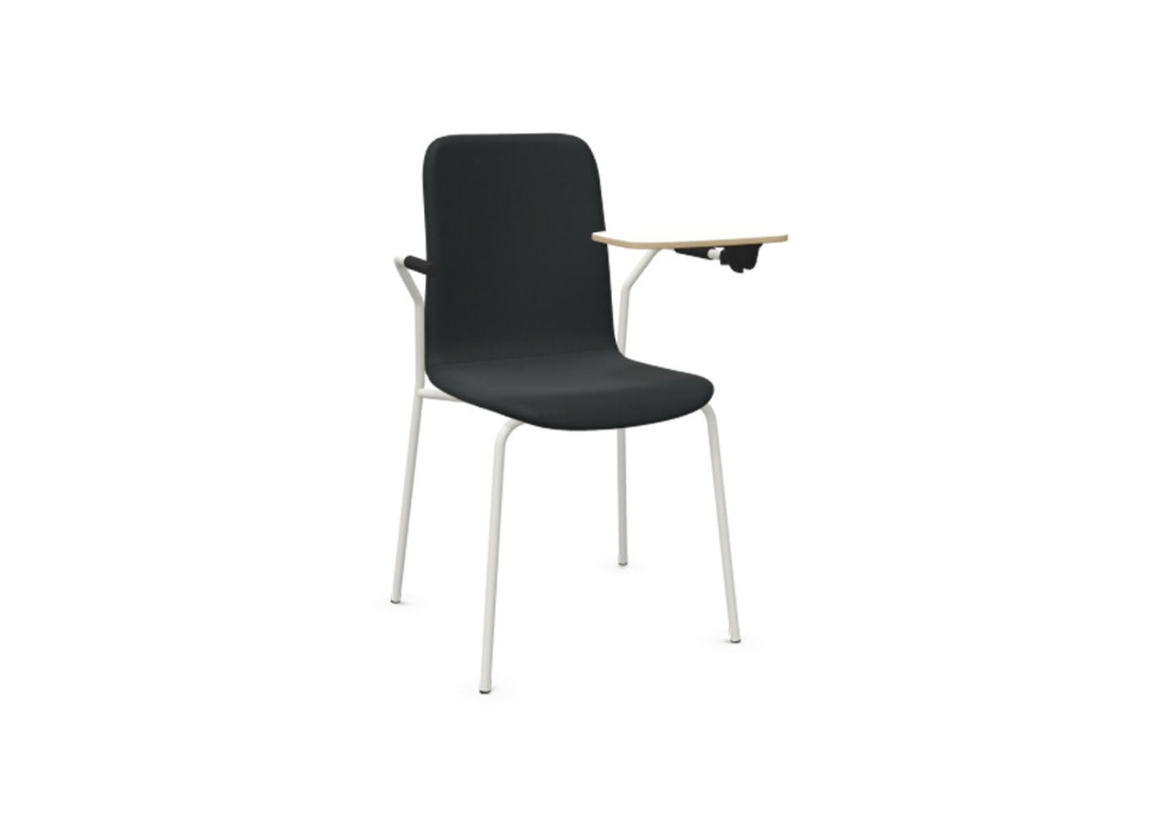 Sædeskål i formpresset krydsfinér belagt med højtrykslaminat. Stabilt pulverlakeret stel i Ø18 mm rør med møbelglidere, der beskytter gulvet. Skriveplade i finér belagt med laminat, 10,5 mm tyk. For ekstra fleksibilitet kan der tilkøbes koblings- og rækkekoblingsbeslag, som gør det nemt at skabe rækker eller gruppesætninger. Maks. belastning 110 kg. Stolen er ikke stabelbar.