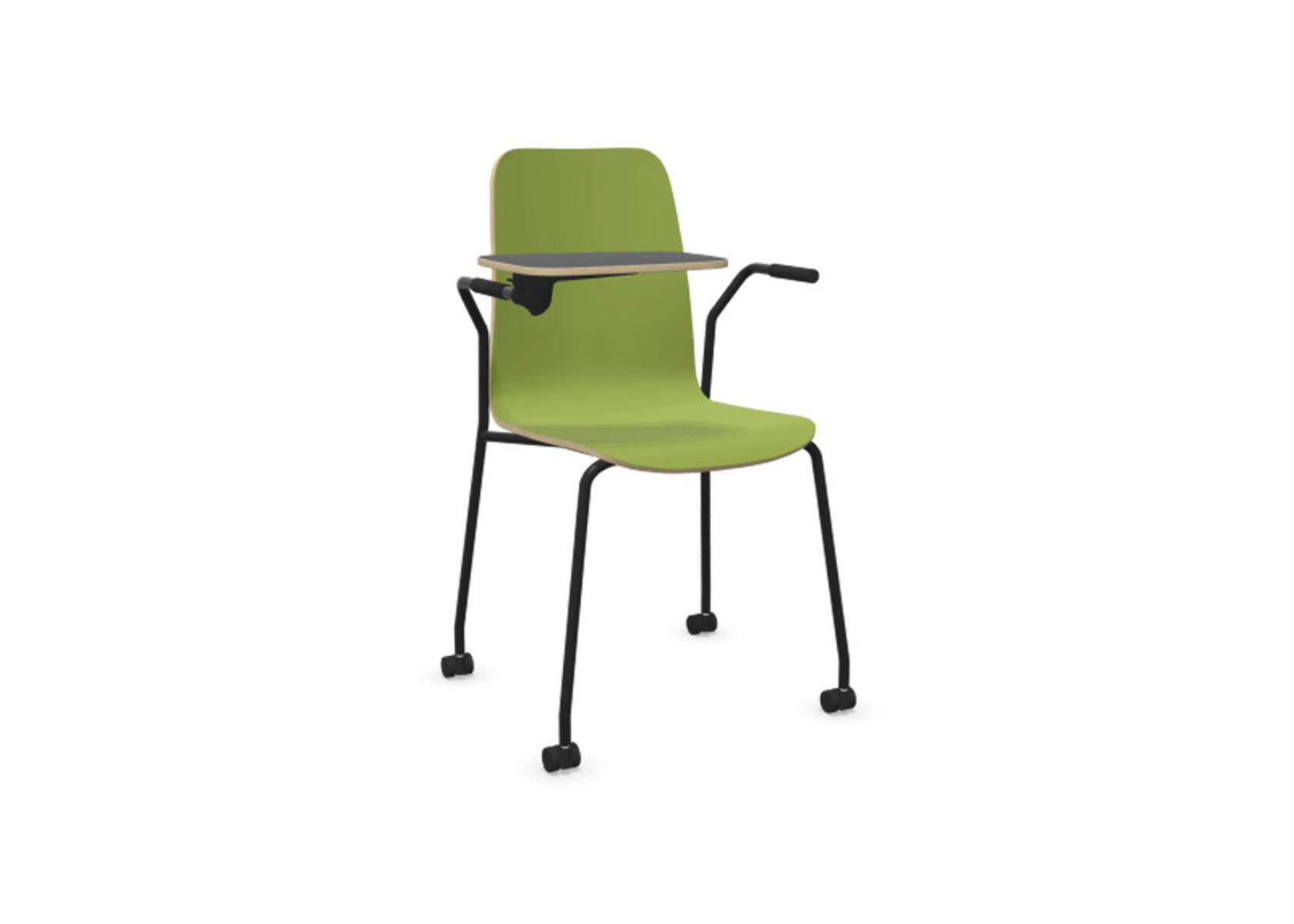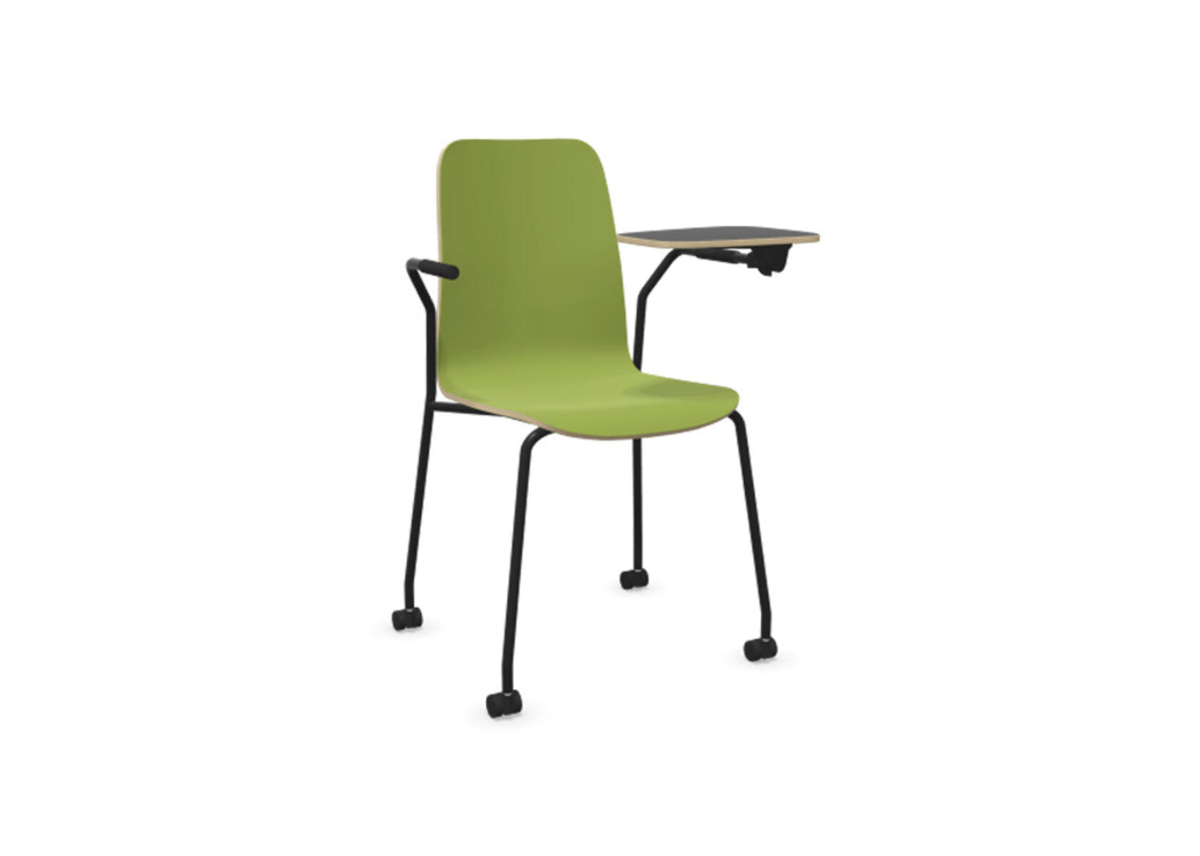 Sædeskål i formpresset krydsfinér belagt med højtrykslaminat. Stabilt pulverlakeret stel i Ø18 mm rør med møbelglidere, der beskytter gulvet. Skriveplade i finér belagt med laminat, 10,5 mm tyk. For ekstra fleksibilitet kan der tilkøbes koblings- og rækkekoblingsbeslag, som gør det nemt at skabe rækker eller gruppesætninger. Maks. belastning 110 kg. Stolen er ikke stabelbar.