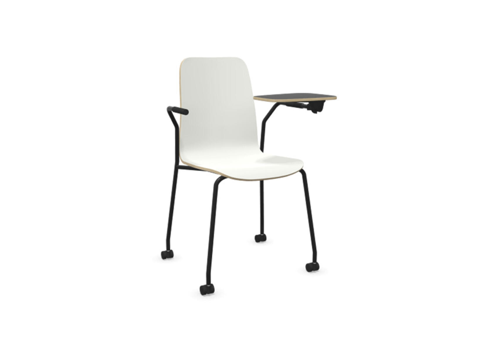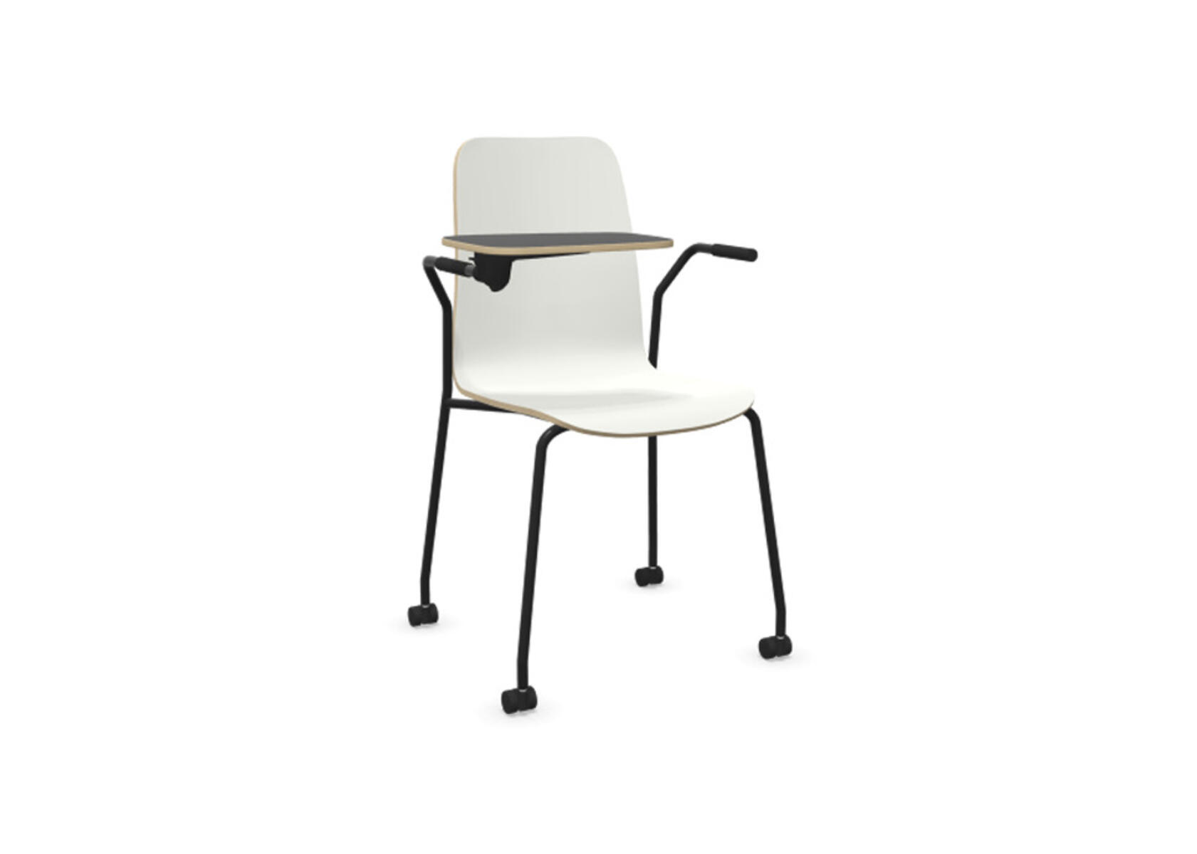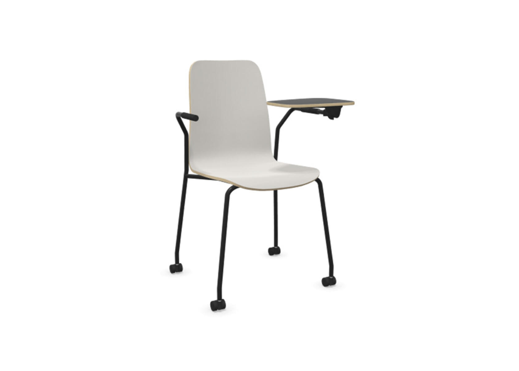 Sædeskål i formpresset krydsfinér belagt med højtrykslaminat. Stabilt pulverlakeret stel i Ø18 mm rør med møbelglidere, der beskytter gulvet. Skriveplade i finér belagt med laminat, 10,5 mm tyk. Maks. belastning 110 kg. Stolen er ikke stabelbar.