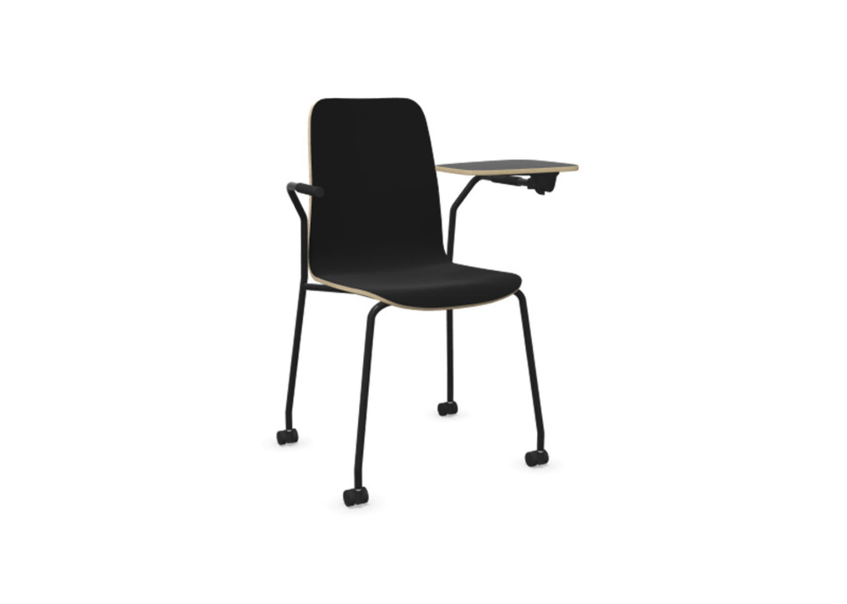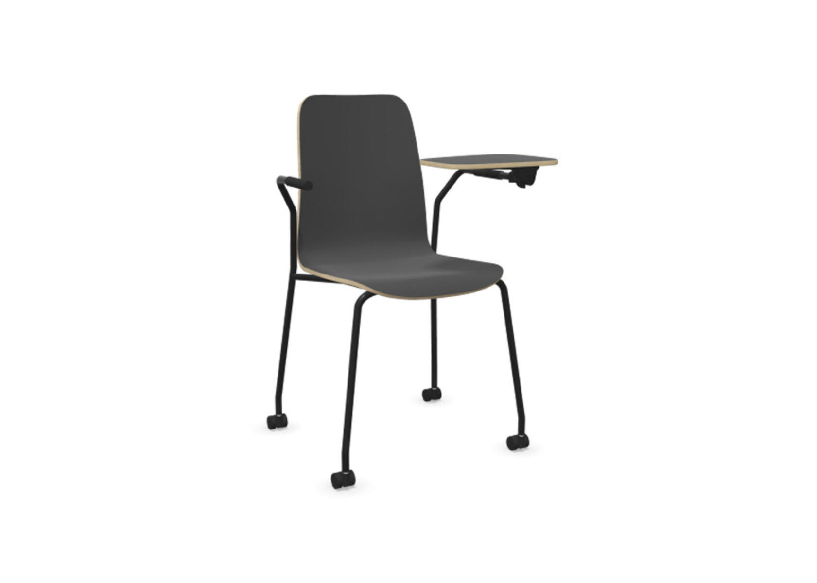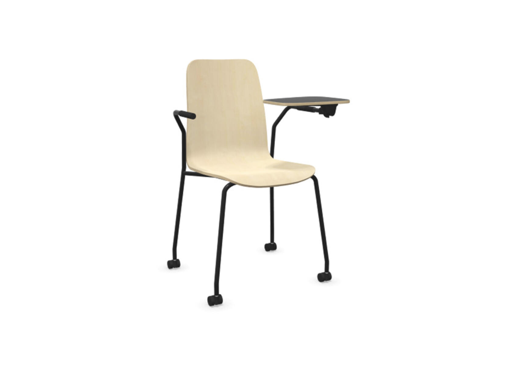 Sædeskål i formpresset krydsfinér belagt med højtrykslaminat. Stabilt pulverlakeret stel i Ø18 mm rør med møbelglidere, der beskytter gulvet. Skriveplade i finér belagt med laminat, 10,5 mm tyk. Maks. belastning 110 kg. Stolen er ikke stabelbar.