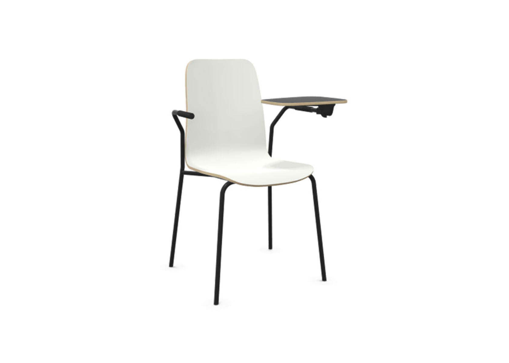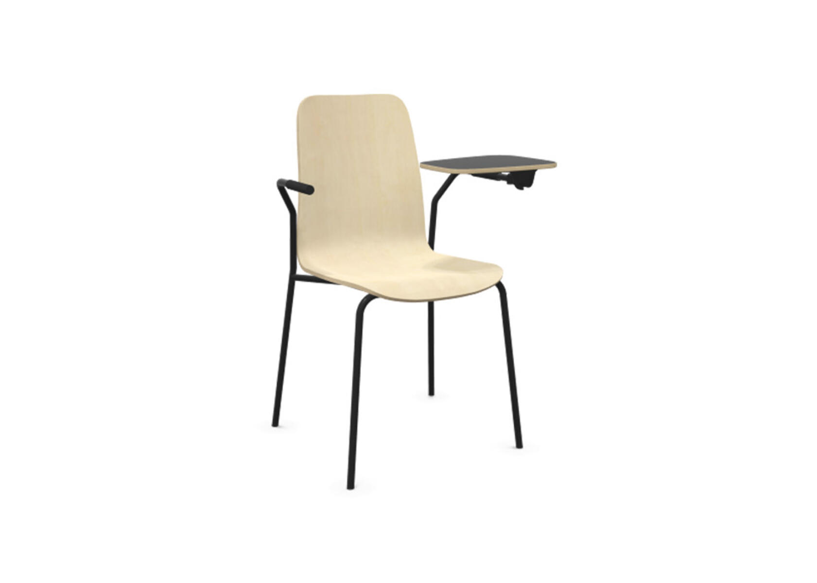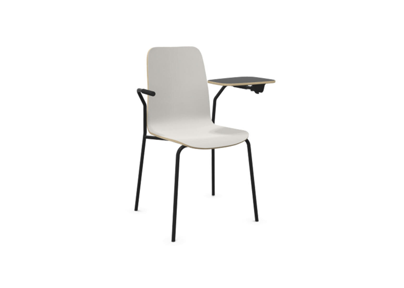 Sædeskål i formpresset krydsfinér belagt med højtrykslaminat. Stabilt pulverlakeret stel i Ø18 mm rør med møbelglidere, der beskytter gulvet. Skriveplade i finér belagt med laminat, 10,5 mm tyk. For ekstra fleksibilitet kan der tilkøbes koblings- og rækkekoblingsbeslag, som gør det nemt at skabe rækker eller gruppesætninger. Maks. belastning 110 kg. Stolen er ikke stabelbar.