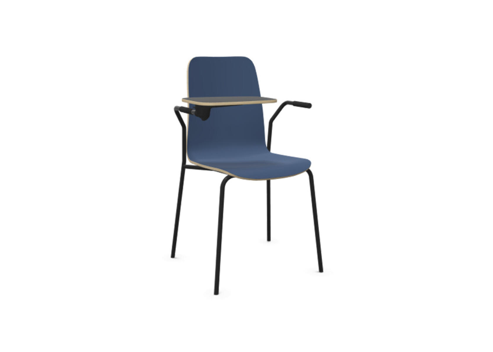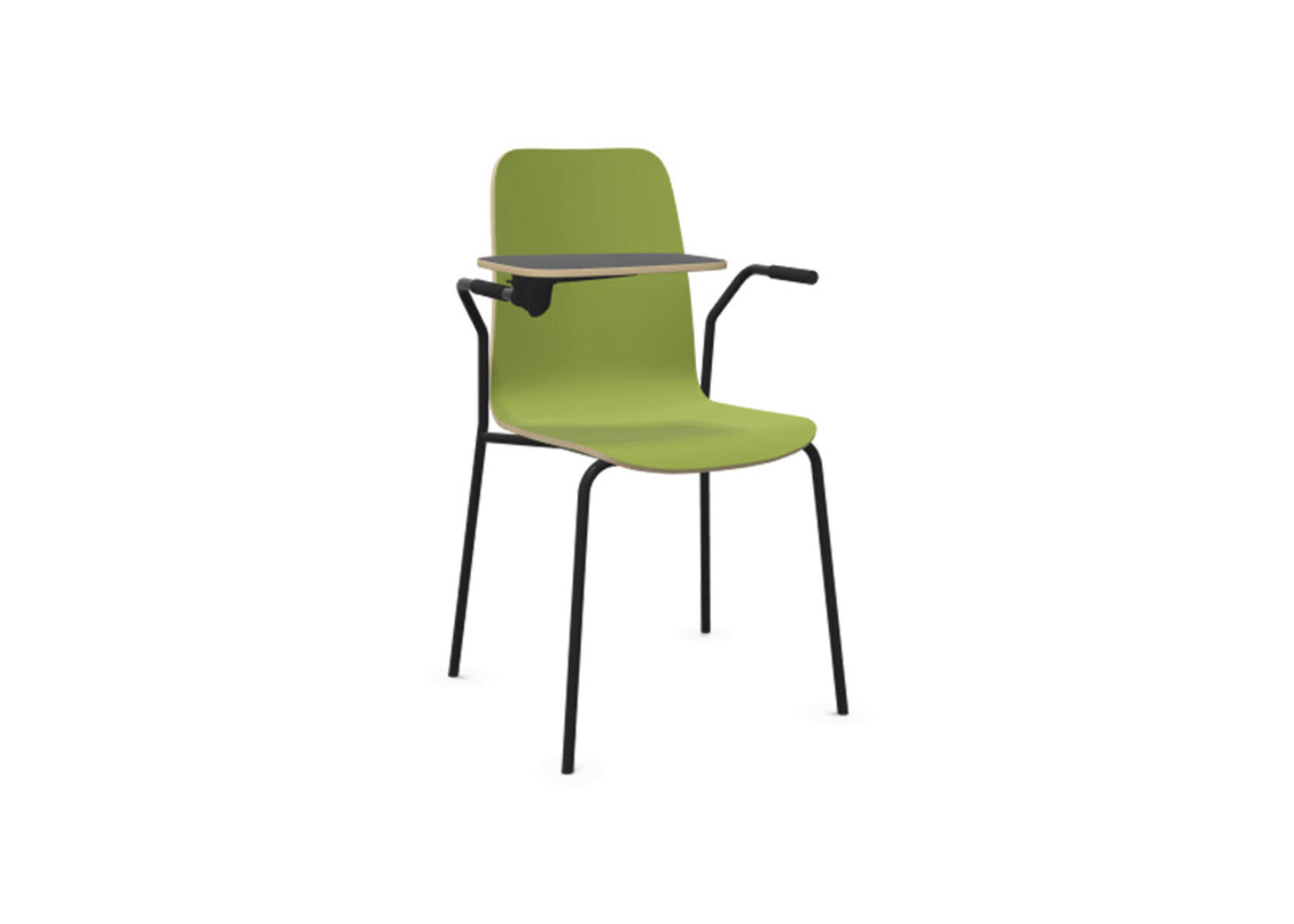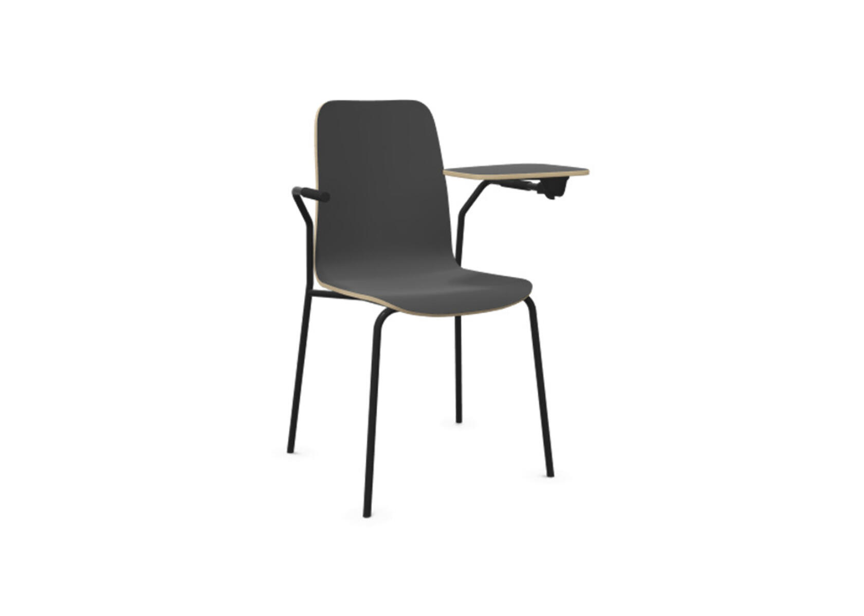 Sædeskål i formpresset krydsfinér belagt med højtrykslaminat. Stabilt pulverlakeret stel i Ø18 mm rør med møbelglidere, der beskytter gulvet. Skriveplade i finér belagt med laminat, 10,5 mm tyk. For ekstra fleksibilitet kan der tilkøbes koblings- og rækkekoblingsbeslag, som gør det nemt at skabe rækker eller gruppesætninger. Maks. belastning 110 kg. Stolen er ikke stabelbar.