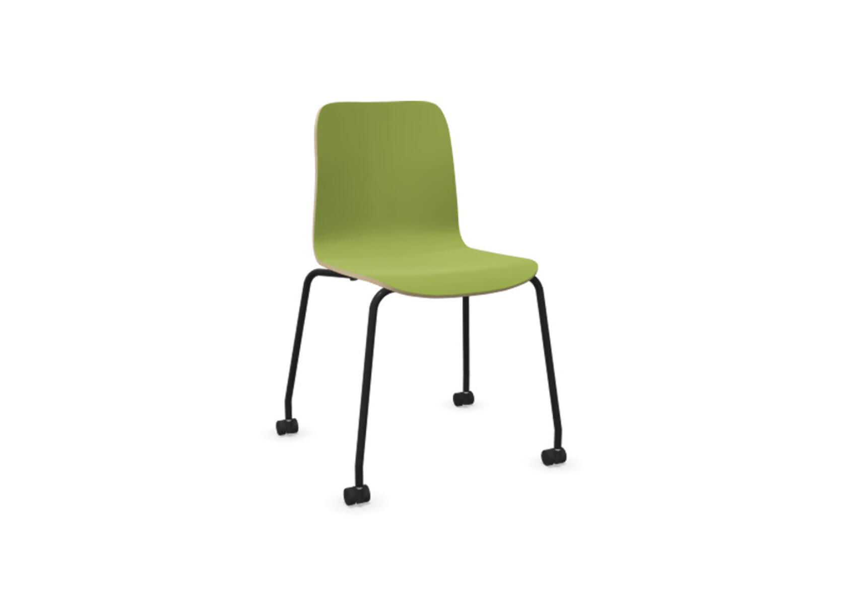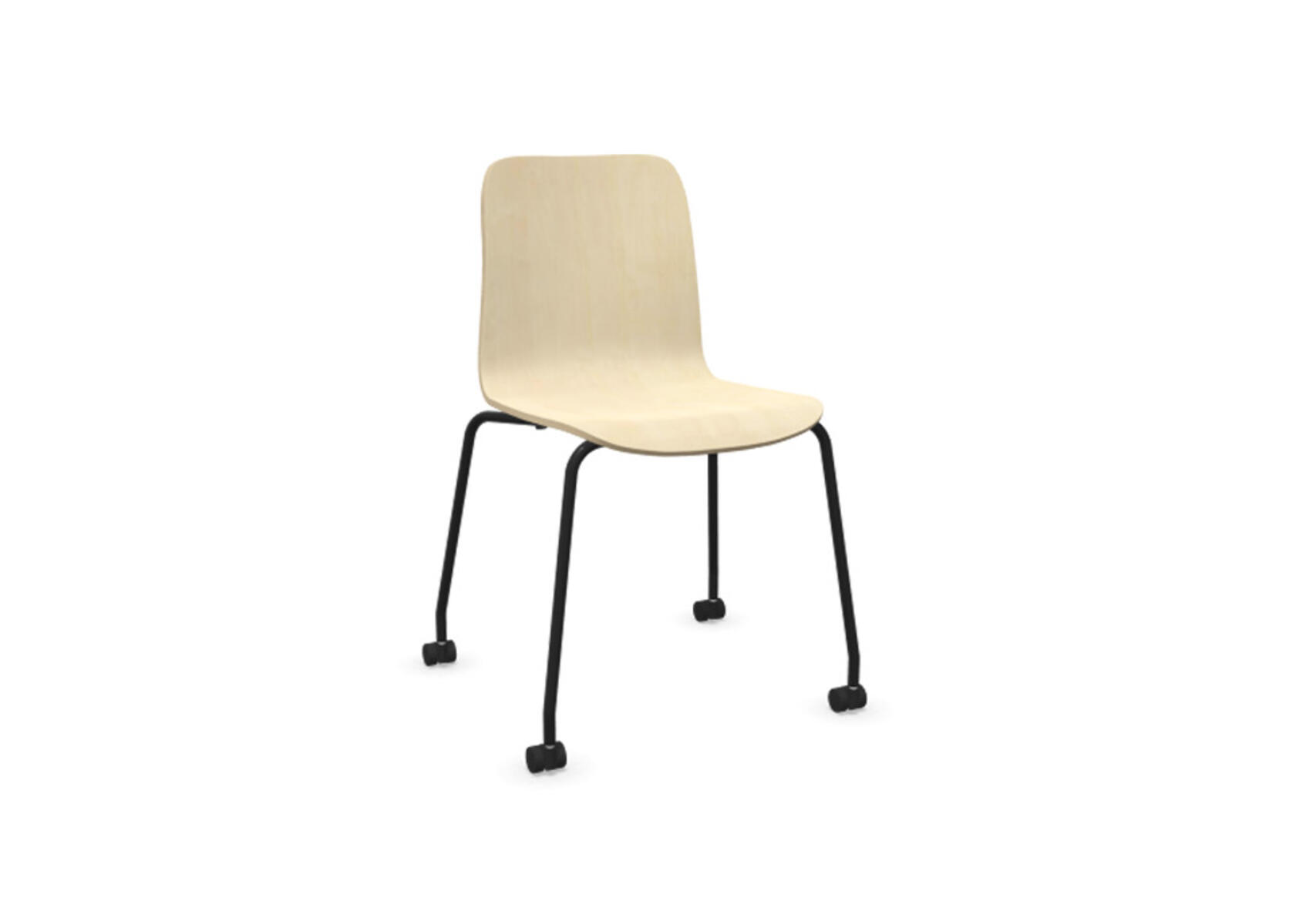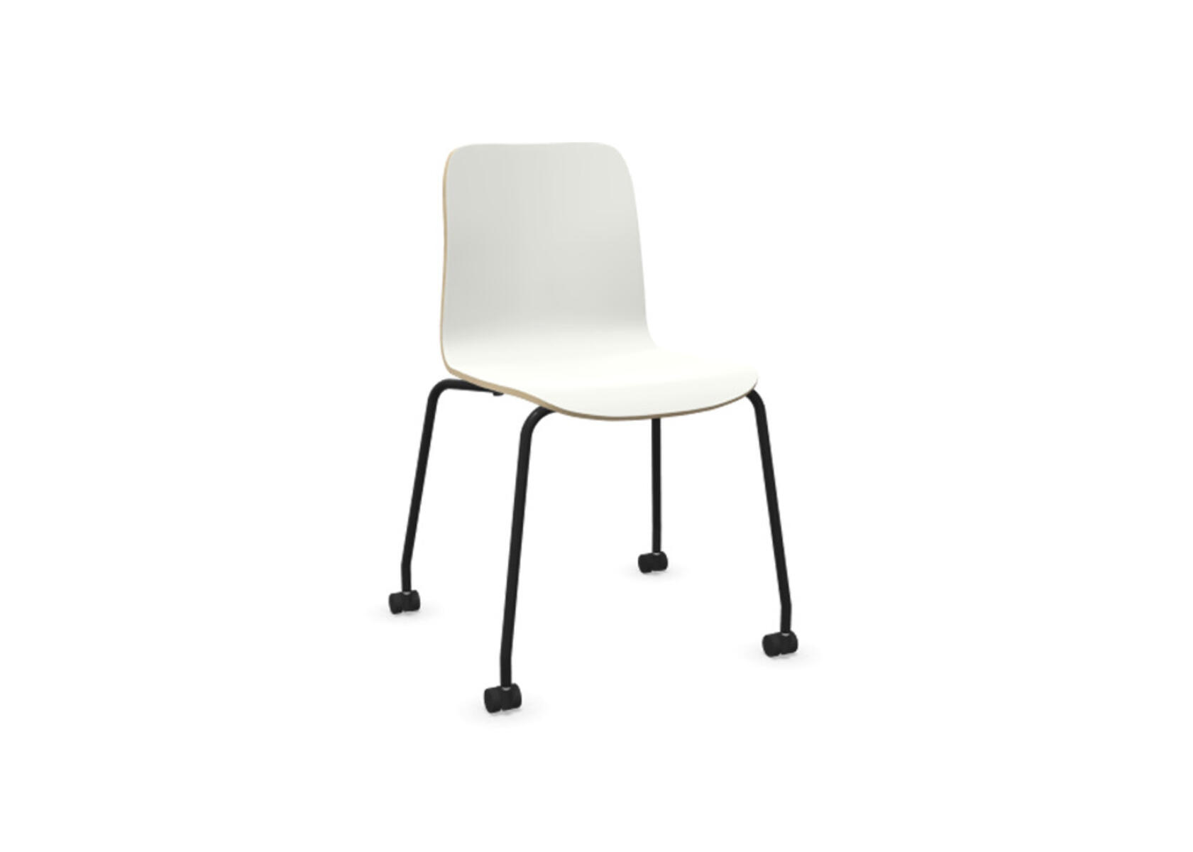 Sædeskål i formpresset krydsfinér med overflade i højtrykslaminat. Stabilt pulverlakeret 4-krydsstel i Ø18 mm rør med hjul til hårde gulve. Armlæn fås som tilvalg. Maks. belastning 110 kg. Stolen er hverken højdejusterbar eller drejbar.