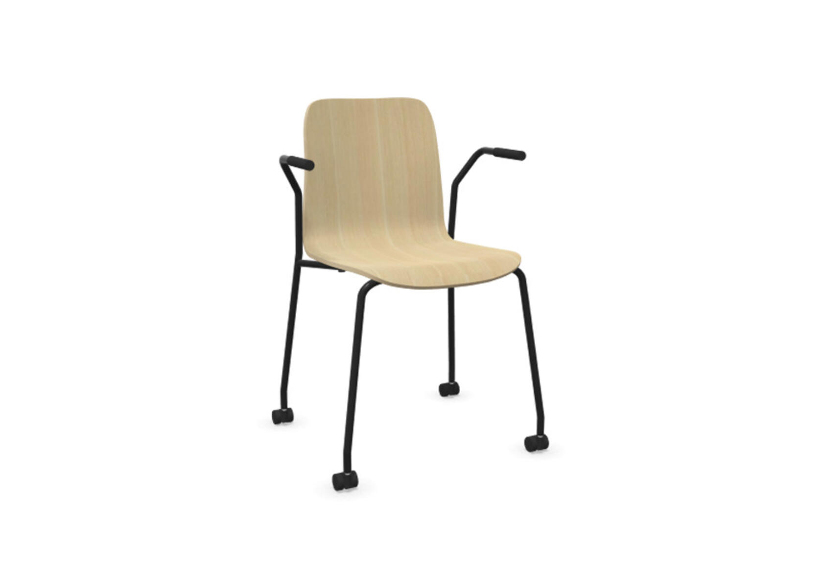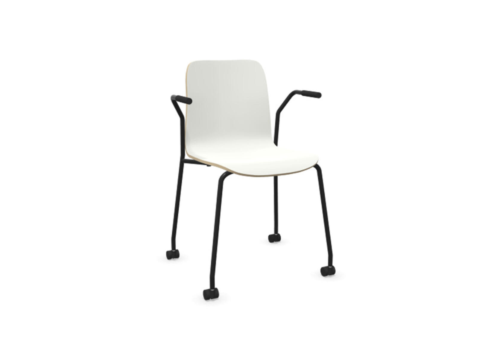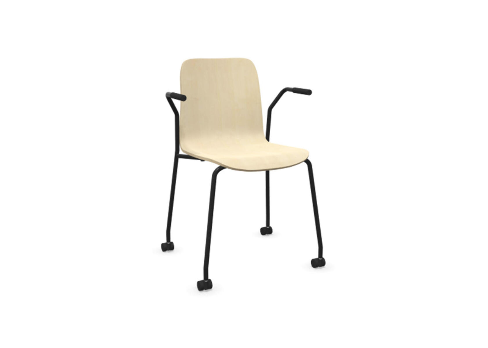 Sædeskål i formpresset krydsfinér med overflade i højtrykslaminat. Stabilt pulverlakeret 4-krydsstel i Ø18 mm rør med hjul til hårde gulve. Armlæn fås som tilvalg. Maks. belastning 110 kg. Stolen er hverken højdejusterbar eller drejbar.