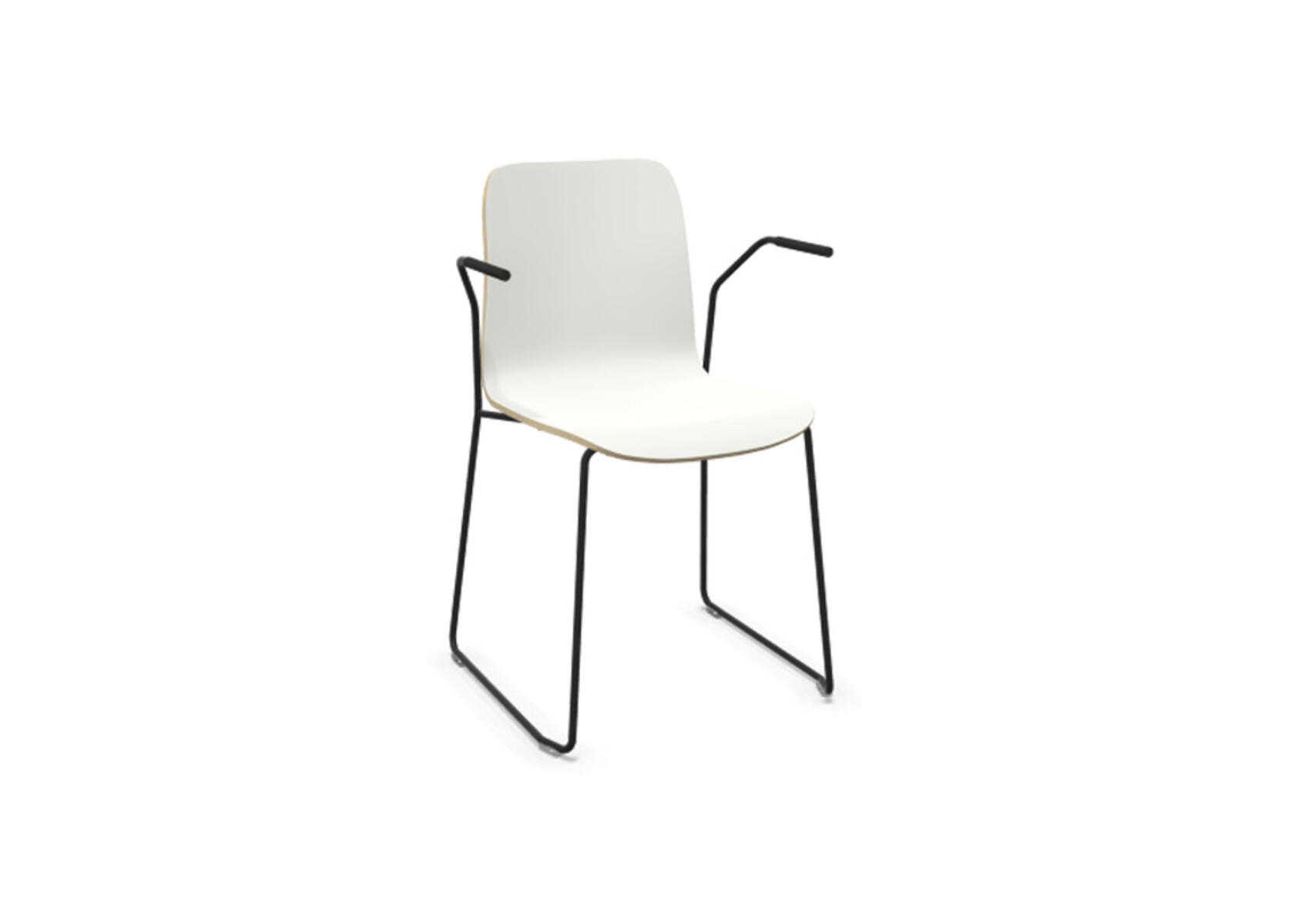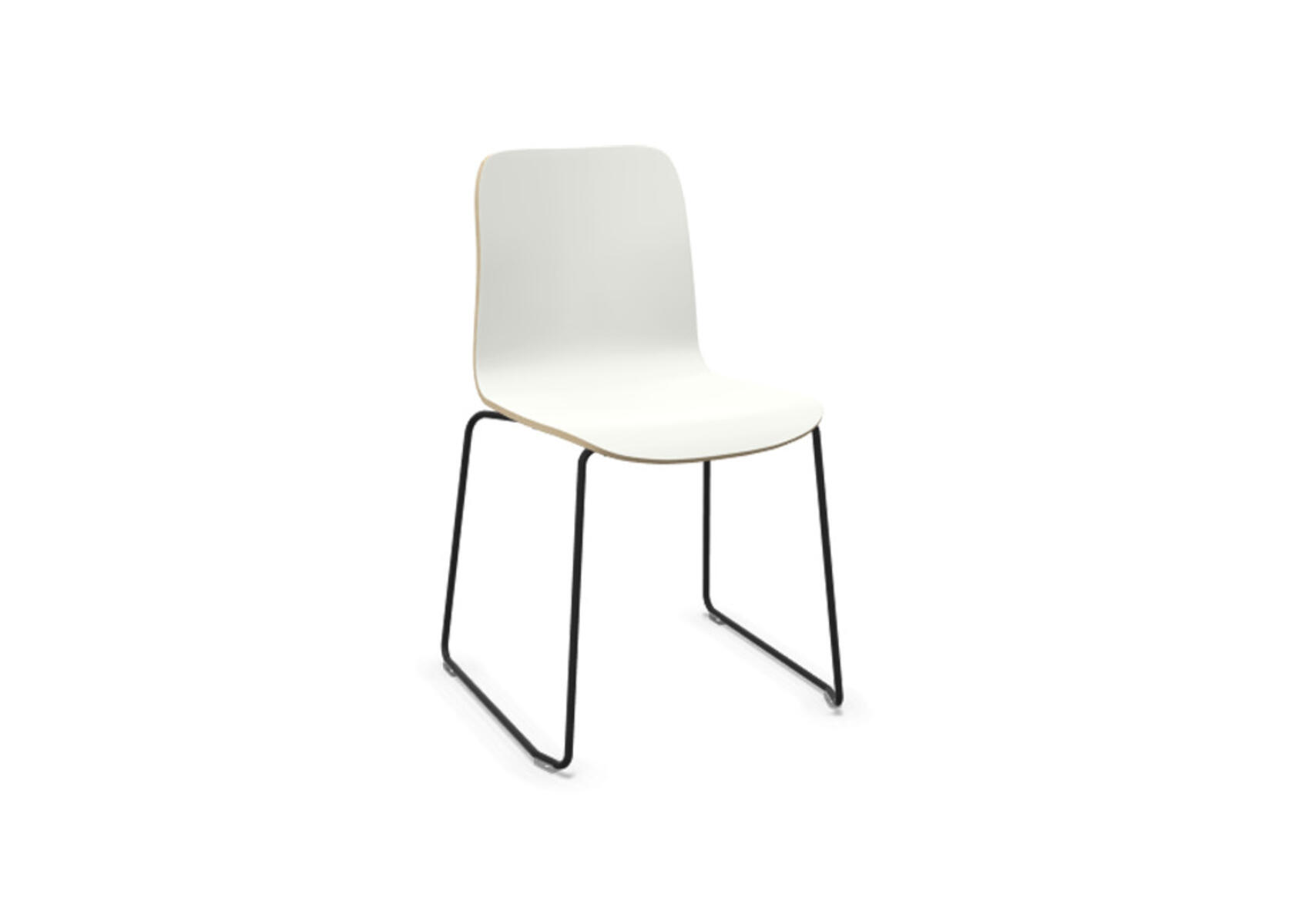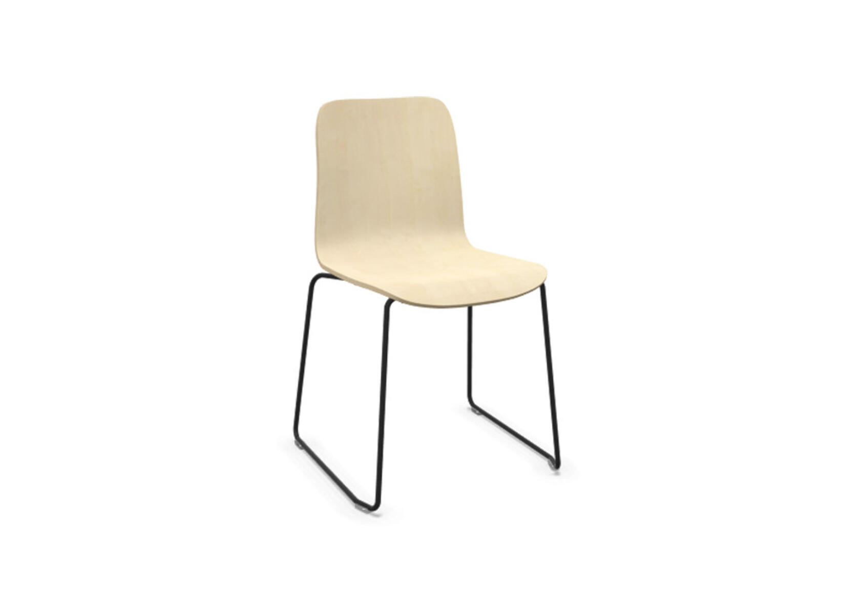 Sædeskål i formpresset krydsfinér belagt med højtrykslaminat. Stabilt pulverlakeret stel i Ø12 mm rør med møbelglidere, der beskytter gulvet. Armlæn fås som tilbehør. Maks. belastning 110 kg. Stolen kan stables op til 6 stk.