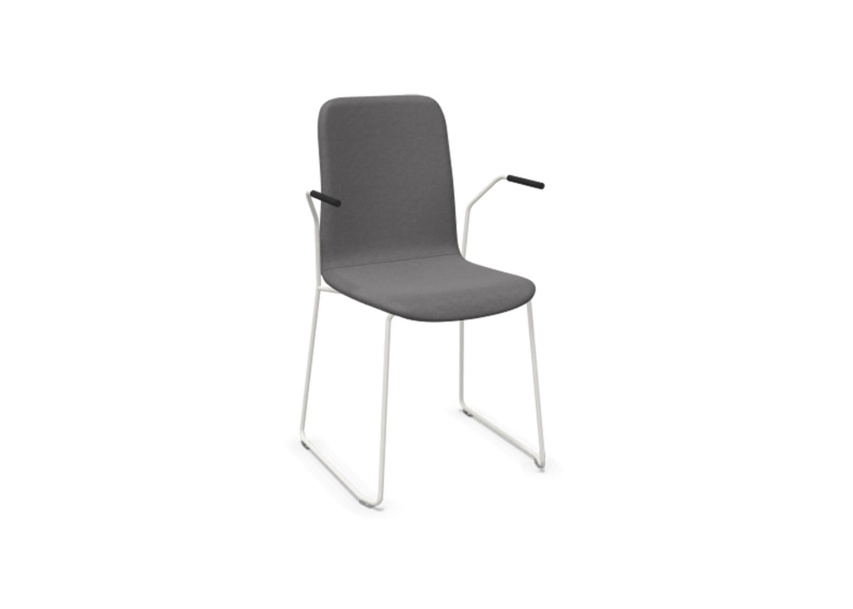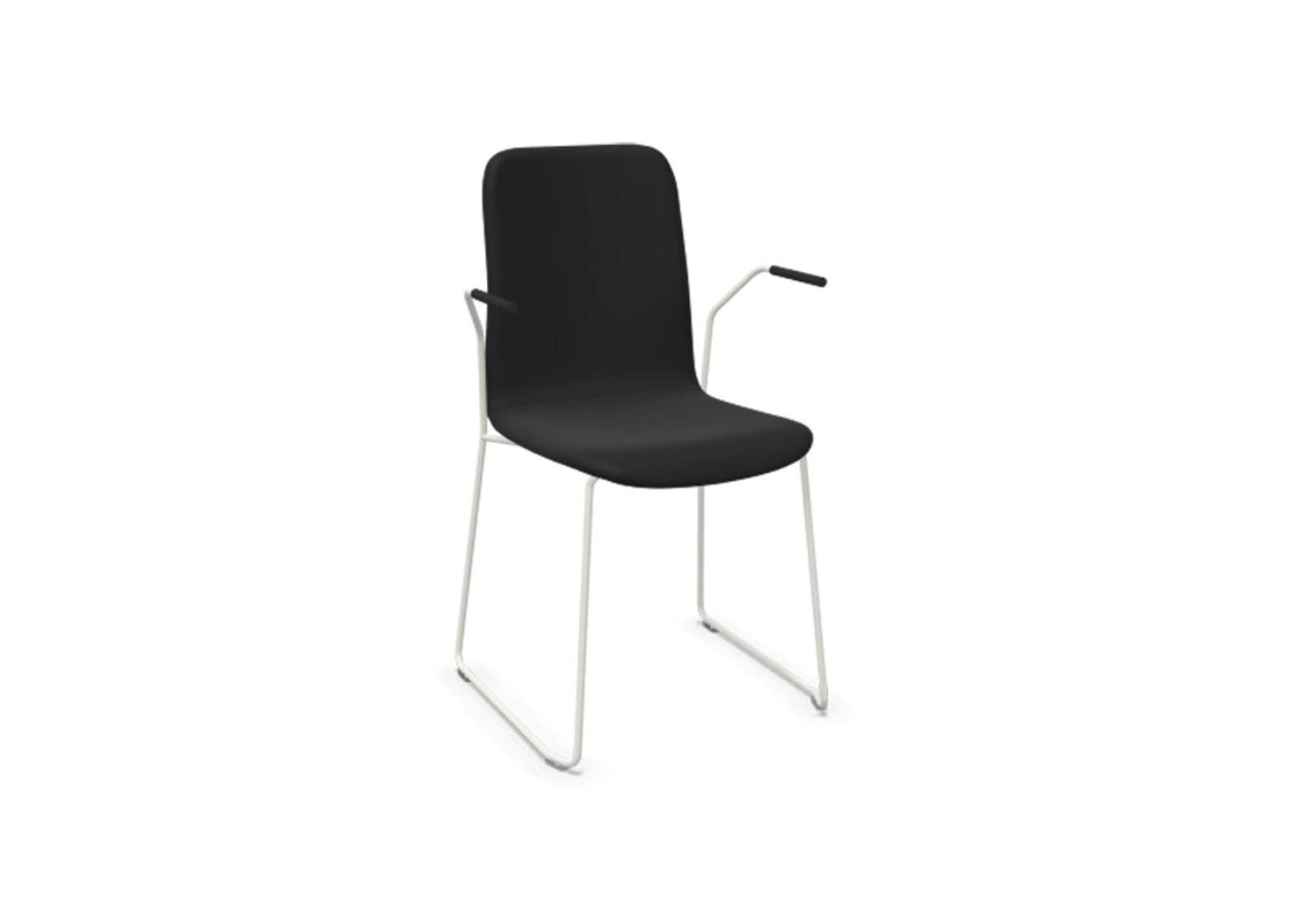 Sædeskål i formpresset krydsfinér polstret med koldskum, som giver både komfort og støtte. Stabilt pulverlakeret stel i Ø18 mm rør med møbelglidere, der beskytter gulvet. Armlæn fås som tilbehør. Maks. belastning 110 kg. Stolen kan stables op til 6 stk.