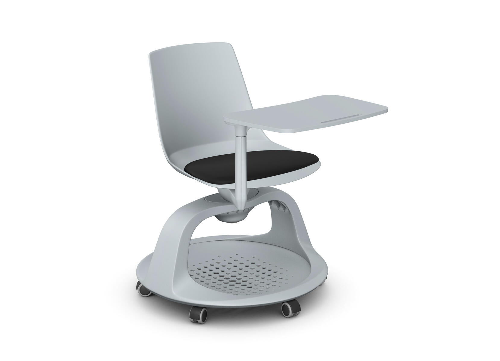 En praktisk drejestol på hjul med mulighed for opbevaring under og en praktisk skriveplade. Stolen er perfekt til konferencer eller skolemiljøer. Højde op til bord fra gulv: 69,6 cm. Afstand mellem sæde og skriveplade: 23 cm. Stolen fås også med polstret sæde i stof Evert TKE-001 som tilvalg.