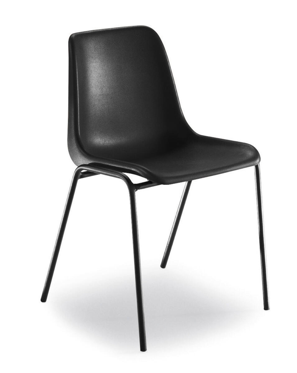 Plaststol med mange anvendelsesmuligheder på skolen. Stabelbar. Sæde og ryg i slidstærkt polypropylenplast. Sort plast og sort stel. Siddehøjde 45 cm, dybde 50 cm, bredde 50 cm. Vejer kun 2,5 kg.