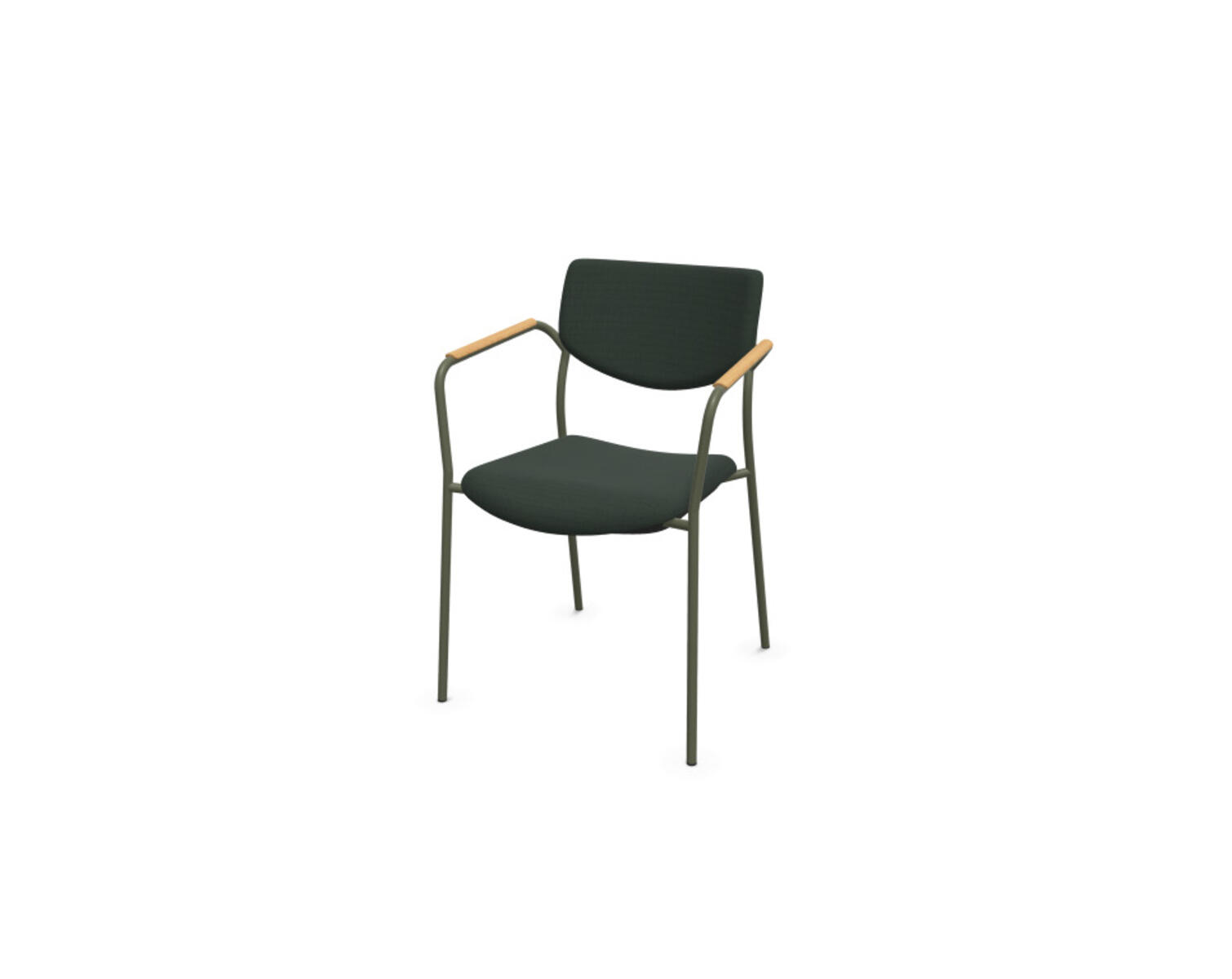 Stel i pulverlakeret metal. Sæde og ryg er betrukket med Cura, et alsidigt, tofarvet meleret møbelstof fremstillet af 100 % genanvendt polyester.