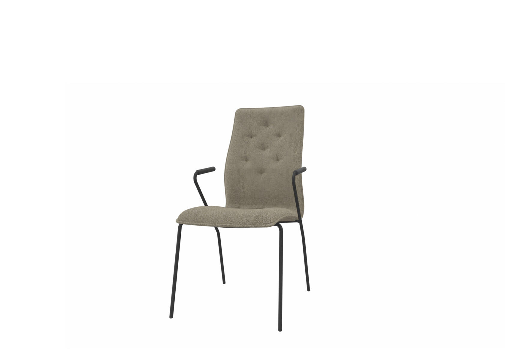En tidløs, ergonomisk og komfortabel stol med høj, pikeret ryg og et sæde i formpresset finér med koldskumspolstring, som giver både støtte og god siddekomfort. Stolen har et stabilt, pulverlakeret medestel i Ø19 mm rør med filtbelagte møbelglidere, der skåner gulvet. Stolen kan stables i op til 5 stk. Armstøtte fås som tilvalg.