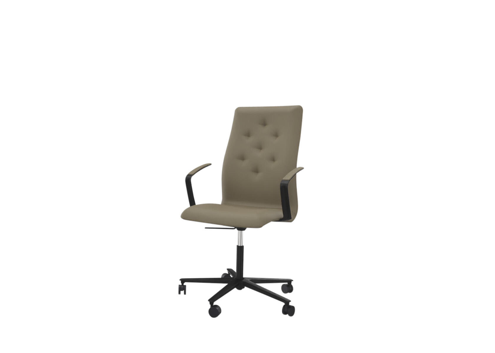 En tidløs, ergonomisk og komfortabel stol med høj ryg og pikeret syning i ryglænet, som giver et stilrent og behageligt udtryk. Sædet er lavet i formpresset finér med koldskumspolstring for optimal komfort. Stolen har en vippefunktion på 7° bagud og 4° fremad. Den leveres med et sort metalkryds og 5 hårde hjul, som er velegnet til bløde gulve. Armstøtter fås som tilvalg.