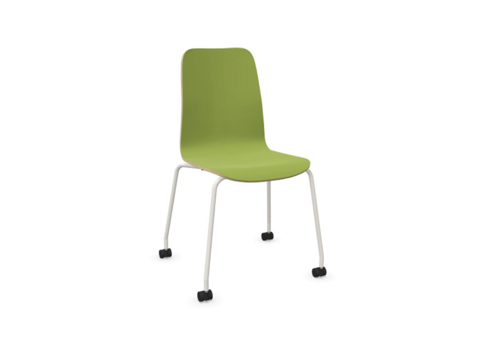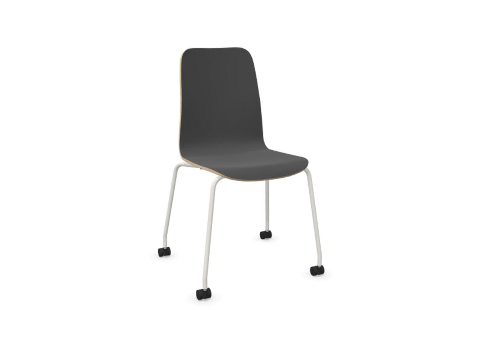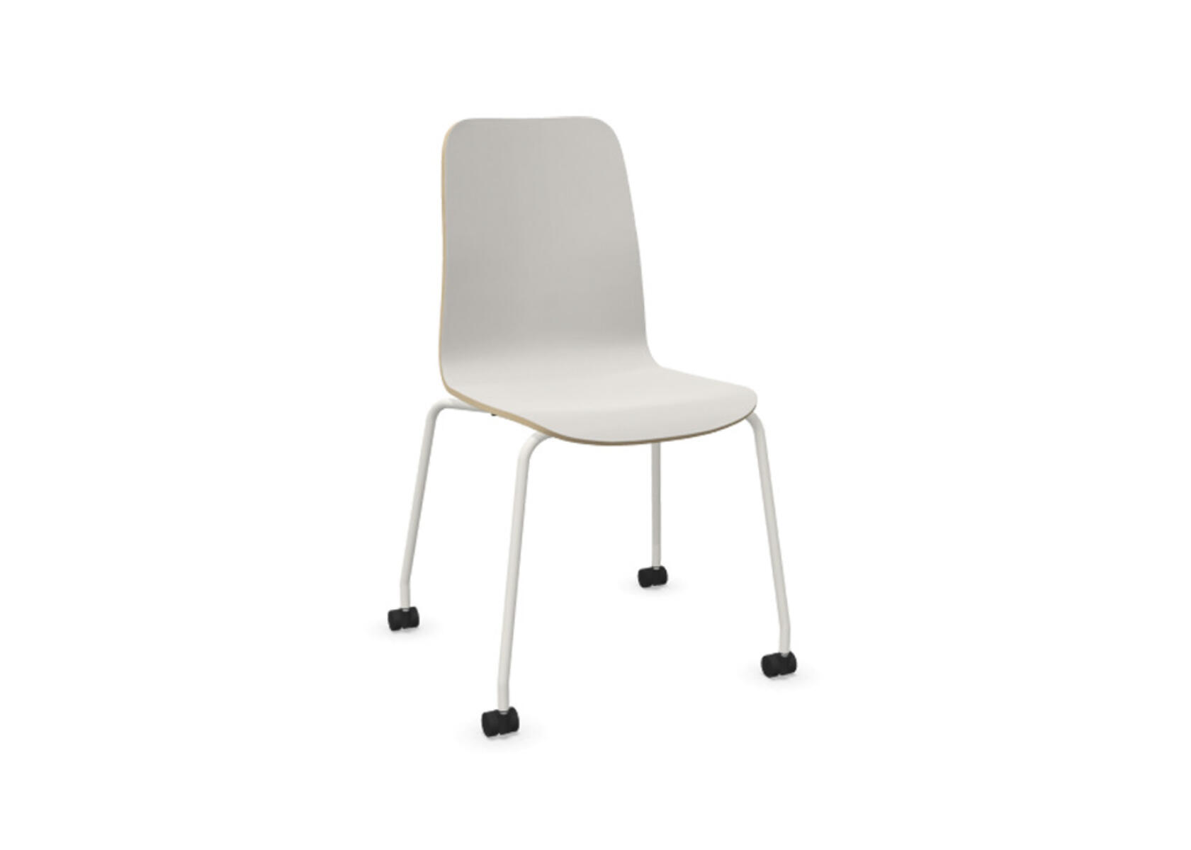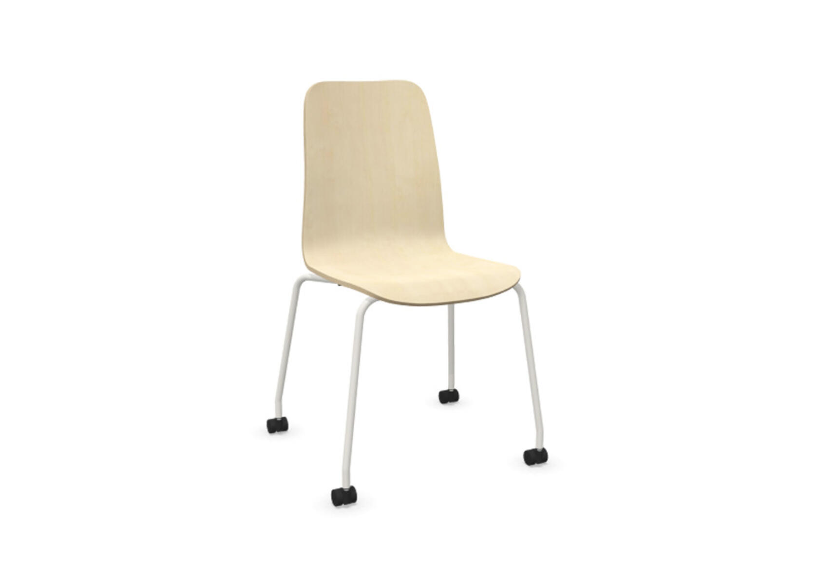 Sædeskål i formpresset krydsfinér med slidstærkt højtrykslaminat. Stabilt pulverlakeret 4-krydsstel i Ø18 mm rør med hjul til hårde gulve. Integreret skriveplade i laminatbelagt krydsfinér, 10,5 mm tyk. Maks. belastning 110 kg. Stolen har drejefunktion, men er ikke højdejusterbar.