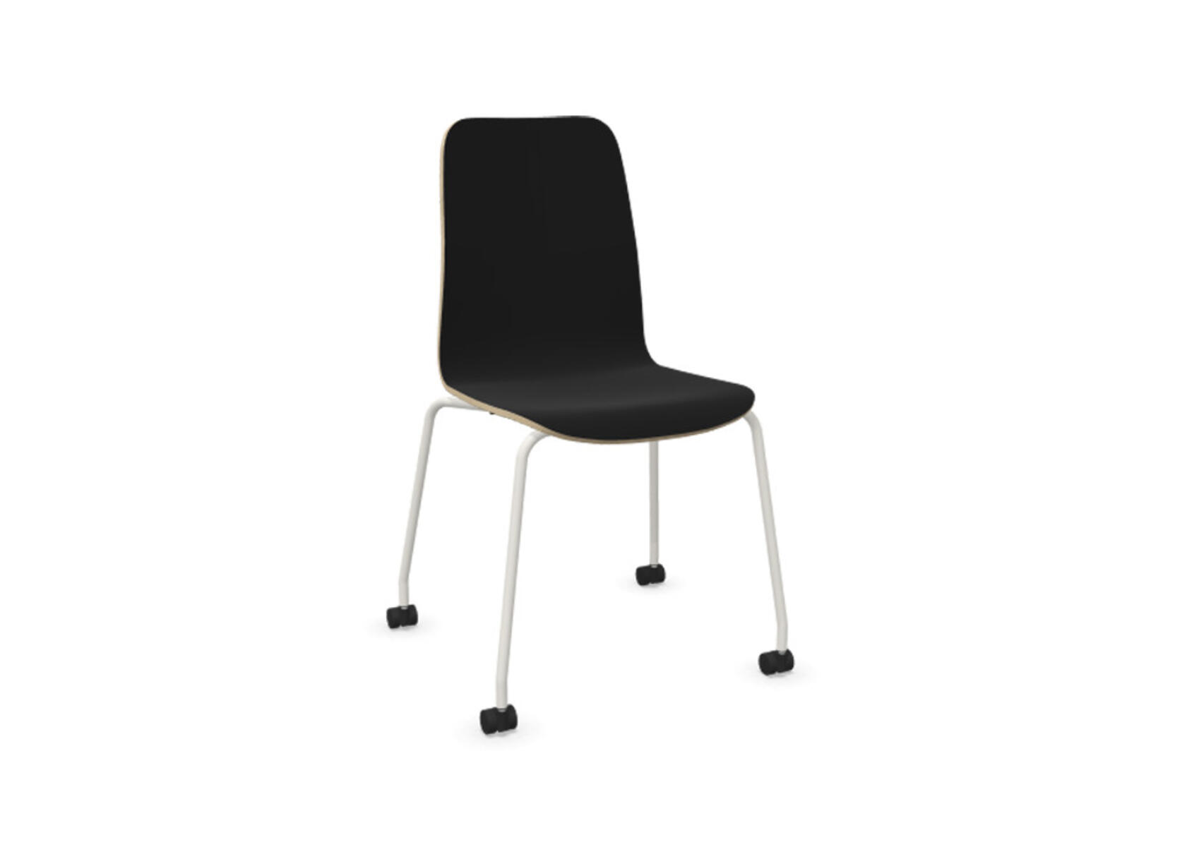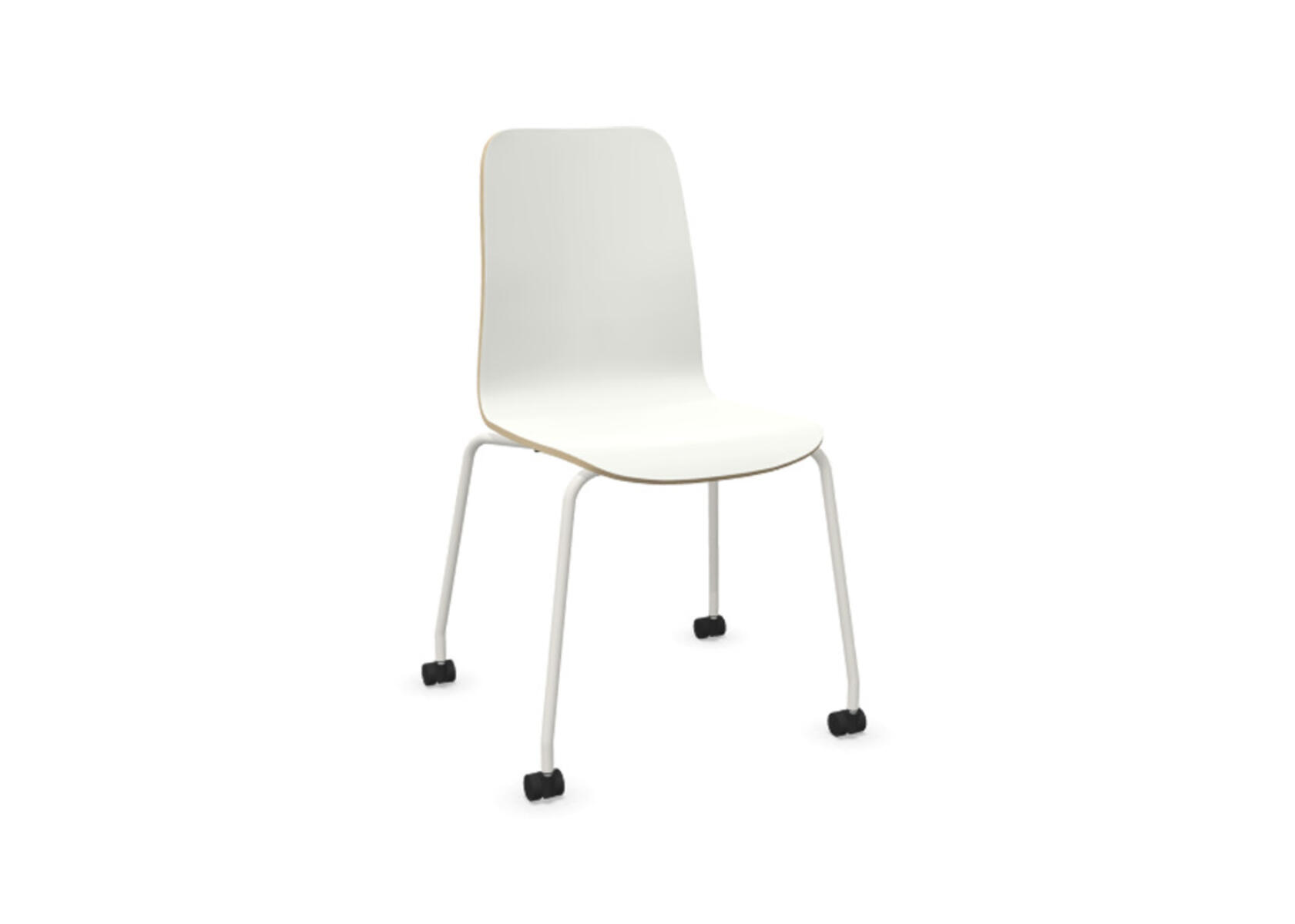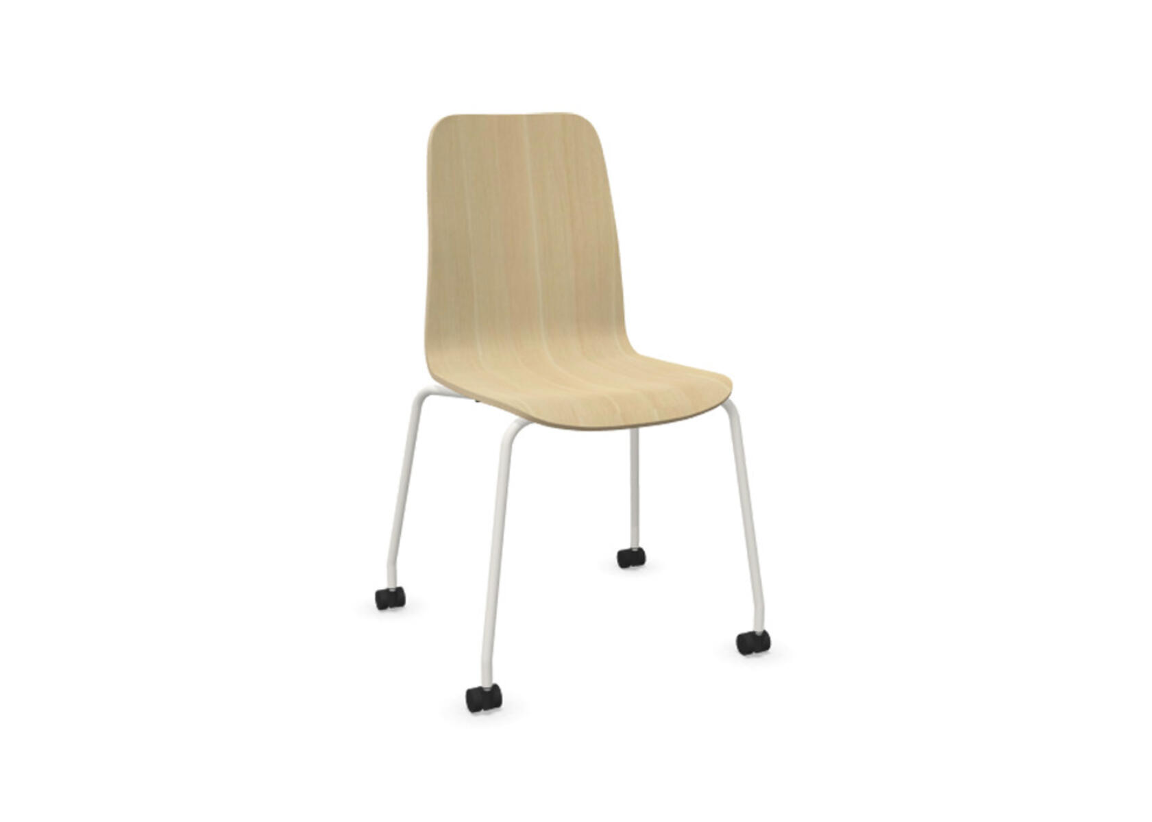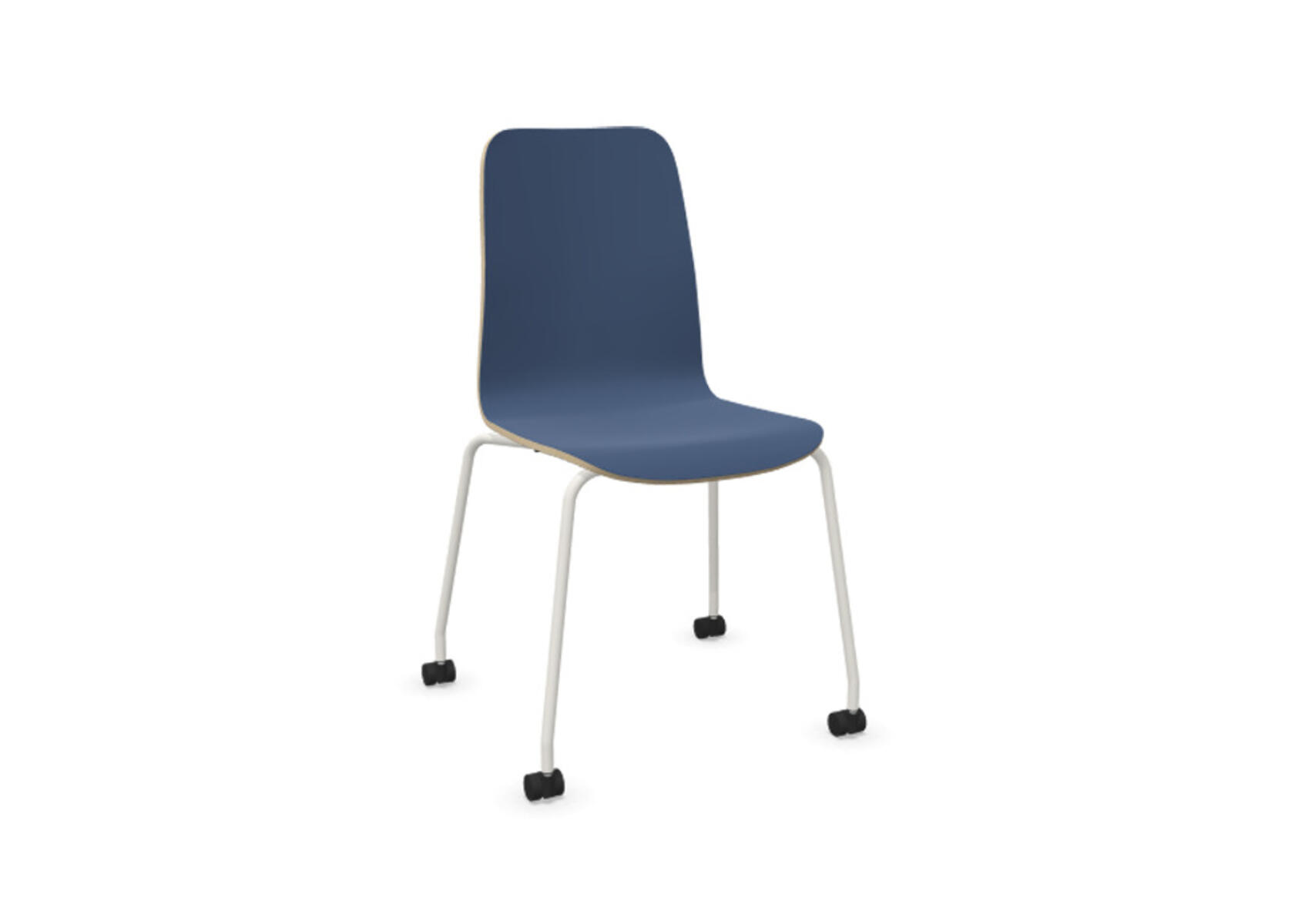 Sædeskål i formpresset krydsfinér med slidstærkt højtrykslaminat. Stabilt pulverlakeret 4-krydsstel i Ø18 mm rør med hjul til hårde gulve. Integreret skriveplade i laminatbelagt krydsfinér, 10,5 mm tyk. Maks. belastning 110 kg. Stolen har drejefunktion, men er ikke højdejusterbar.