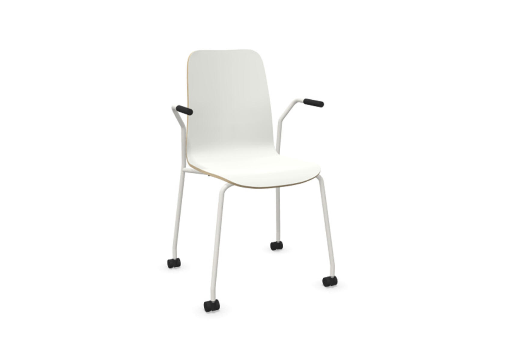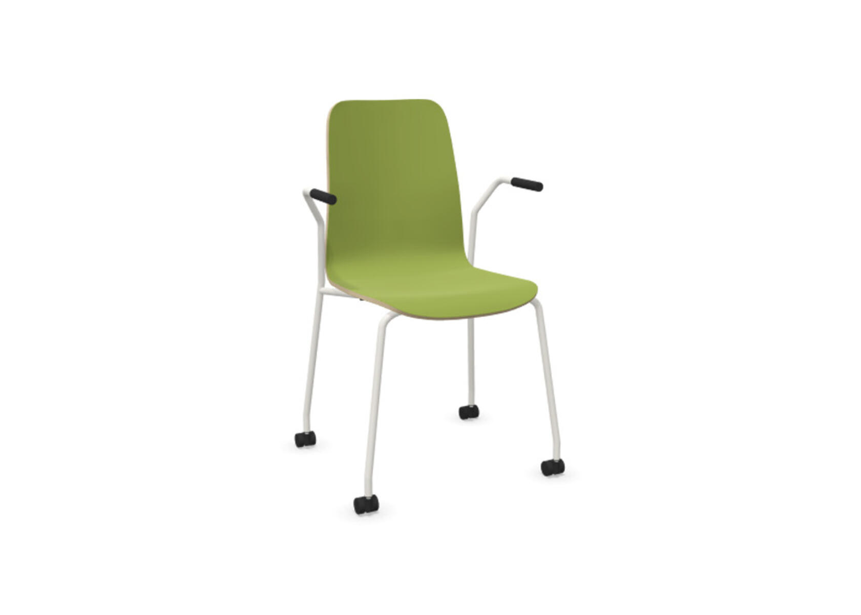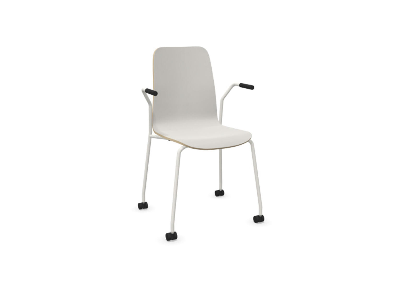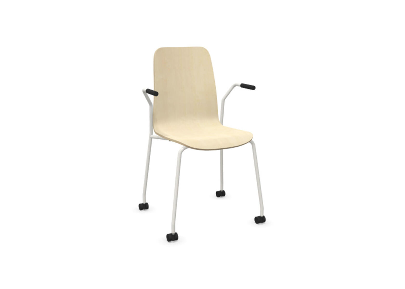 Sædeskål i formpresset krydsfinér belagt med højtrykslaminat. Stabilt pulverlakeret stel i Ø18 mm rør med møbelglidere, der beskytter gulvet. Armlæn fås som tilbehør. Maks. belastning 110 kg. Stolen kan stables op til 6 stk.