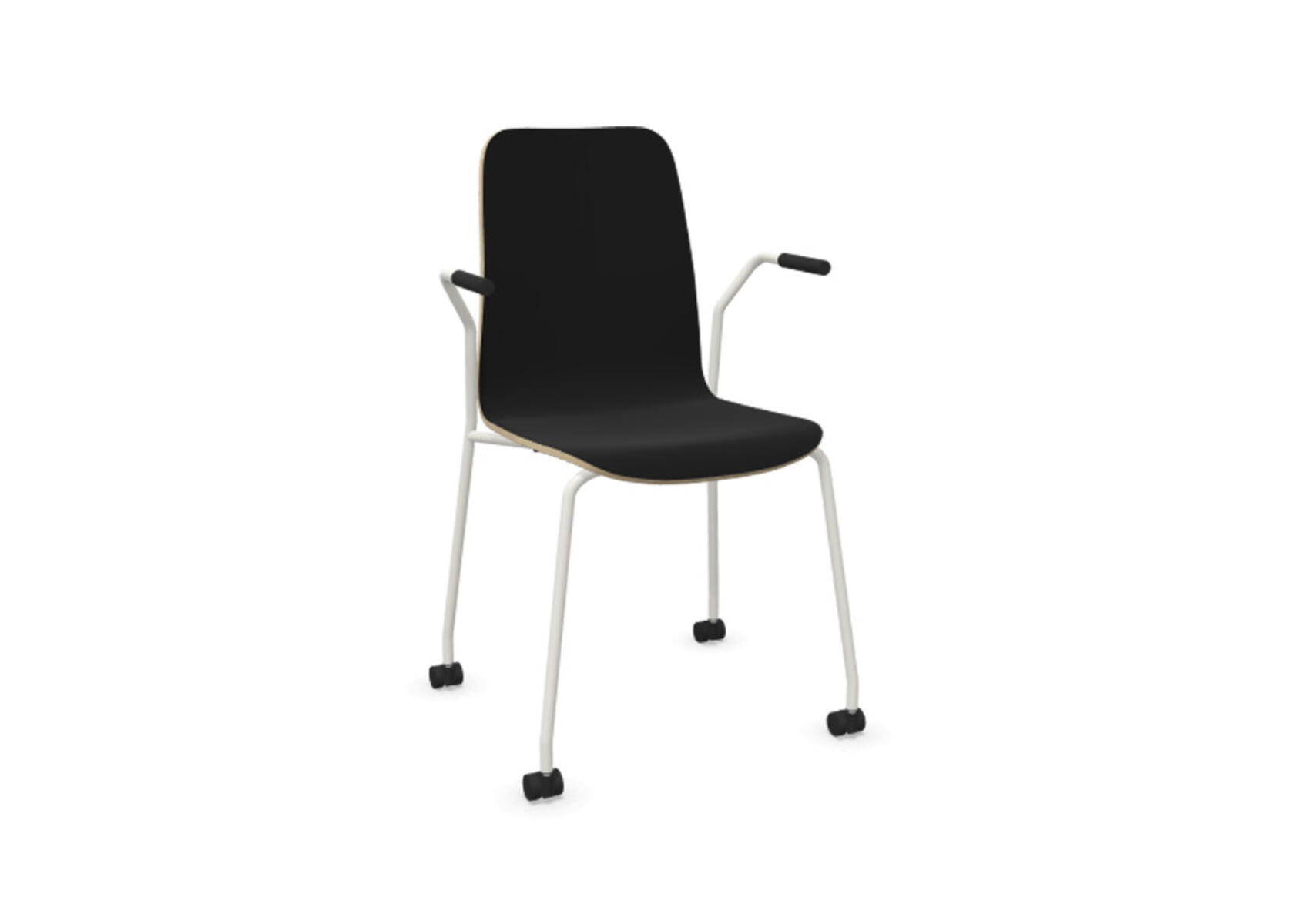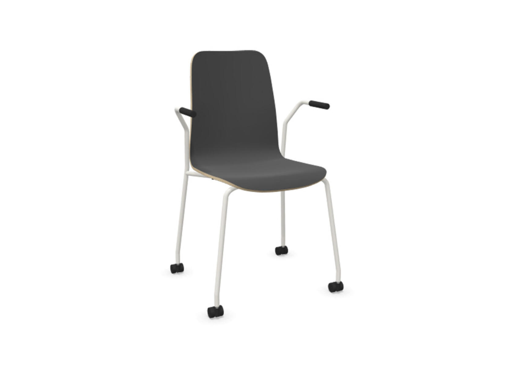 Sædeskål i formpresset krydsfinér belagt med højtrykslaminat. Stabilt pulverlakeret stel i Ø12 mm rør med møbelglidere, der beskytter gulvet. Armlæn fås som tilbehør. Maks. belastning 110 kg. Stolen kan stables op til 6 stk.