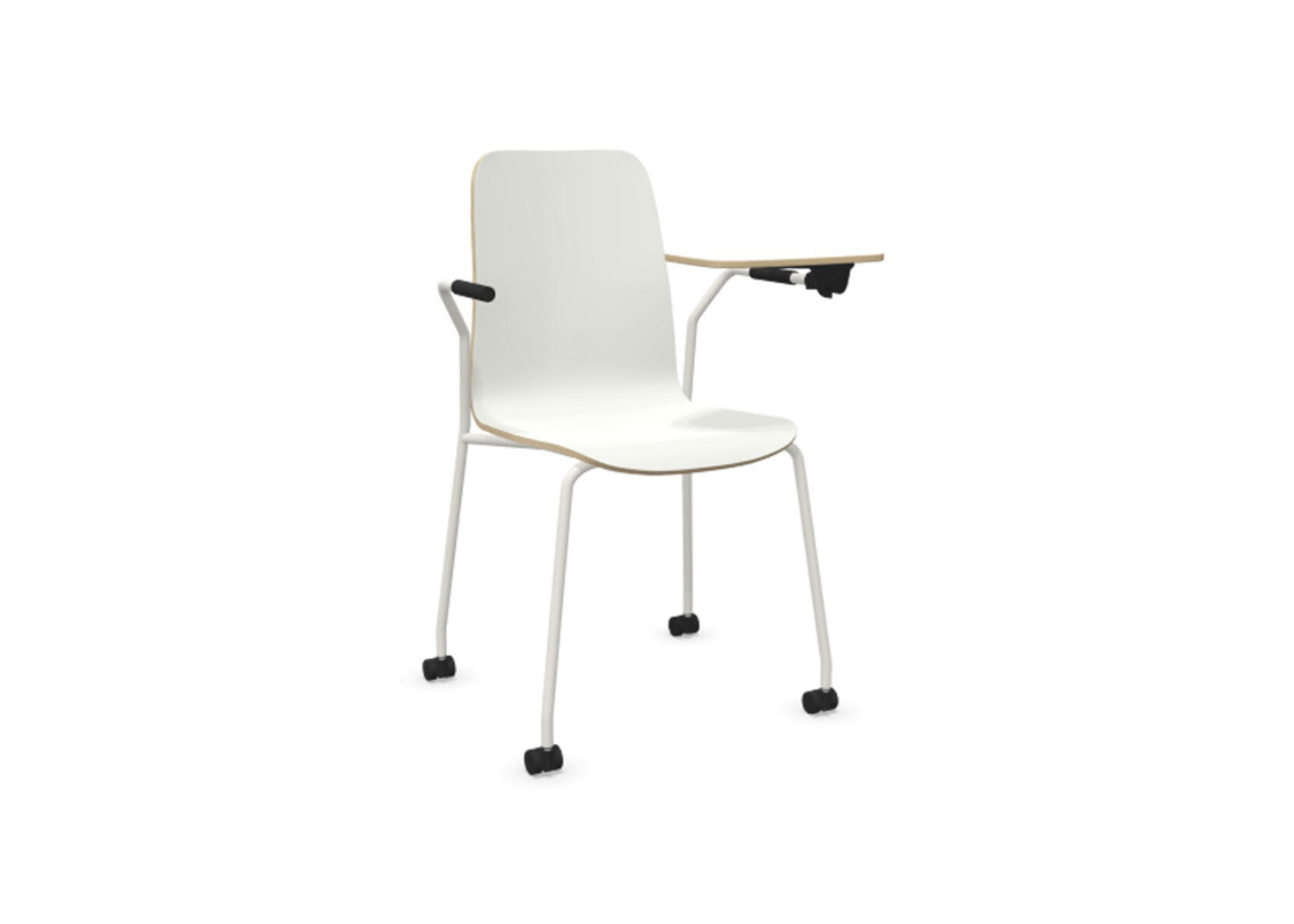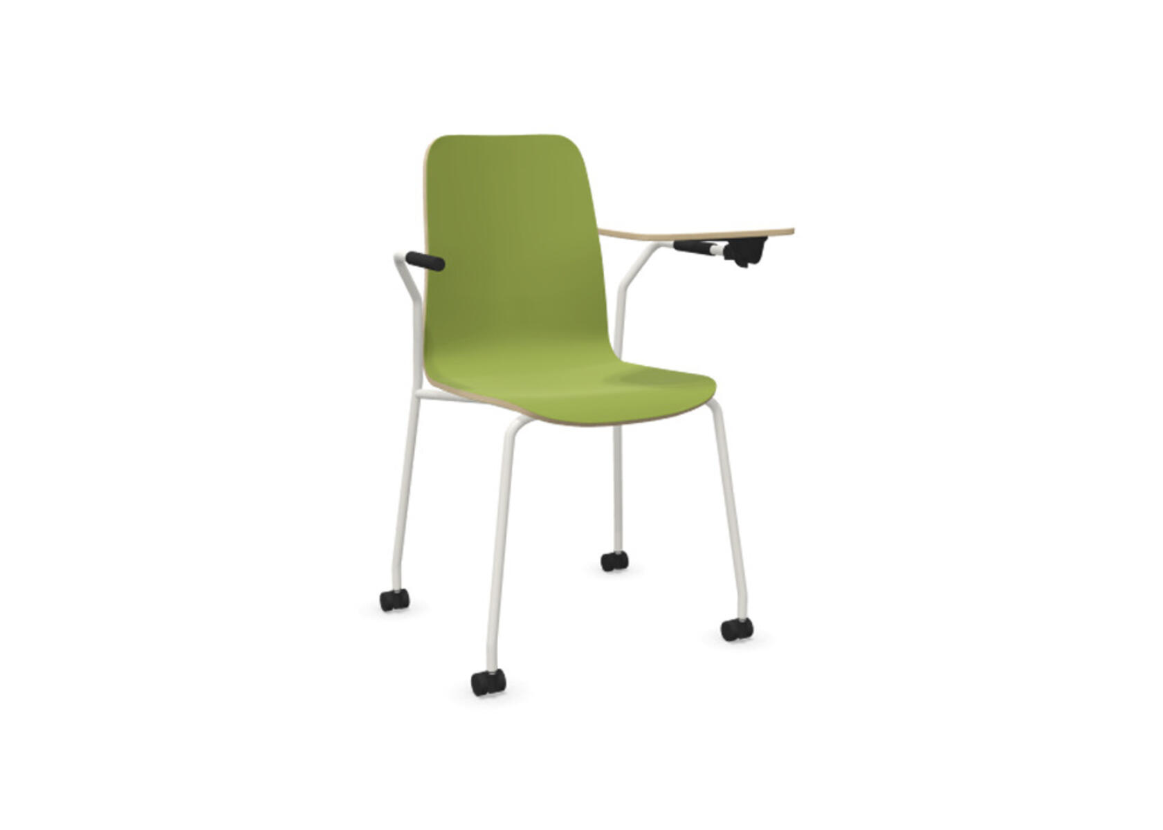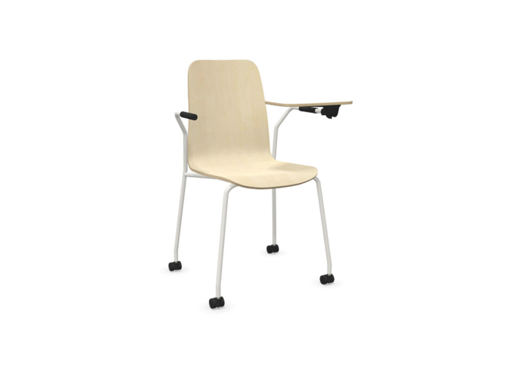 Sædeskål i formpresset krydsfinér belagt med højtrykslaminat. Stabilt pulverlakeret stel i Ø18 mm rør med møbelglidere, der beskytter gulvet. Skriveplade i finér belagt med laminat, 10,5 mm tyk. For ekstra fleksibilitet kan der tilkøbes koblings- og rækkekoblingsbeslag, som gør det nemt at skabe rækker eller gruppesætninger. Maks. belastning 110 kg. Stolen er ikke stabelbar.