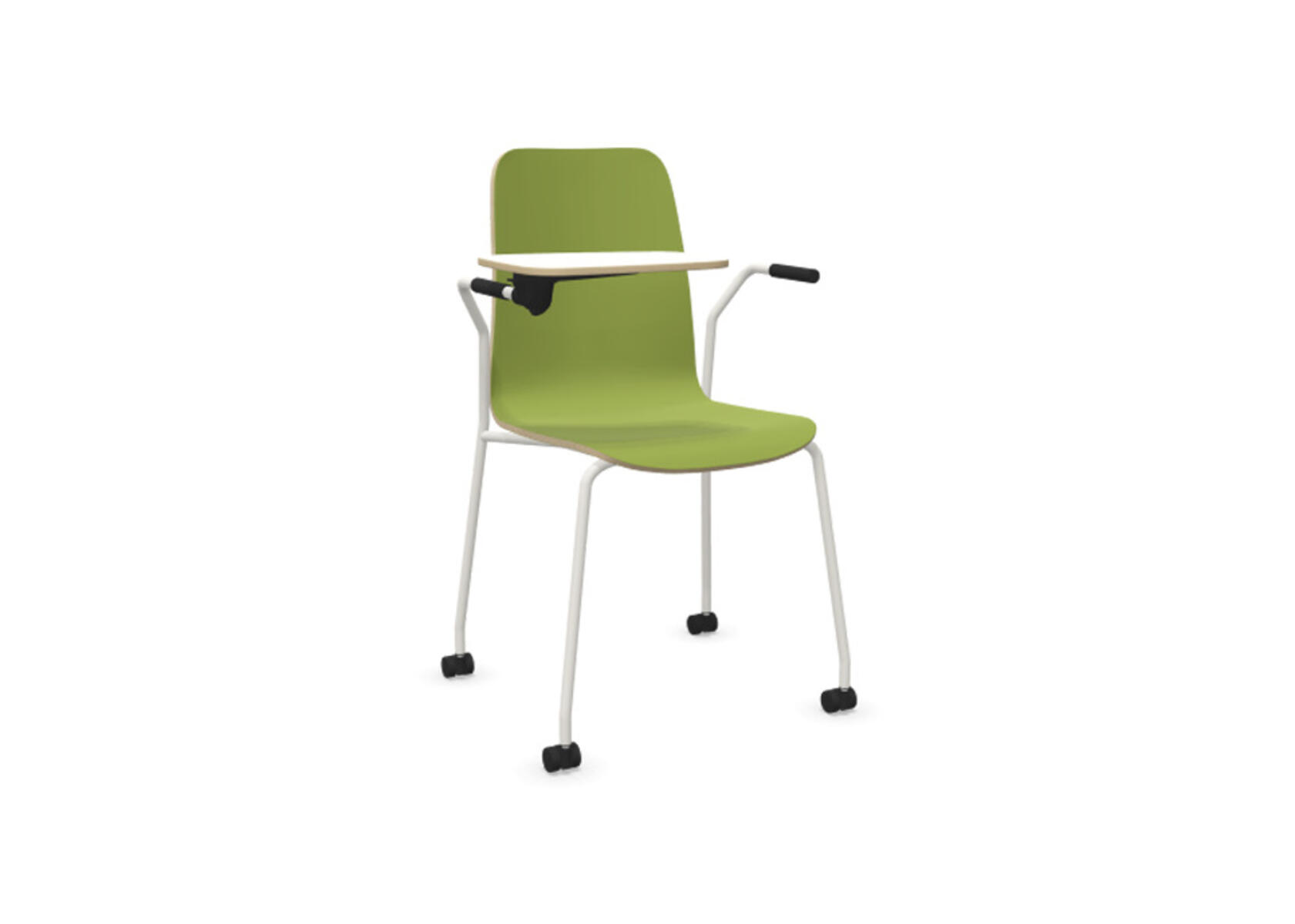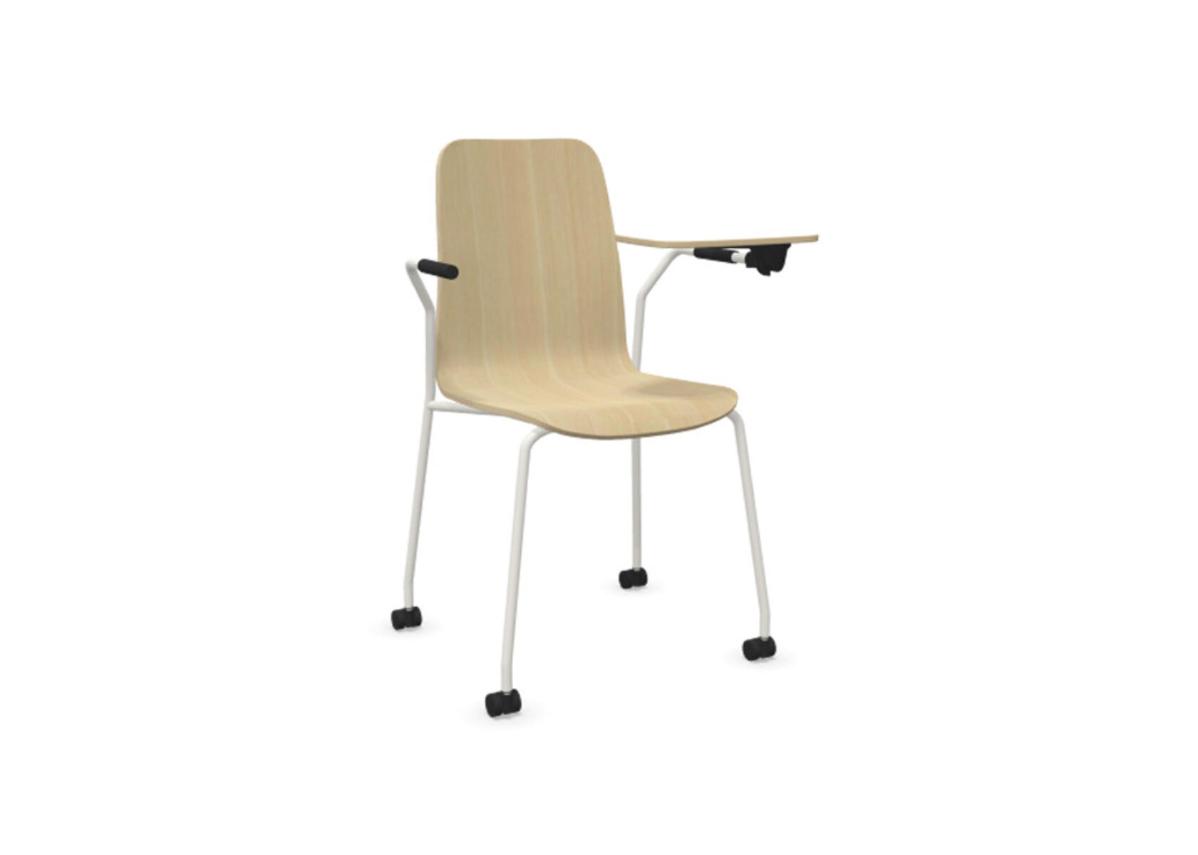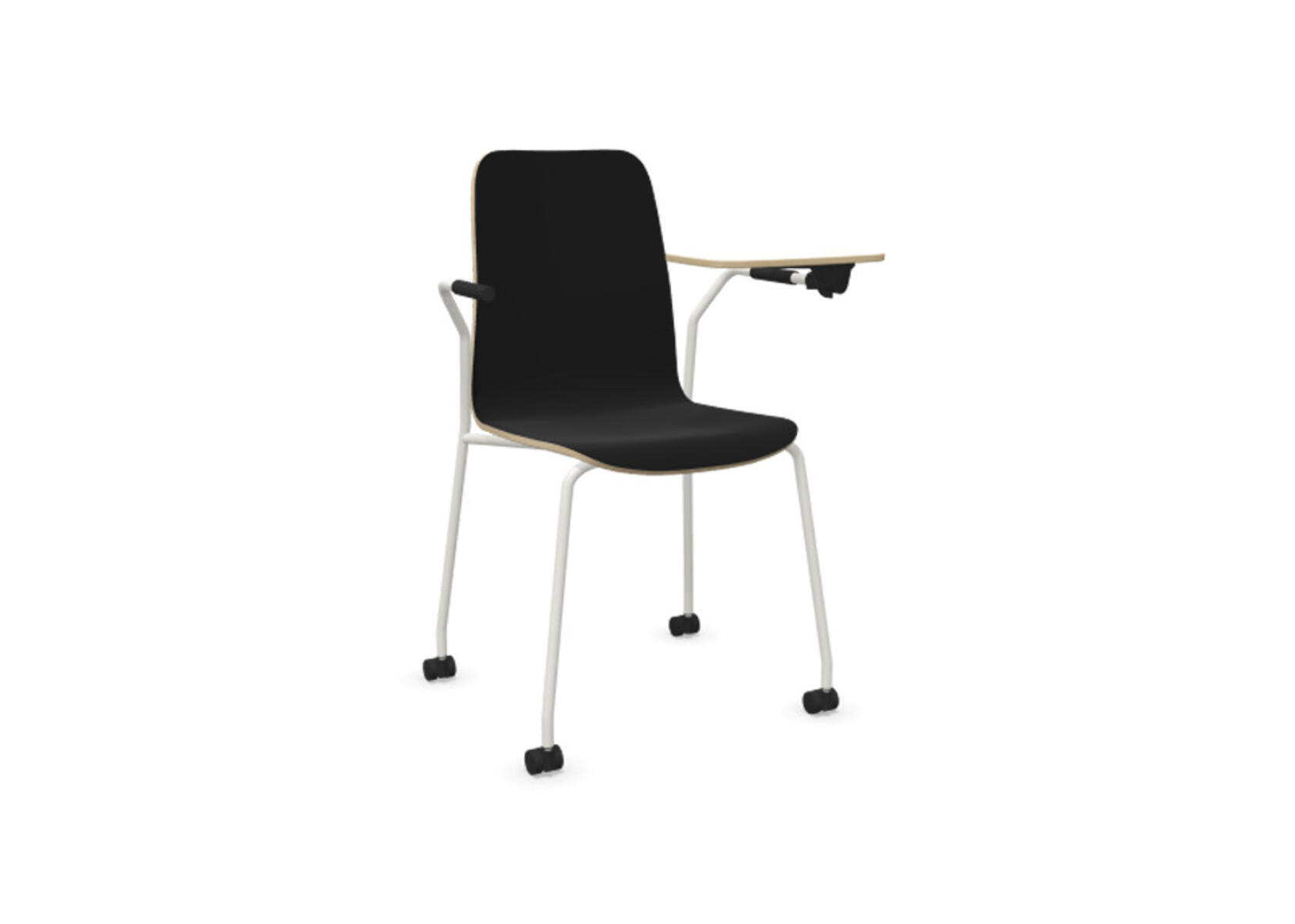 Sædeskål i formpresset krydsfinér belagt med højtrykslaminat. Stabilt pulverlakeret stel i Ø18 mm rør med møbelglidere, der beskytter gulvet. Skriveplade i finér belagt med laminat, 10,5 mm tyk. For ekstra fleksibilitet kan der tilkøbes koblings- og rækkekoblingsbeslag, som gør det nemt at skabe rækker eller gruppesætninger. Maks. belastning 110 kg. Stolen er ikke stabelbar.