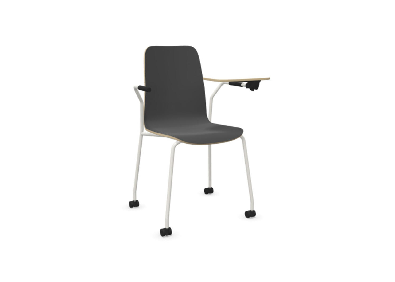 Sædeskål i formpresset krydsfinér belagt med højtrykslaminat. Stabilt pulverlakeret stel i Ø18 mm rør med møbelglidere, der beskytter gulvet. Skriveplade i finér belagt med laminat, 10,5 mm tyk. Maks. belastning 110 kg. Stolen er ikke stabelbar.