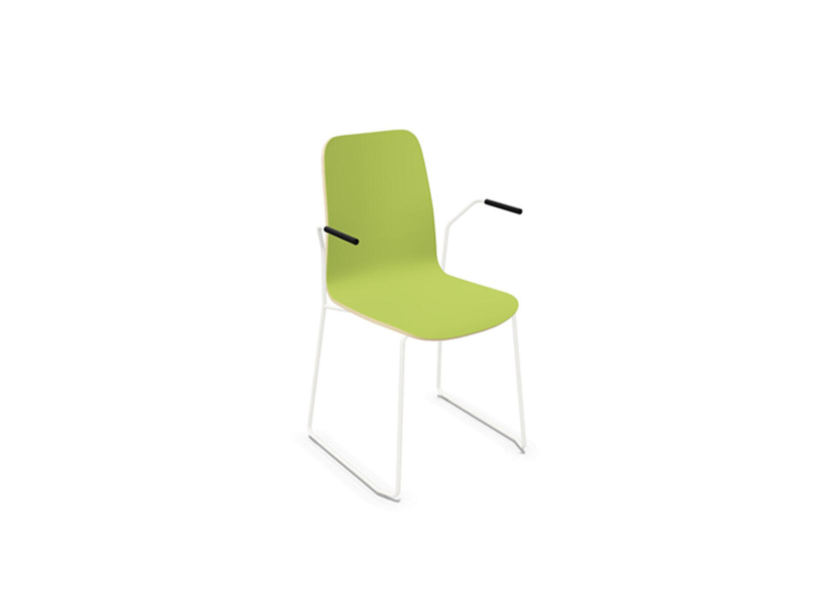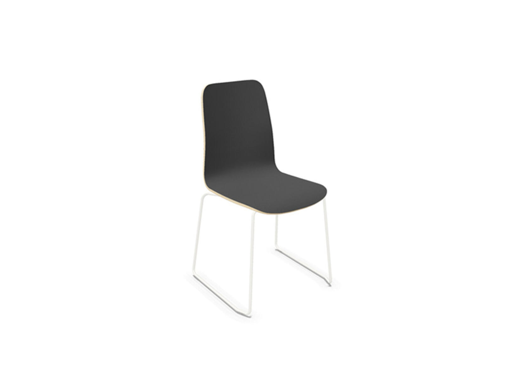 Sædeskål i formpresset krydsfinér belagt med højtrykslaminat. Stabilt pulverlakeret stel i Ø12 mm rør med møbelglidere, der beskytter gulvet. Armlæn fås som tilbehør. Maks. belastning 110 kg. Stolen kan stables op til 6 stk.