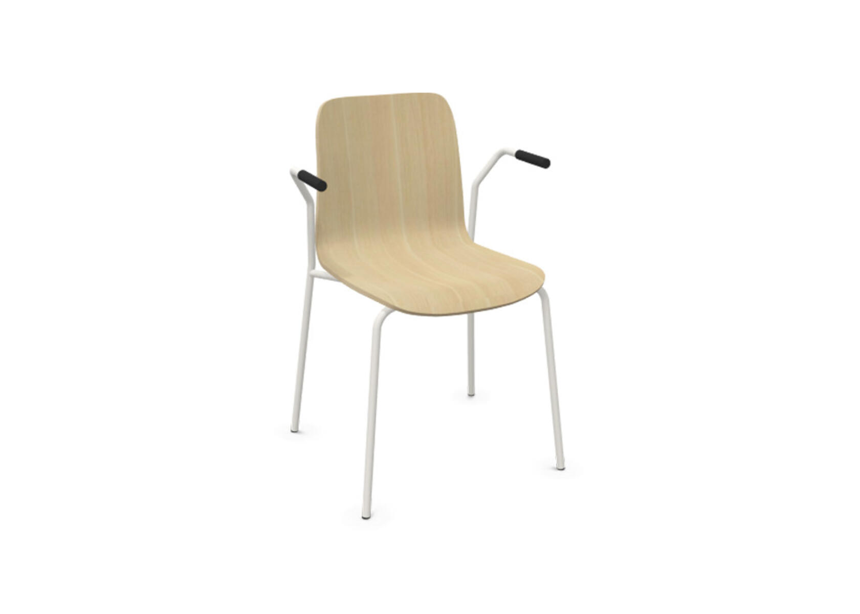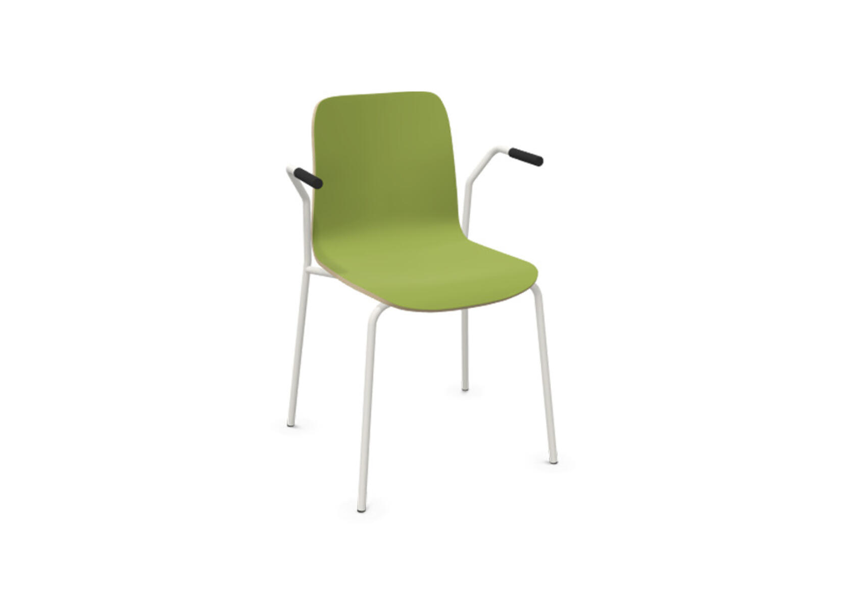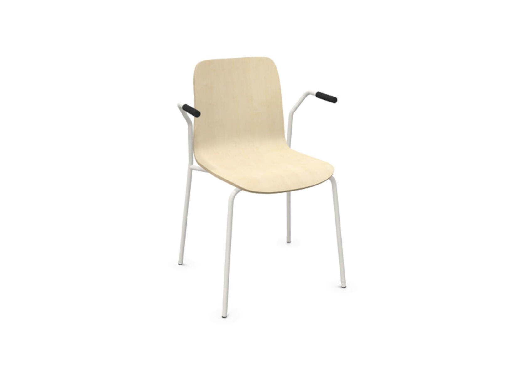 Sædeskål i formpresset krydsfinér belagt med højtrykslaminat. Stabilt pulverlakeret stel i Ø18 mm rør med møbelglidere, der beskytter gulvet. Armlæn fås som tilbehør. For ekstra fleksibilitet kan der tilkøbes koblings- og rækkekoblingsbeslag, som gør det nemt at skabe rækker eller gruppesætninger. Maks. belastning 110 kg. Stolen kan stables op til 6 stk.