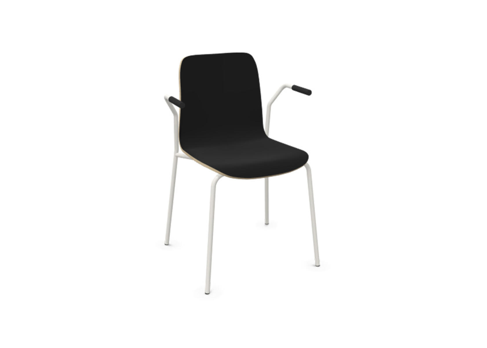 Sædeskål i formpresset krydsfinér polstret med koldskum, som giver både komfort og støtte. Stabilt pulverlakeret stel i Ø18 mm rør med møbelglidere, der beskytter gulvet. Armlæn fås som tilbehør. For ekstra fleksibilitet kan der tilkøbes koblings- og rækkekoblingsbeslag, som gør det nemt at skabe rækker eller gruppesætninger. Maks. belastning 110 kg. Stolen kan stables op til 6 stk.
