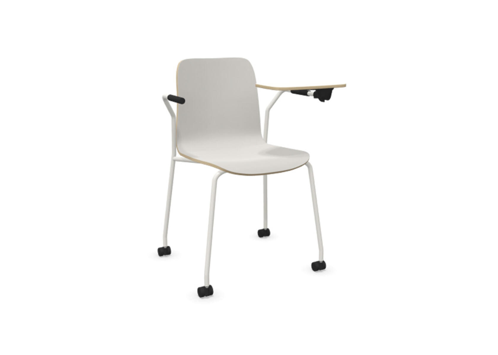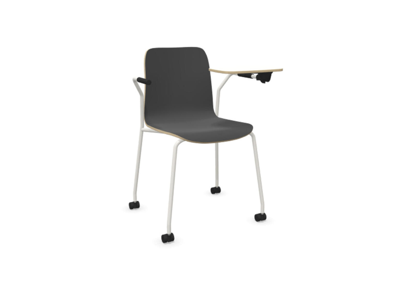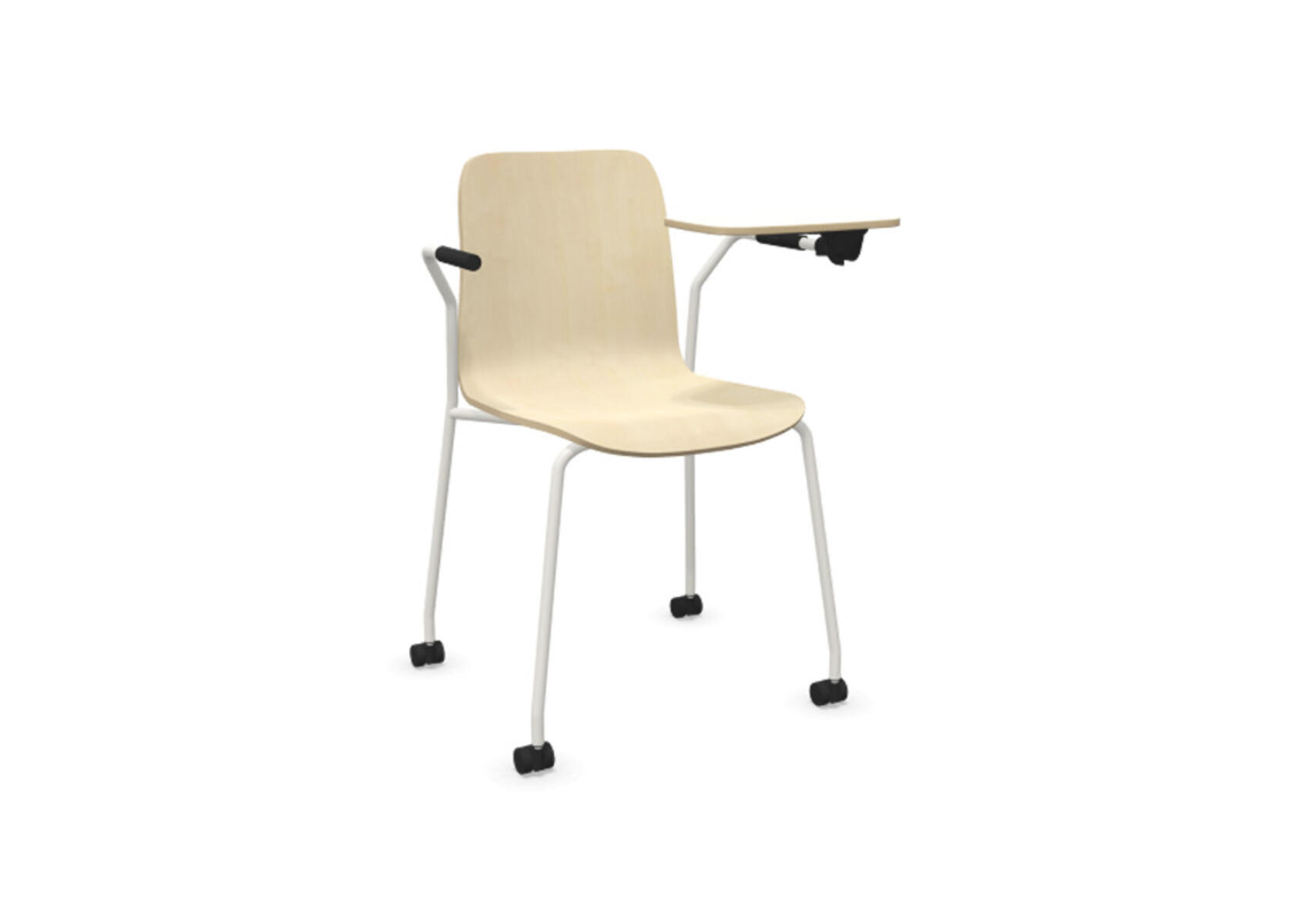 Sædeskål i formpresset krydsfinér belagt med højtrykslaminat. Stabilt pulverlakeret stel i Ø18 mm rør med møbelglidere, der beskytter gulvet. Skriveplade i finér belagt med laminat, 10,5 mm tyk. Maks. belastning 110 kg. Stolen er ikke stabelbar.