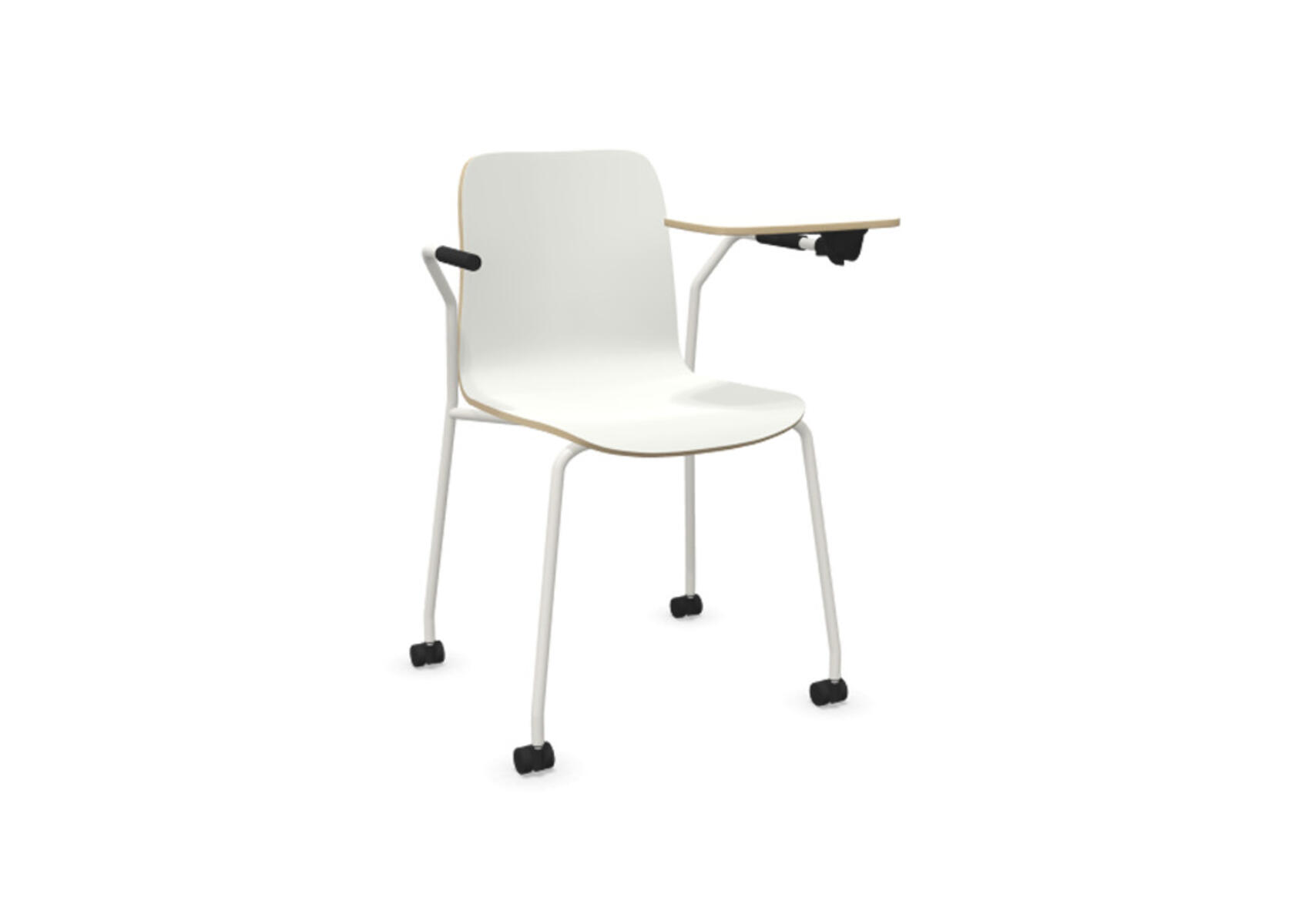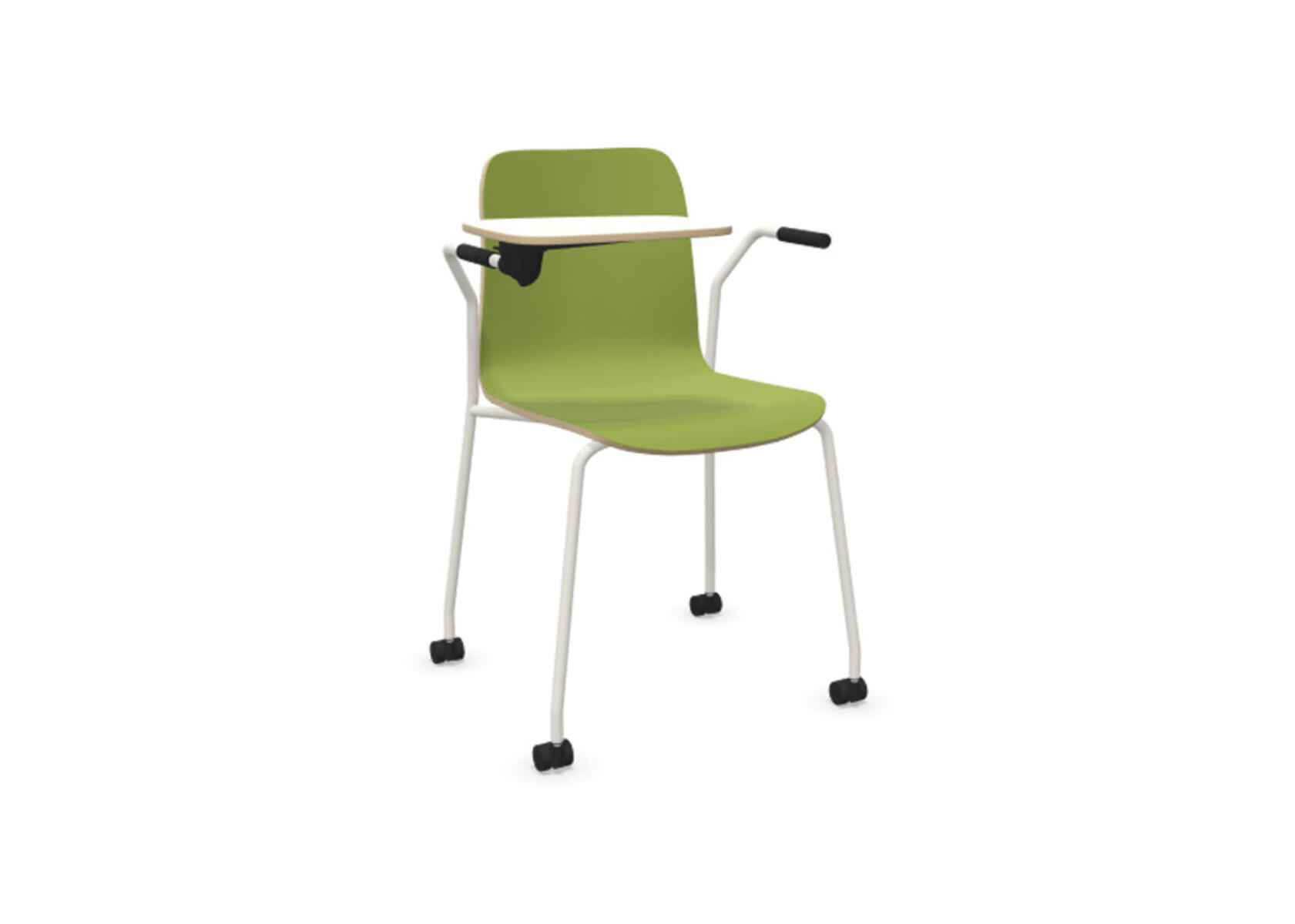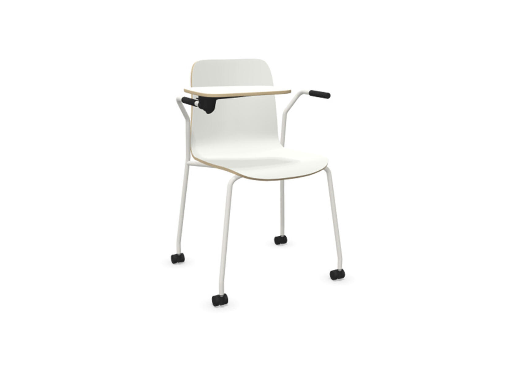 Sædeskål i formpresset krydsfinér belagt med højtrykslaminat. Stabilt pulverlakeret stel i Ø18 mm rør med møbelglidere, der beskytter gulvet. Skriveplade i finér belagt med laminat, 10,5 mm tyk. Maks. belastning 110 kg. Stolen er ikke stabelbar.