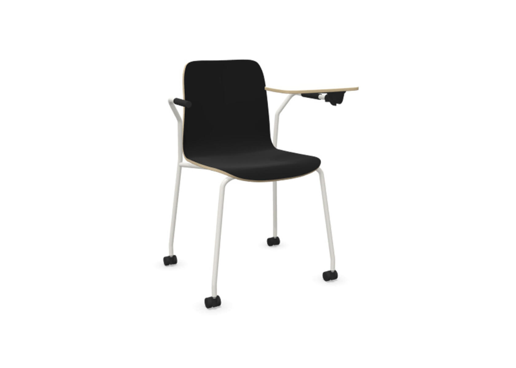 Sædeskål i formpresset krydsfinér belagt med højtrykslaminat. Stabilt pulverlakeret stel i Ø18 mm rør med møbelglidere, der beskytter gulvet. Skriveplade i finér belagt med laminat, 10,5 mm tyk. For ekstra fleksibilitet kan der tilkøbes koblings- og rækkekoblingsbeslag, som gør det nemt at skabe rækker eller gruppesætninger. Maks. belastning 110 kg. Stolen er ikke stabelbar.