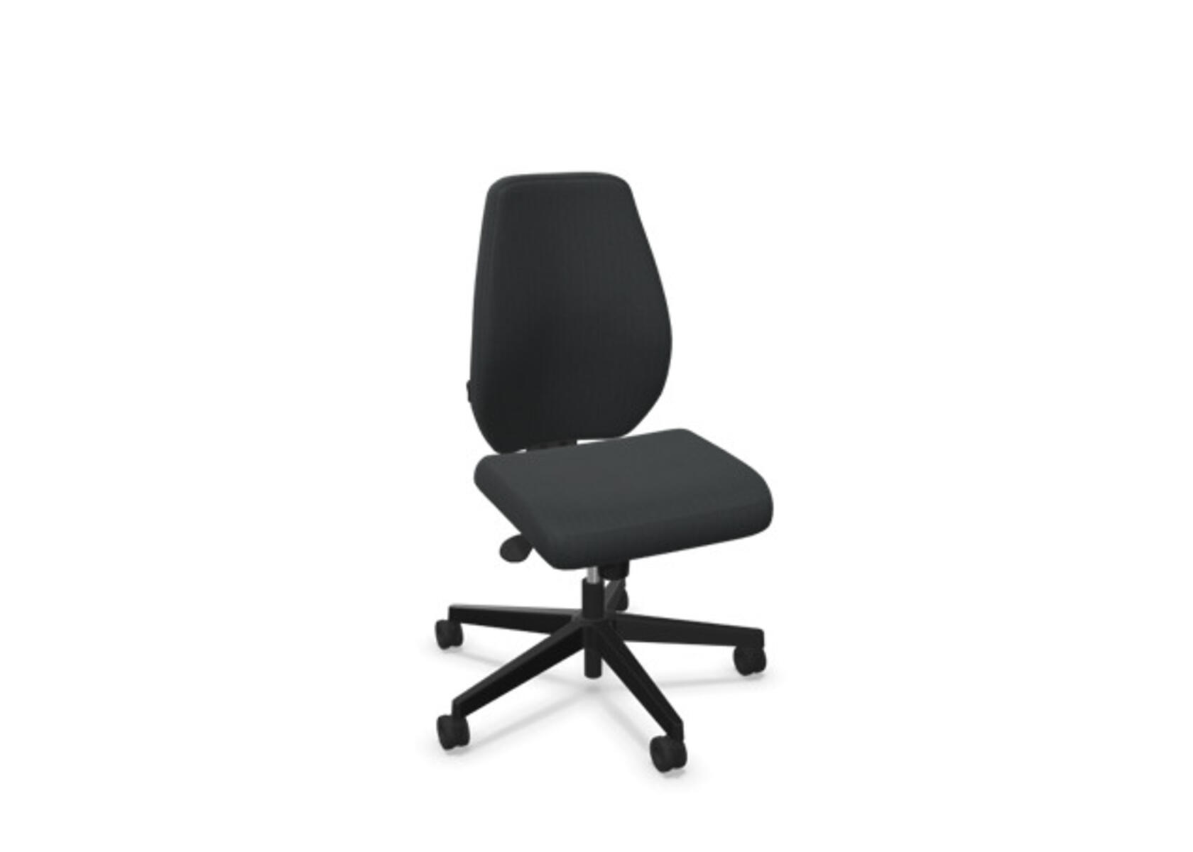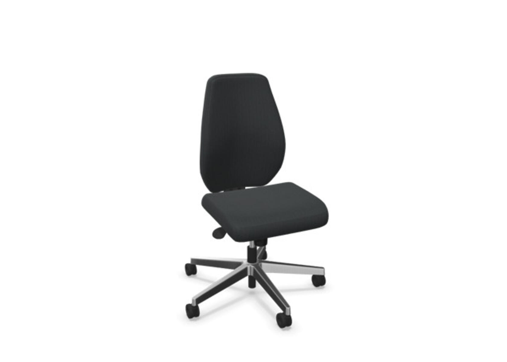En stilren og ergonomisk kontorstol med fuldpolstret høj ryg og avanceret synkronmekanisme samt justerbar sædedybde, designet til at give støtte ved aktivt siddende arbejde hele dagen. Den synkroniserede vippefunktion mellem ryg og sæde gør det nemt at variere siddestillingen og stadig sidde behageligt. Ryglænets hældningsvinkel på 23° er synkroniseret med sædets hældningsvinkel på 10°. Ryglænet kan låses i 5 positioner, og modstanden justeres enkelt via et drejegreb i 7 trin. Ryglænet kan højdeindstilles 70 mm med 13 låsepositioner. Sædedybden kan justeres 60 mm. En negativ sædehældning på –2° synkroniseret med ryglænet ved 5° giver optimal støtte i alle vippepositioner. Det justerbare, polstrede nakkestøtte giver ekstra komfort med både vinkel- og højdejustering over et interval på 100 mm. Stolen har Anti-Shock funktion, som forhindrer at ryglænet slår tilbage, når vippen låses op. Vælg mellem sort polyamidfodkryds eller poleret aluminium samt selvbremsende hjul til bløde eller hårde gulve. Som tilbehør kan der tilvælges lændestøtte (Shukra-mekanisme), som manuelt kan justeres 20 mm i dybden. Armlæn i 1D, 2D, 3D eller 4D sælges separat.