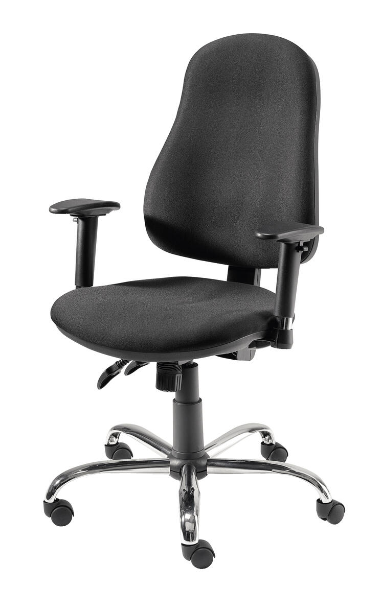 Kontorstol med synkronmekanisne, kan indstilles i 5 forskellige indstillinger. Højdejusterbar med gas. Ryggen kan indstilles i højden. Højdejusterbare armlæn medfølger. Totalhøjde 96-114 cm, siddebredde 42cm, siddedybde 46 cm, fra gulv til sæde 45-57 cm.