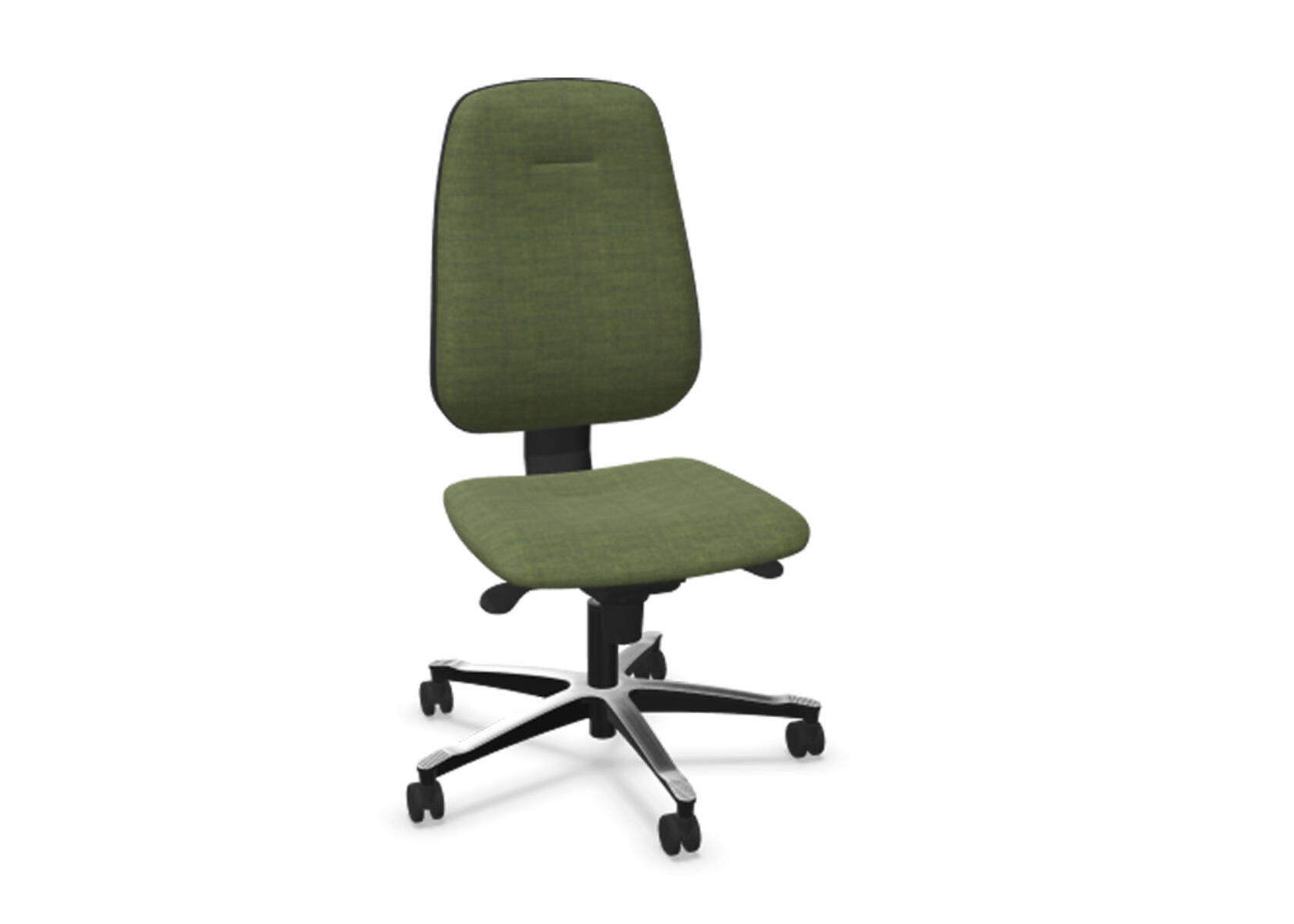 Ergonomisk kontorstol med delvist polstret lav ryg og synkronmekanisme, designet til at give støtte ved aktivt siddende arbejde hele dagen. Ryglænet kan vinkles op til 20°, synkroniseret med sædets 11°, og låses i fem positioner for personlig tilpasning. Modstanden justeres nemt med et drejehåndtag, og højden kan reguleres 75 mm med 13 låsepunkter. Anti-Shock-funktion forhindrer, at ryglænet slår tilbage ved oplåsning. Vælg mellem sort polyamid- eller poleret aluminiumsfod samt selvbremsende hjul til bløde eller hårde gulve. Armlæn (2D, 3D eller 4D) fås som tilbehør.