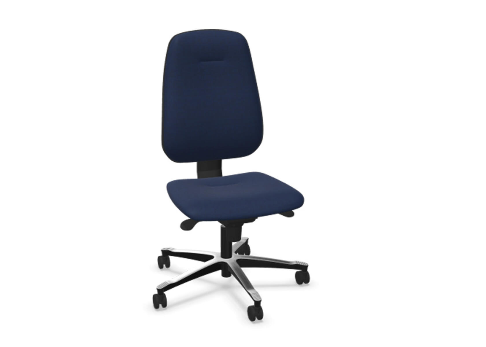 Ergonomisk kontorstol med delvist polstret høj ryg og synkronmekanisme, der giver optimal støtte ved aktivt siddende arbejde hele dagen. Ryglænet kan vinkles op til 20° og følger sædet i 11° for naturlig bevægelse. Kan låses i fem positioner og justeres i højden 75 mm med 13 låsepunkter. Modstanden justeres nemt med et drejehåndtag. Anti-Shock-funktion forhindrer ryglænet i at slå tilbage ved oplåsning. Vælg mellem sort polyamid- eller poleret aluminiumsfod og selvbremsende hjul til bløde eller hårde gulve. Armlæn (2D, 3D eller 4D) fås som tilbehør.