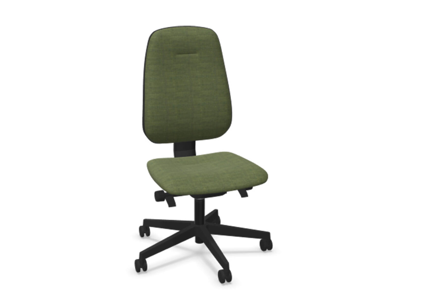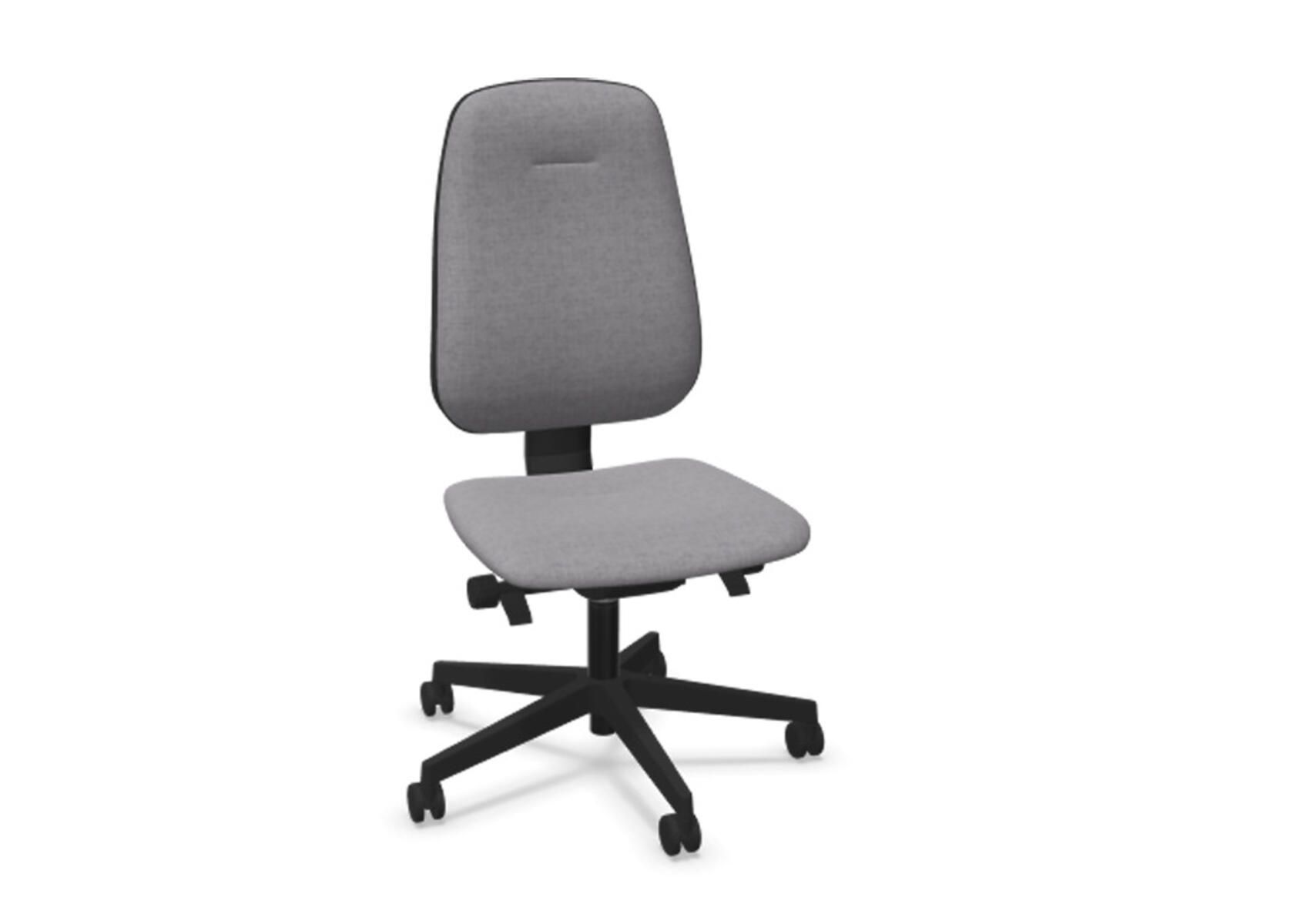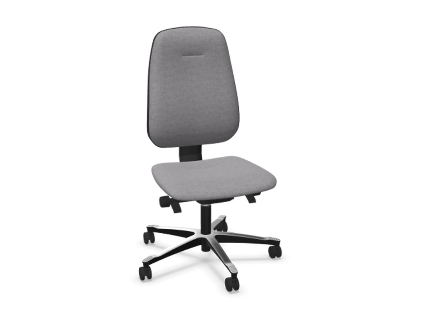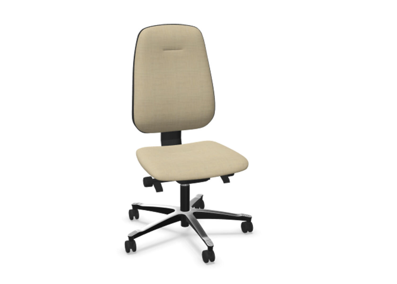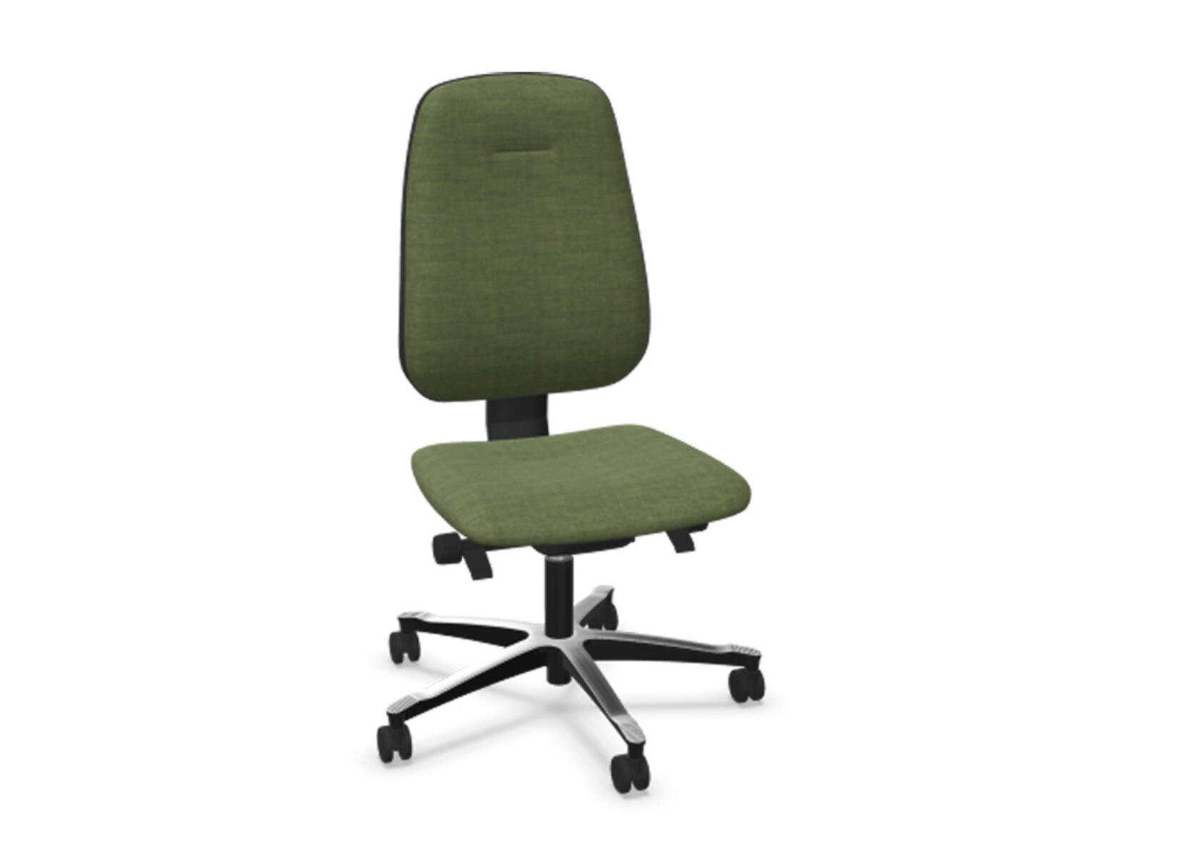 Ergonomisk kontorstol med delvist polstret lav ryg og synkronmekanisme samt justerbar sædedybde. Designet til at give støtte ved aktivt siddende arbejde hele dagen. Ryglænet kan vinkles op til 20°, synkroniseret med sædets 11°, og låses i fem positioner for personlig komfort. Modstanden justeres nemt med et drejehåndtag, og højden kan reguleres 70 mm med 13 låsepunkter. Sædedybden kan justeres 50 mm. Anti-Shock-funktion forhindrer, at ryglænet slår tilbage ved oplåsning. Vælg mellem kryds i sort polyamid eller poleret aluminium og selvbremsende hjul til bløde eller hårde gulve. Armlæn (2D, 3D eller 4D) fås som tilbehør.