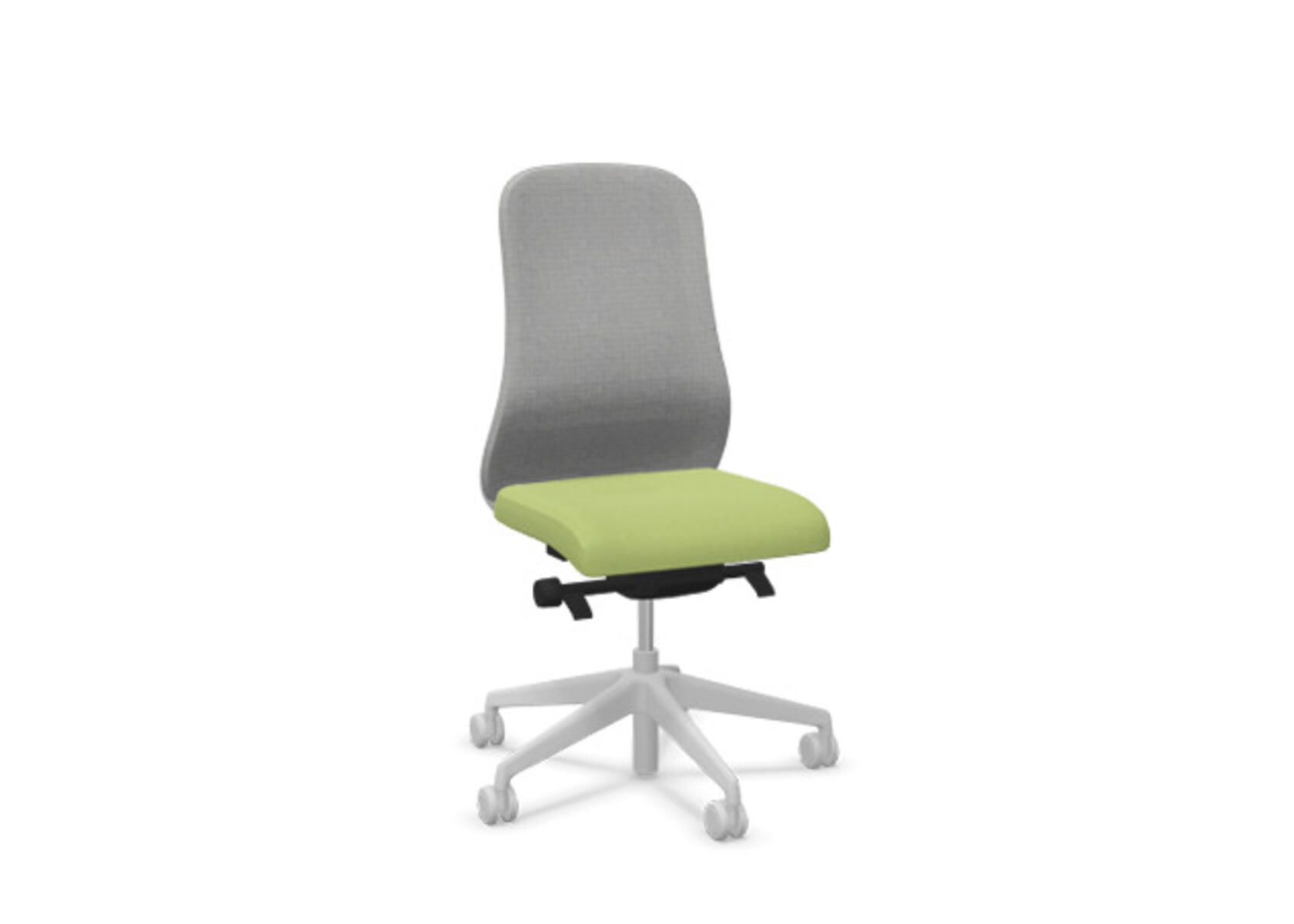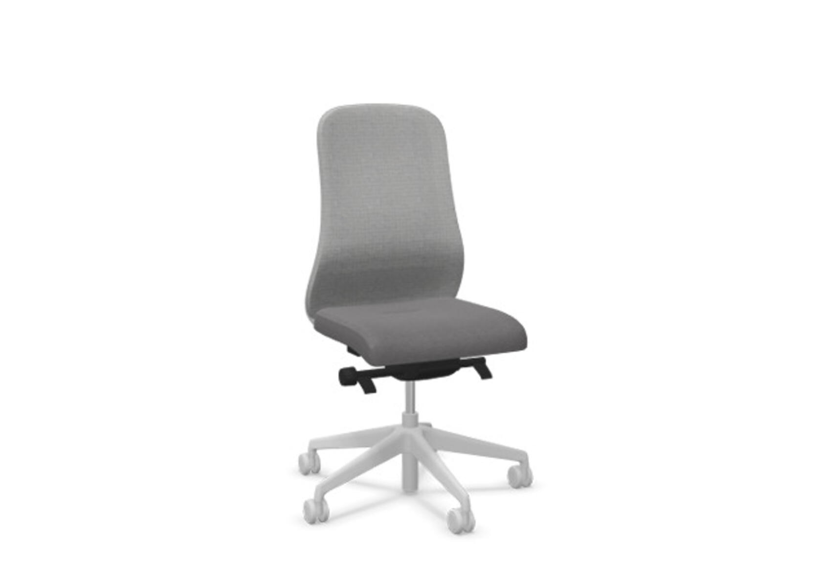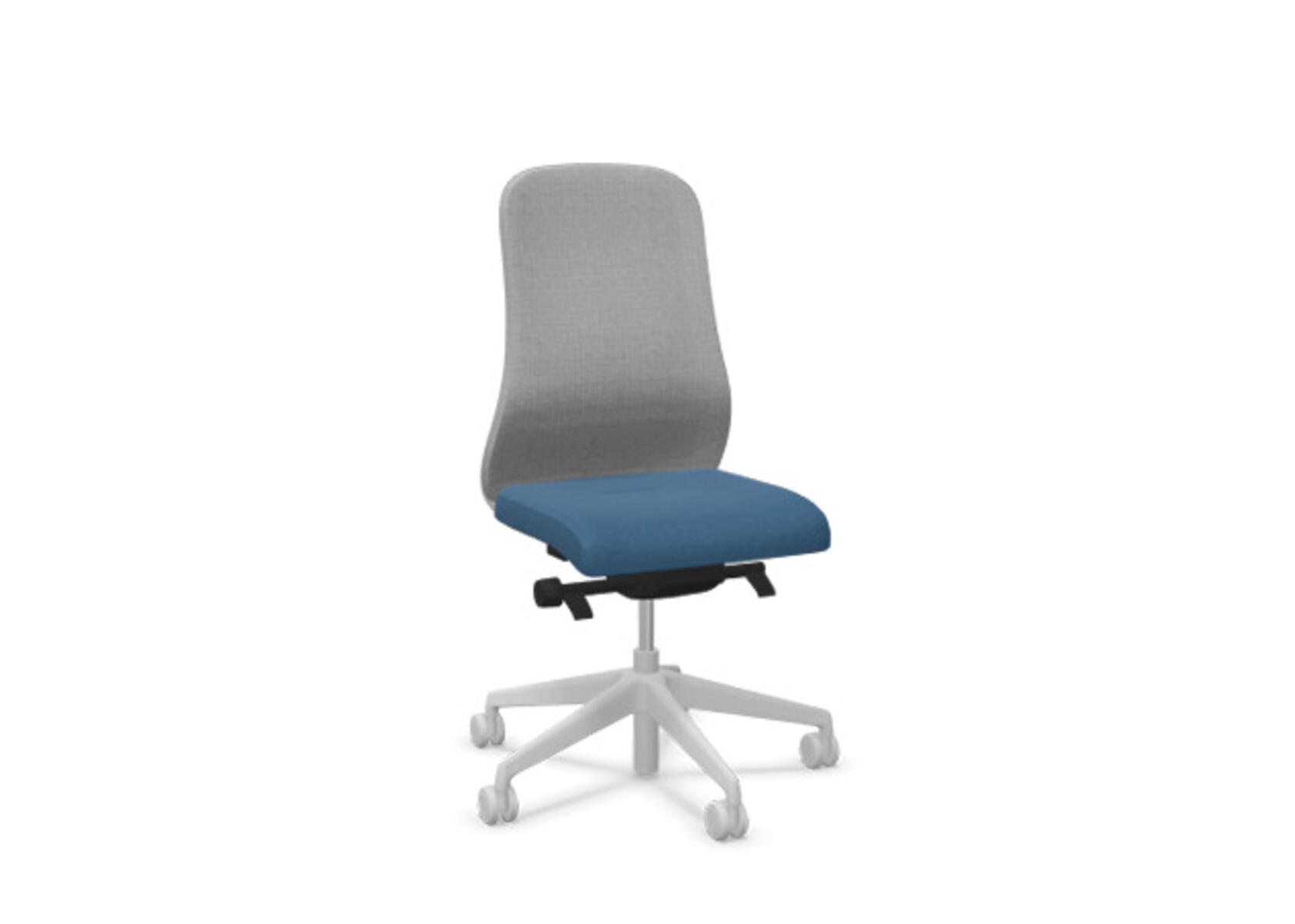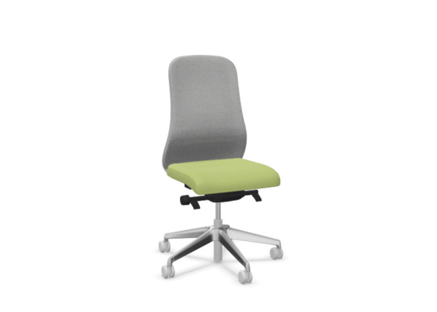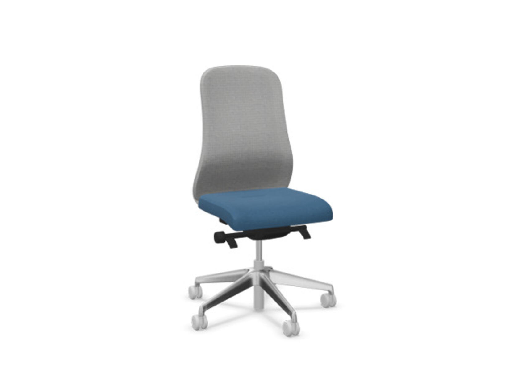 En moderne og ergonomisk kontorstol med halvpolstret ryg og synkronmekanisme samt justerbar sædedybde, designet til at give støtte ved aktiv siddestilling gennem hele arbejdsdagen. Polstret i polyesterstof. Den synkroniserede bevægelse mellem ryg og sæde giver en aktiv og behagelig siddestilling; ryglænet har en hældning på 21° synkroniseret med sædets 7°. Ryglænet kan låses i 4 positioner og er udstyret med en funktion, der automatisk tilpasser modstanden efter brugerens vægt og giver mulighed for yderligere finjustering i 3 trin. Ryglænet kan ikke højdejusteres. Sædedybden kan justeres 60 mm og låses i 7 positioner. Stolen har Anti-Shock-funktion, som forhindrer ryglænet i at slå frem, når låsen frigives. Polstret nakkestøtte, justerbar i dybden 20 mm, i vinklen 70° og i højden 100 mm. Vælg mellem kryds i lysgrå polyamid eller poleret aluminium samt selvbremsende hjul til både hårde og bløde gulve. Som tilvalg findes lændestøtte, manuelt højdejusterbar 55 mm. Armlæn i 2D, 3D eller 4D købes separat.