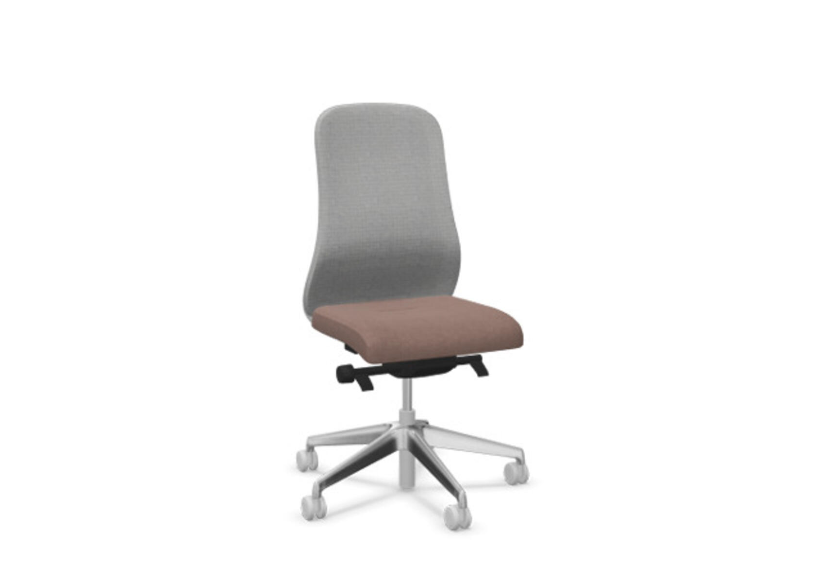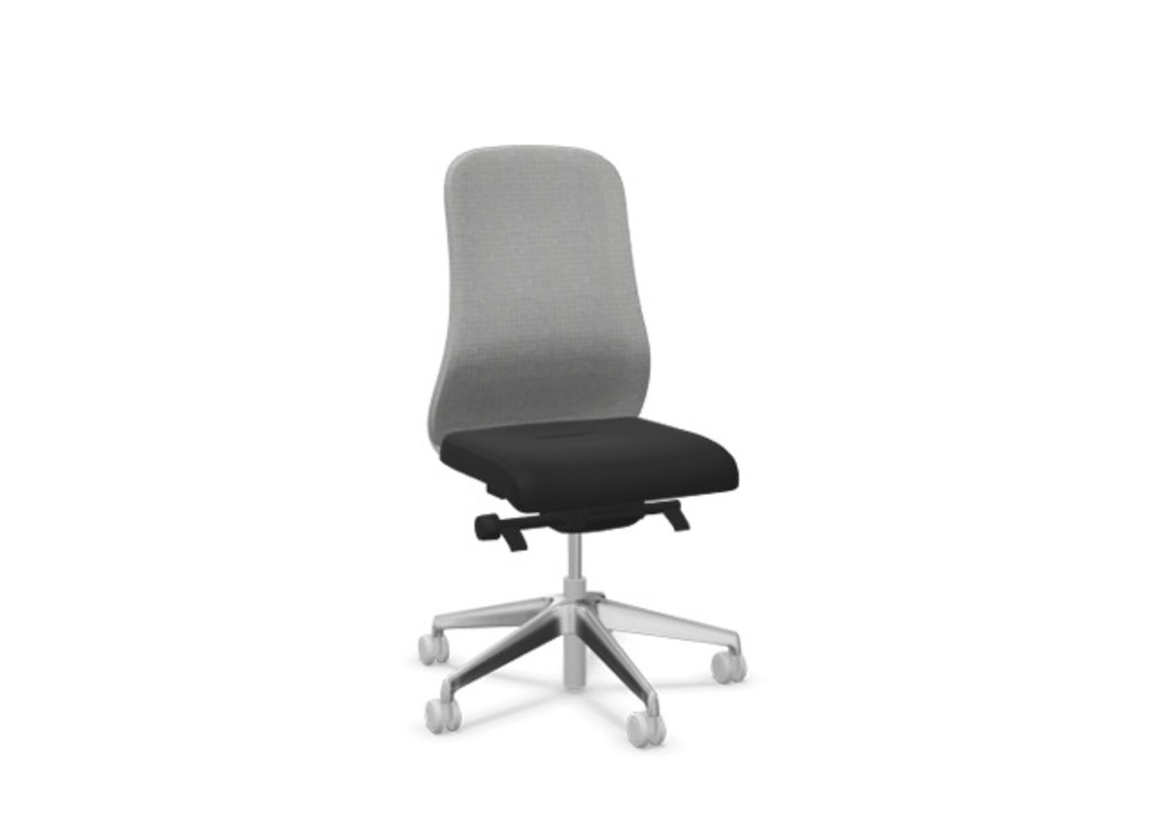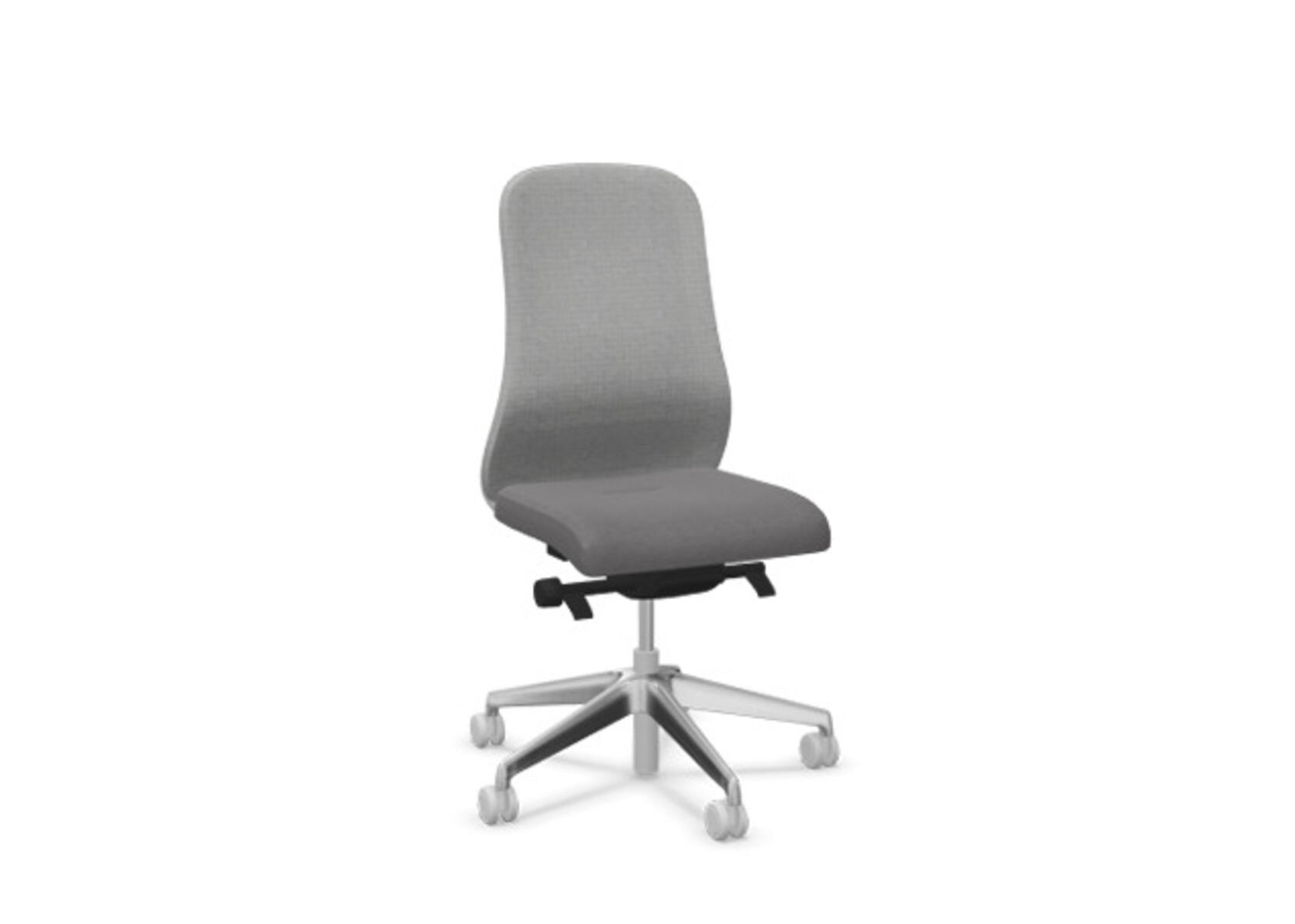 En moderne og ergonomisk kontorstol med halvpolstret ryg og synkronmekanisme samt justerbar sædedybde, designet til at give støtte ved aktiv siddestilling gennem hele arbejdsdagen. Polstret i polyesterstof. Den synkroniserede bevægelse mellem ryg og sæde giver en aktiv og behagelig siddestilling; ryglænet har en hældning på 21° synkroniseret med sædets 7°. Ryglænet kan låses i 4 positioner og er udstyret med en funktion, der automatisk tilpasser modstanden efter brugerens vægt og giver mulighed for yderligere finjustering i 3 trin. Ryglænet kan ikke højdejusteres. Sædedybden kan justeres 60 mm og låses i 7 positioner. Stolen har Anti-Shock-funktion, som forhindrer ryglænet i at slå frem, når låsen frigives. Vælg mellem kryds i lysgrå polyamid eller poleret aluminium samt selvbremsende hjul til både hårde og bløde gulve. Som tilvalg findes lændestøtte, manuelt højdejusterbar 55 mm. Armlæn i 2D, 3D eller 4D købes separat.