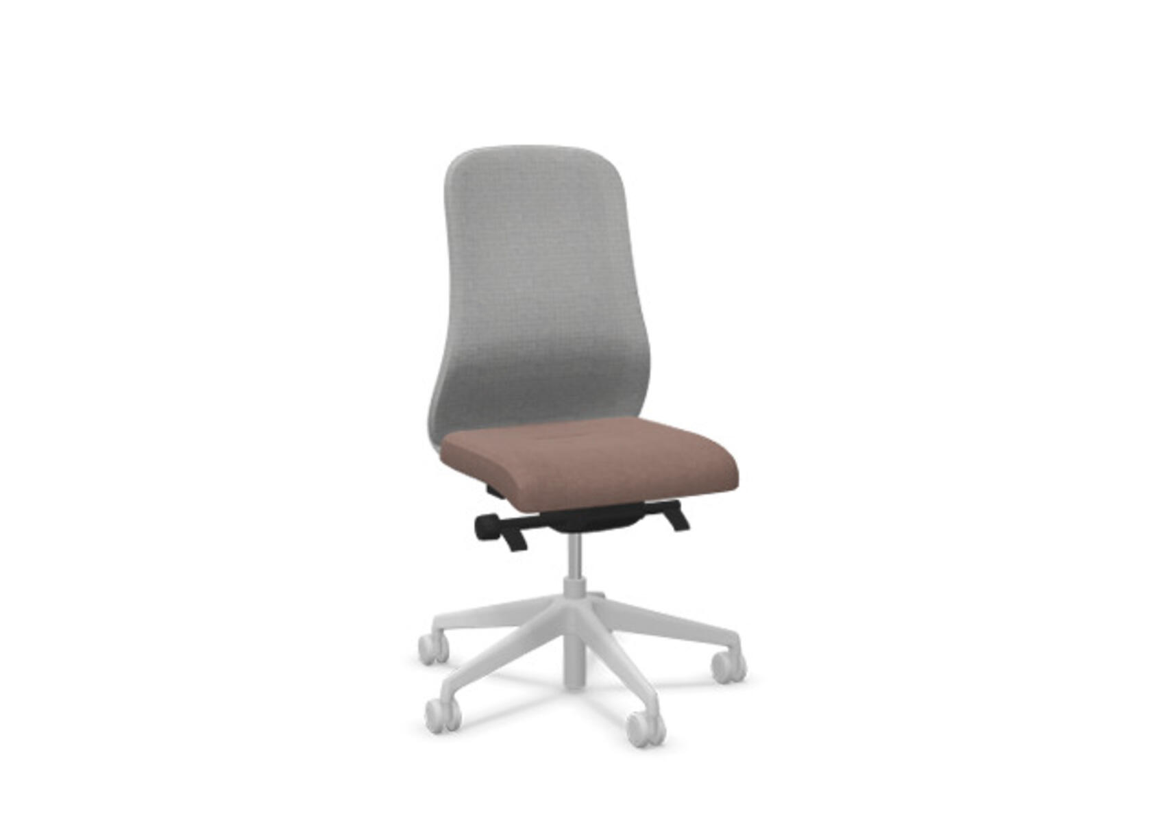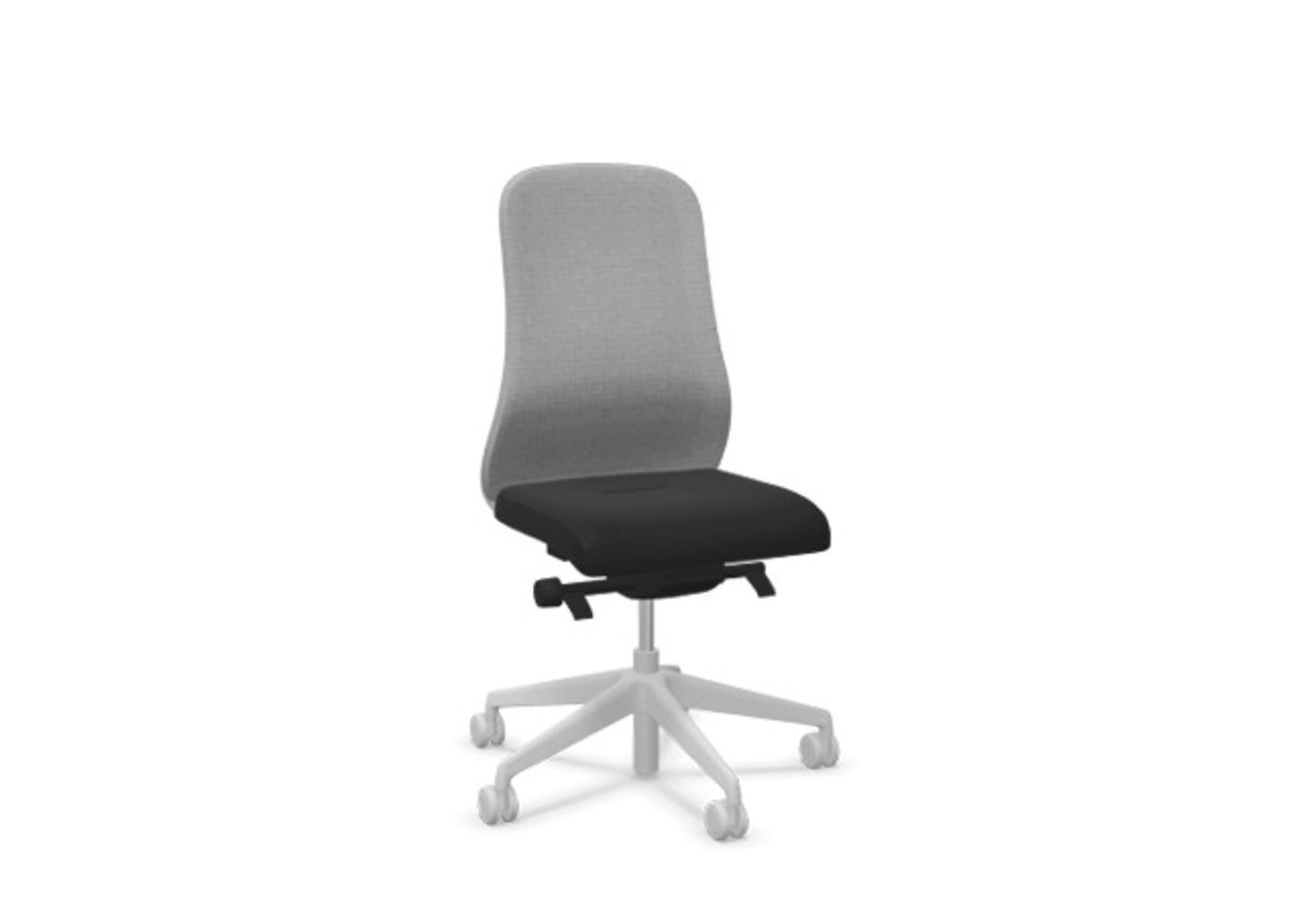 Moderne og ergonomisk kontorstol med halvpolstret ryg og synkronmekanisme samt sædedybdejustering, udviklet til at give støtte ved aktiv siddestilling under hele arbejdsdagen. Polstret med polyesterstof. Den synkroniserede vinkel mellem ryglæn og sæde muliggør en aktiv og behagelig siddestilling. Ryglænsvinkel 21° synkroniseret med sædevinkel 7°. Ryglænet kan låses i 4 forskellige positioner og er udstyret med en funktion, som automatisk justerer ryglænets modstand efter brugerens vægt og giver mulighed for yderligere justering i 3 trin. Ryglænet er ikke højdejusterbart. Sædedybden kan justeres inden for et interval på 60 mm, 7 låsepositioner. Stolen har også Anti-Shock-funktion, som forhindrer, at ryglænet slår tilbage, når vippefunktionen låses op. Vælg mellem fodkryds i sort polyamid eller poleret aluminium samt selvbremsende hjul til bløde eller hårde gulve. Som tilvalg fås også lændestøtte, manuelt højdejusterbar (55 mm). Armlæn 2D, 3D eller 4D sælges separat.