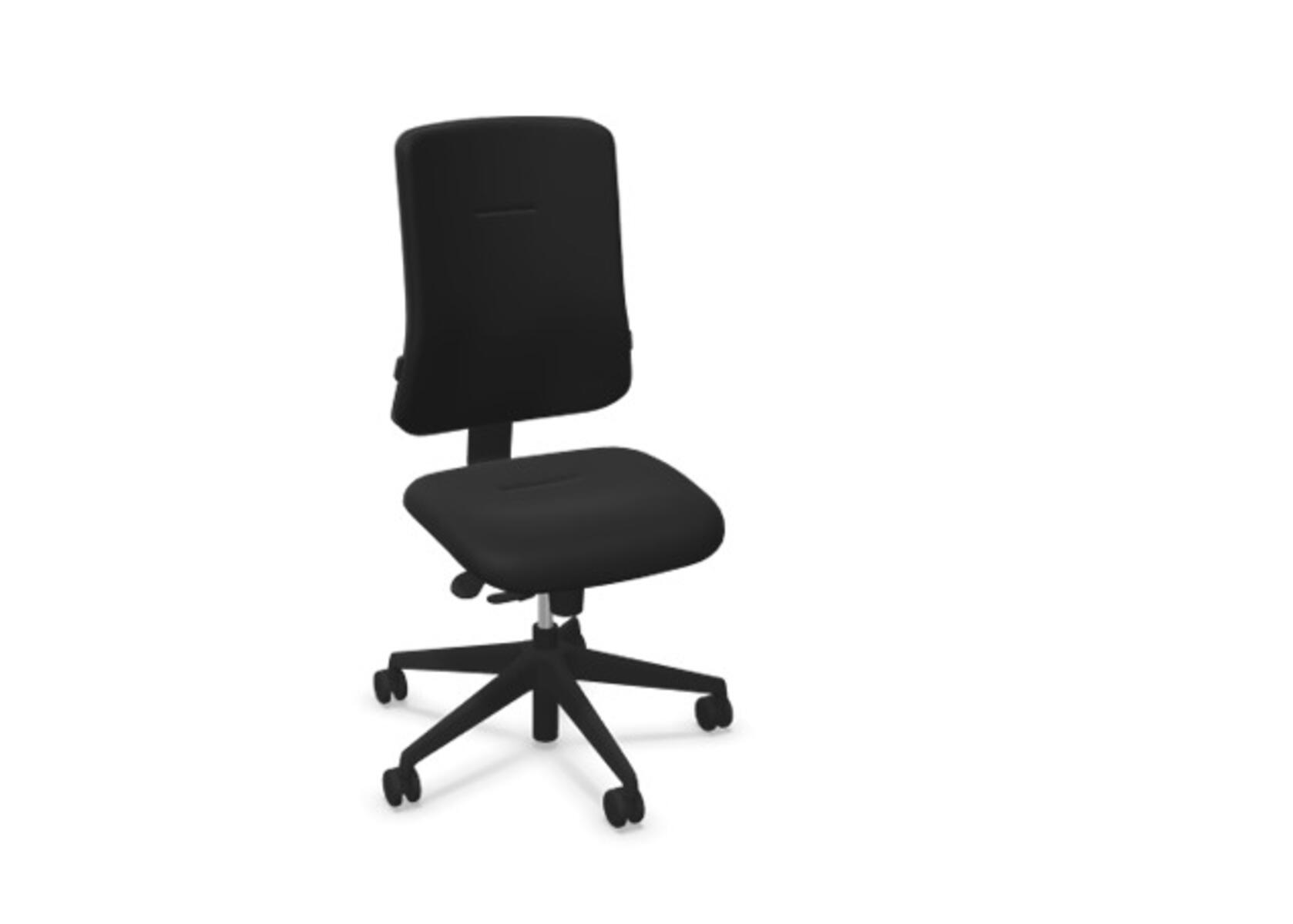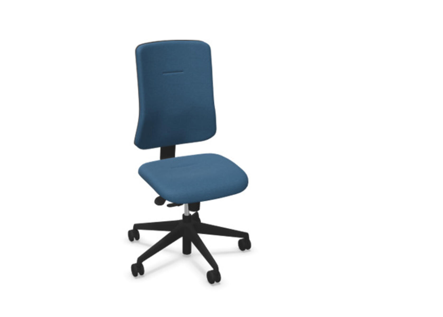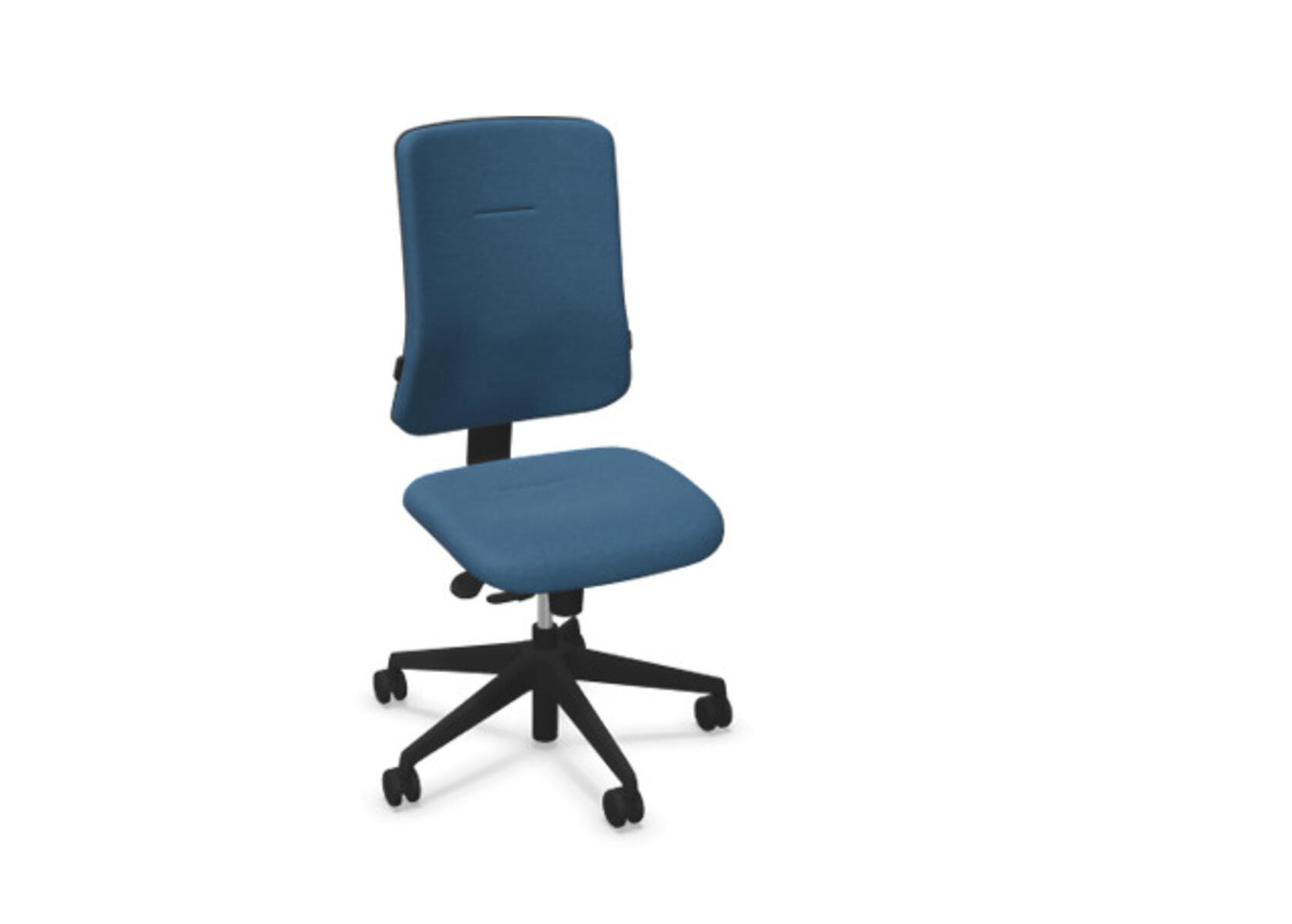 Ergonomisk kontorstol med halvpolstret ryg og synkronmekanisme, udviklet til at give støtte ved aktiv siddestilling gennem hele arbejdsdagen. Betrukket med polyestertøj. Den synkroniserede bevægelse mellem ryg og sæde sikrer en aktiv og komfortabel siddeoplevelse. Ryglænets hældning er 20° synkroniseret med sædets 11°. Ryglænet kan låses i 5 positioner og modstanden justeres nemt via et drejegreb. Ryggen kan højdejusteres 70 mm i 5 trin. Sædedybden kan justeres 50 mm. Stolen er udstyret med Anti-Shock, som forhindrer at ryggen smækker tilbage, når låsen frigøres. Vælg mellem kryds i sort polyamid eller poleret aluminium samt selvbremsende hjul til bløde eller hårde gulve. Som tilvalg findes justerbart lændestøtte (15 mm i dybde og 20 mm i højde). Armlæn 2D, 3D eller 4D sælges separat.