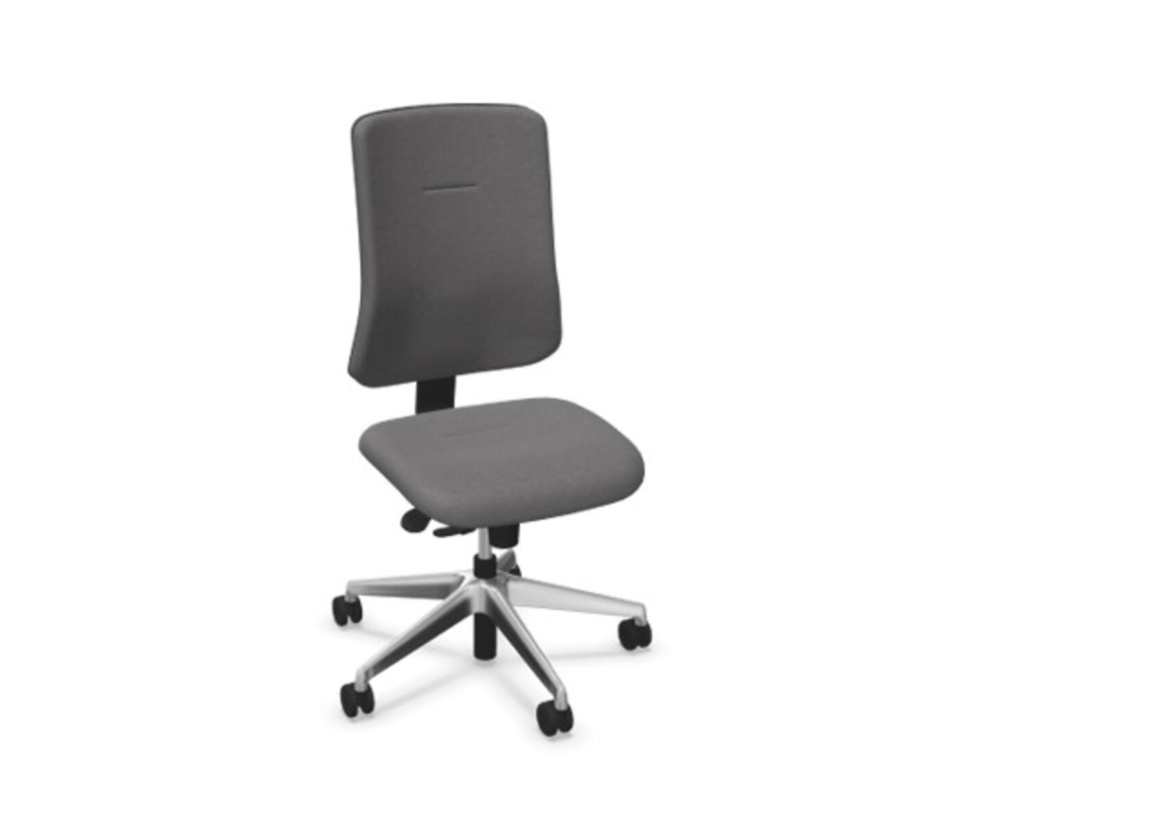 Ergonomisk kontorstol med halvpolstret ryg og synkronmekanisme, udviklet til at give støtte ved aktiv siddestilling gennem hele arbejdsdagen. Betrukket med polyestertøj. Den synkroniserede bevægelse mellem ryg og sæde sikrer en aktiv og komfortabel siddeoplevelse. Ryglænets hældning er 20° synkroniseret med sædets 11°. Ryglænet kan låses i 5 positioner og modstanden justeres nemt via et drejegreb. Ryggen kan højdejusteres 70 mm i 5 trin. Sædedybden kan justeres 50 mm. Stolen er udstyret med Anti-Shock, som forhindrer at ryggen smækker tilbage, når låsen frigøres. Vælg mellem kryds i lysgrå polyamid eller poleret aluminium samt selvbremsende hjul til bløde eller hårde gulve. Som tilvalg findes justerbart lændestøtte (15 mm i dybde og 20 mm i højde). Armlæn 2D, 3D eller 4D sælges separat.