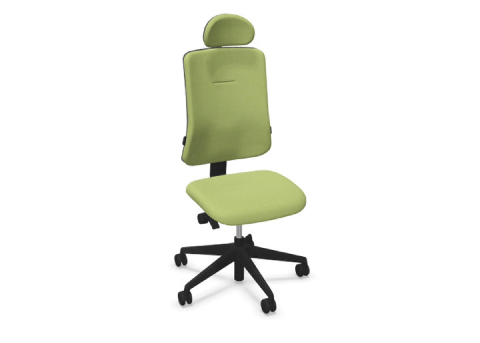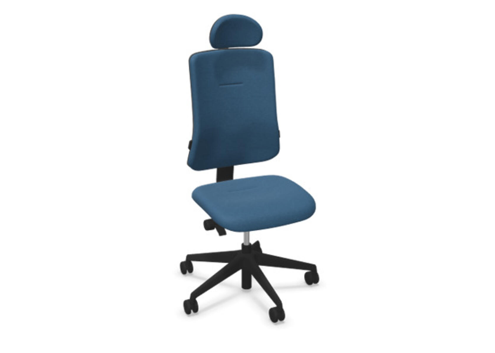 Ergonomisk kontorstol med halvpolstret ryg og synkronmekanisme, udviklet til at give støtte ved aktiv siddestilling gennem hele arbejdsdagen. Betrukket med polyestertøj. Den synkroniserede bevægelse mellem ryg og sæde sikrer en aktiv og komfortabel siddeoplevelse. Ryglænets hældning er 20° synkroniseret med sædets 11°. Ryglænet kan låses i 5 positioner og modstanden justeres nemt via et drejegreb. Ryggen kan højdejusteres 70 mm i 5 trin. Sædedybden kan justeres 50 mm. Stolen er udstyret med Anti-Shock, som forhindrer at ryggen smækker tilbage, når låsen frigøres. Vælg mellem kryds i sort polyamid eller poleret aluminium samt selvbremsende hjul til bløde eller hårde gulve. Som tilvalg findes justerbart lændestøtte (15 mm i dybde og 20 mm i højde). Armlæn 2D, 3D eller 4D sælges separat.