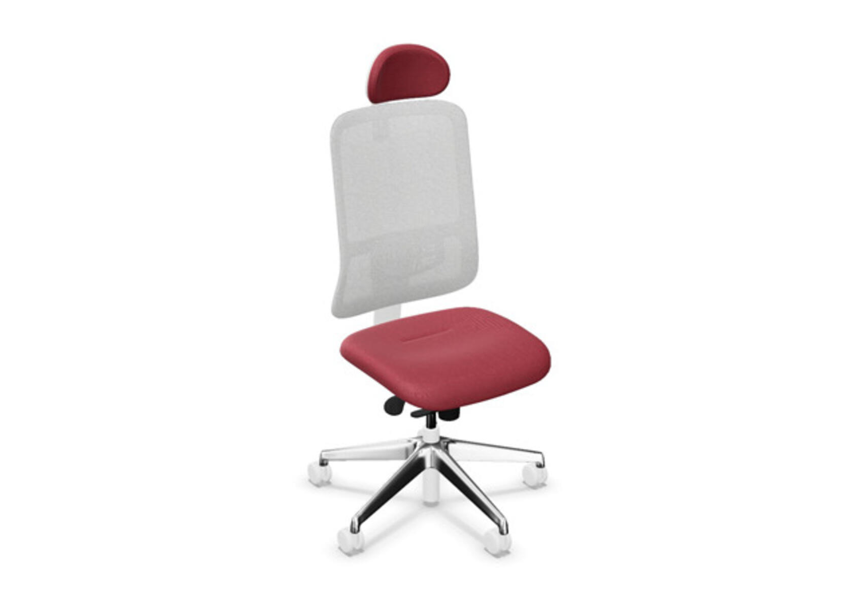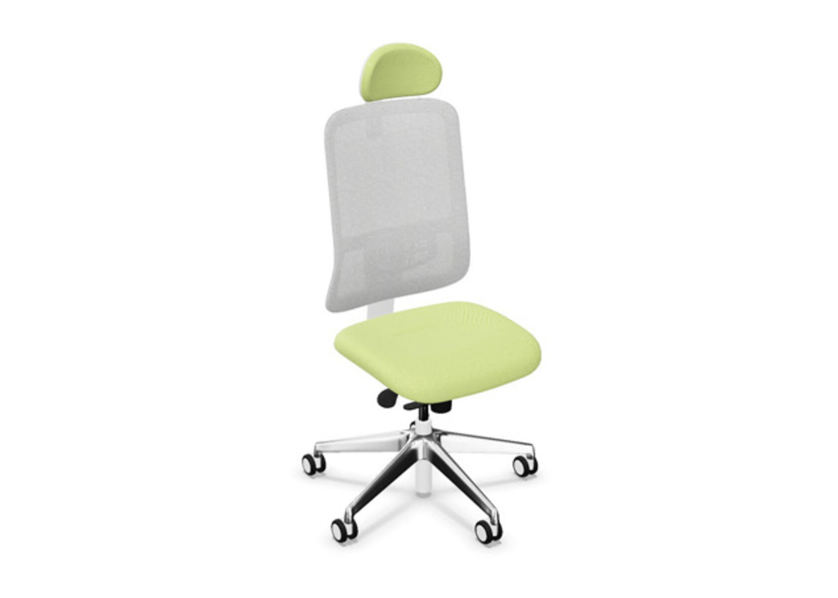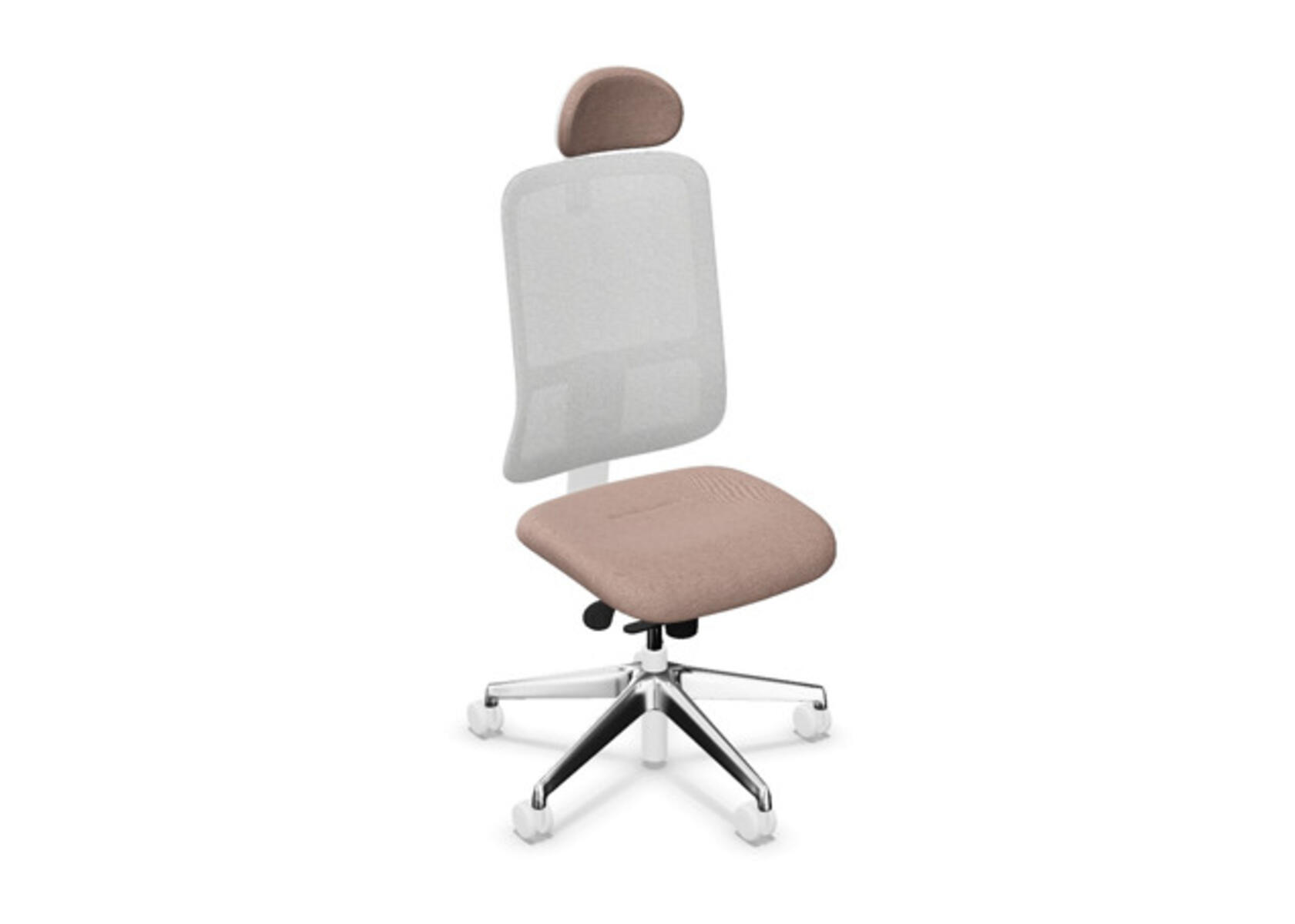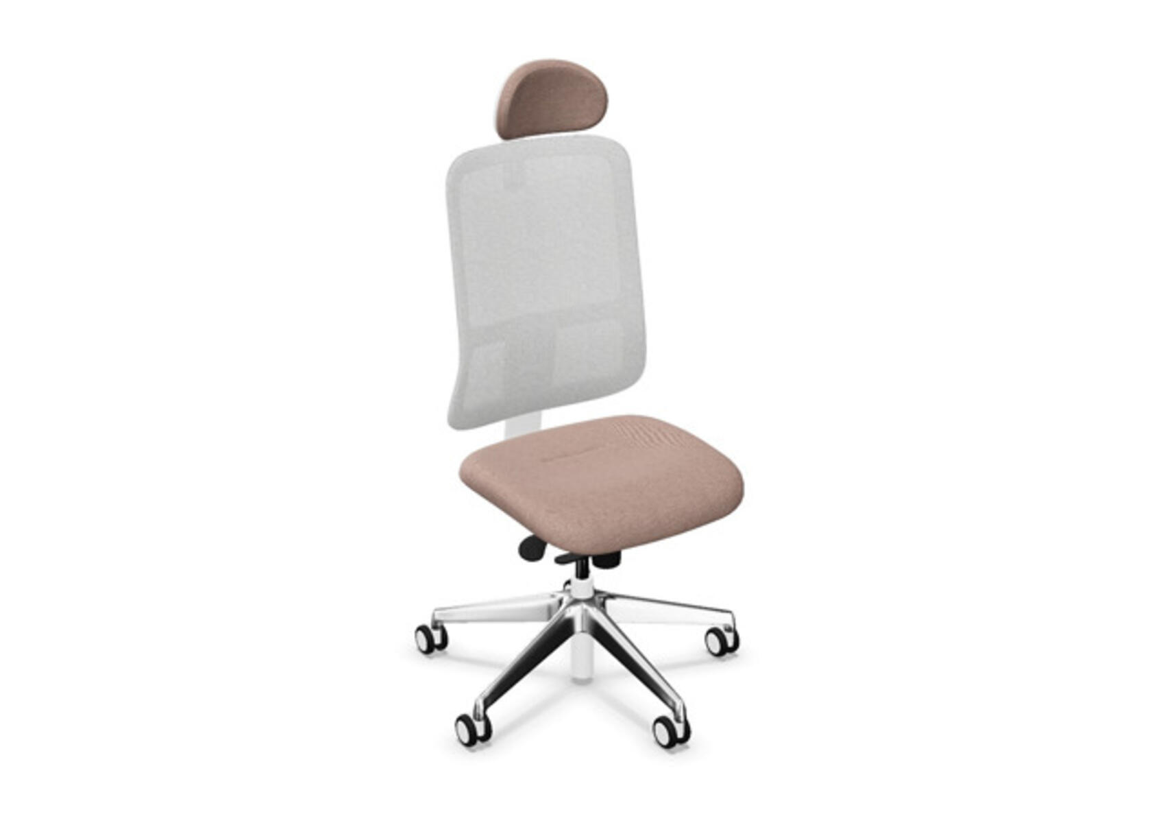 Ergonomisk kontorstol med mesh ryg og synkronmekanisme, designet til at give støtte ved aktiv siddestilling gennem hele arbejdsdagen. Sædet er betrukket med polyestert stof. Den synkroniserede bevægelse mellem ryg og sæde giver en aktiv og behagelig siddestilling. Ryglænets hældning er 20° og synkroniseret med sædets hældning på 11°. Ryglænet kan låses i 5 positioner, og modstanden justeres nemt med et drejegreb. Ryglænet kan højdejusteres 70 mm og har 5 låsepositioner. Det polstrede nakkestøtte kan justeres i dybde (20 mm), vinkel (70°) og højde (100 mm). Sædedybden kan justeres inden for 50 mm. Stolen har Anti-Shock funktion, som forhindrer, at ryglænet slår tilbage, når låsen frigøres. Vælg mellem kryds i lysegrå polyamid eller poleret aluminium samt selvbremsende hjul til både bløde og hårde gulve. Som tilvalg findes justerbart lændestøtte (15 mm i dybde og 20 mm i højde) Armlæn 2D, 3D eller 4D sælges separat.