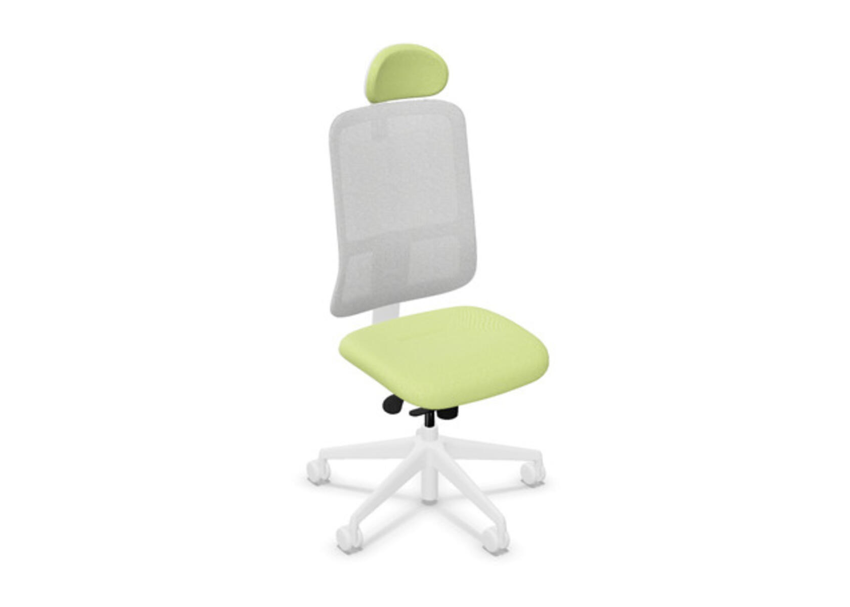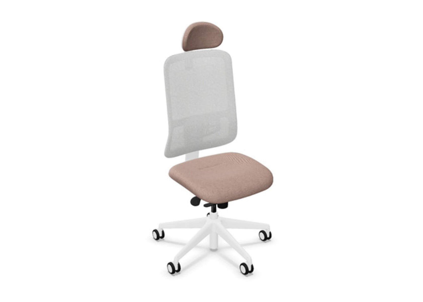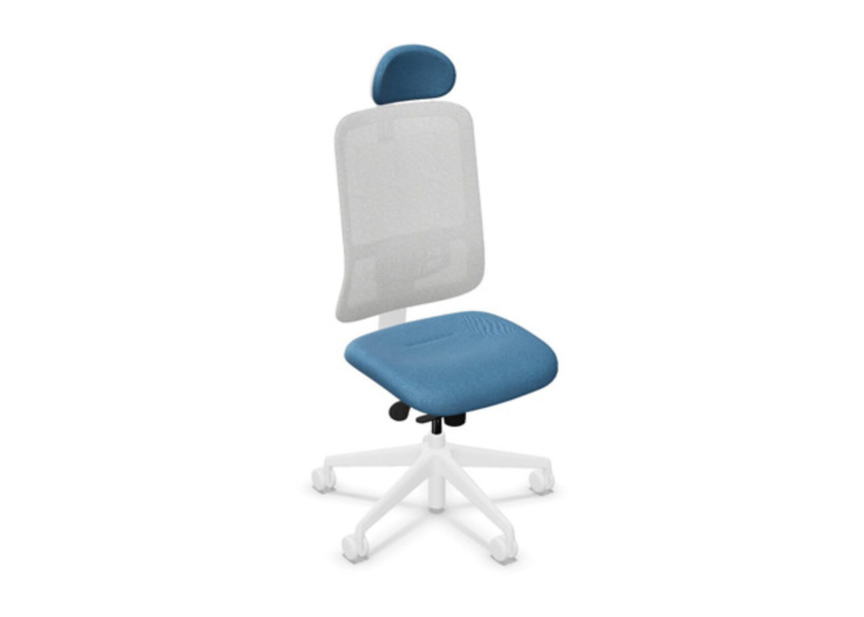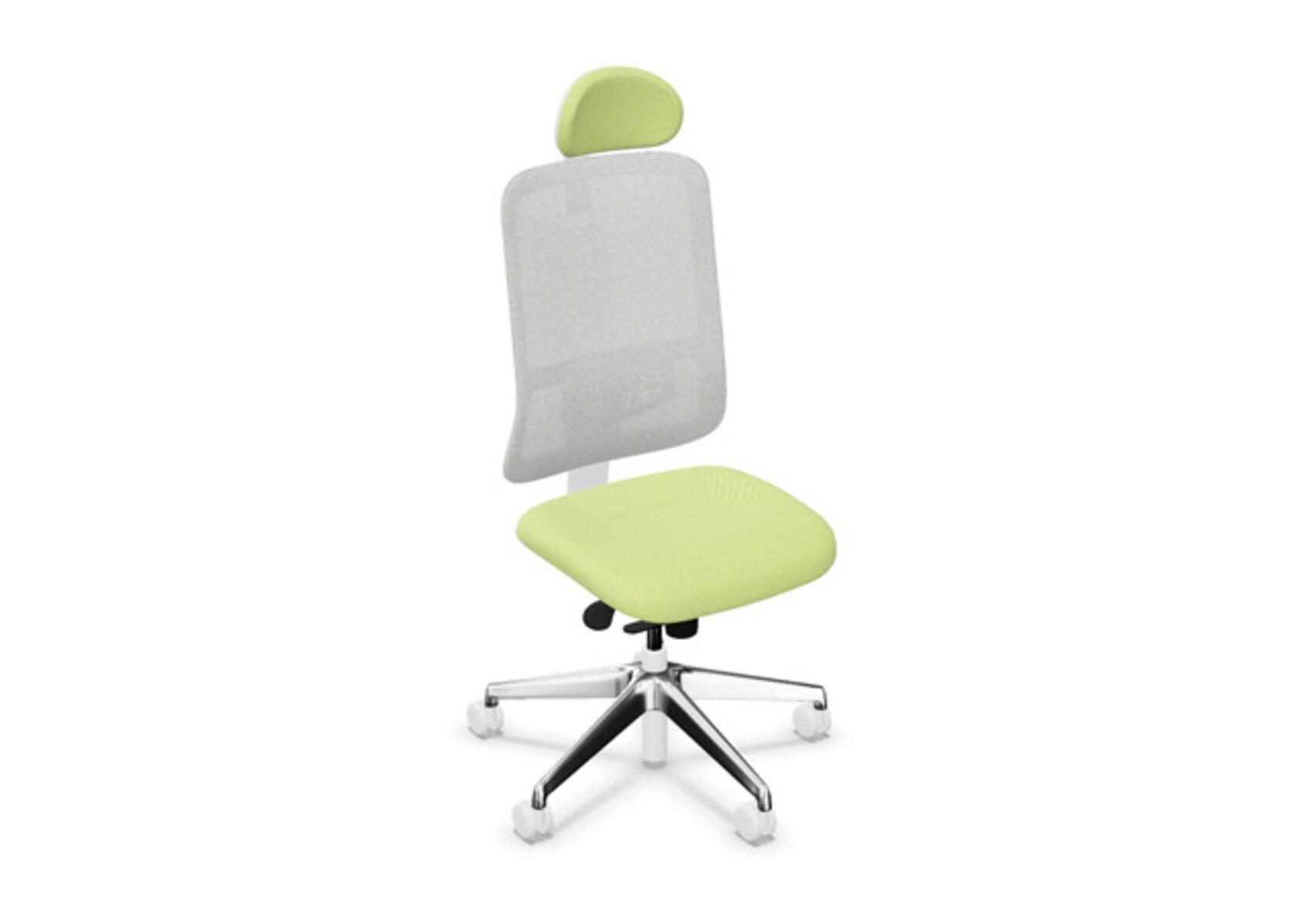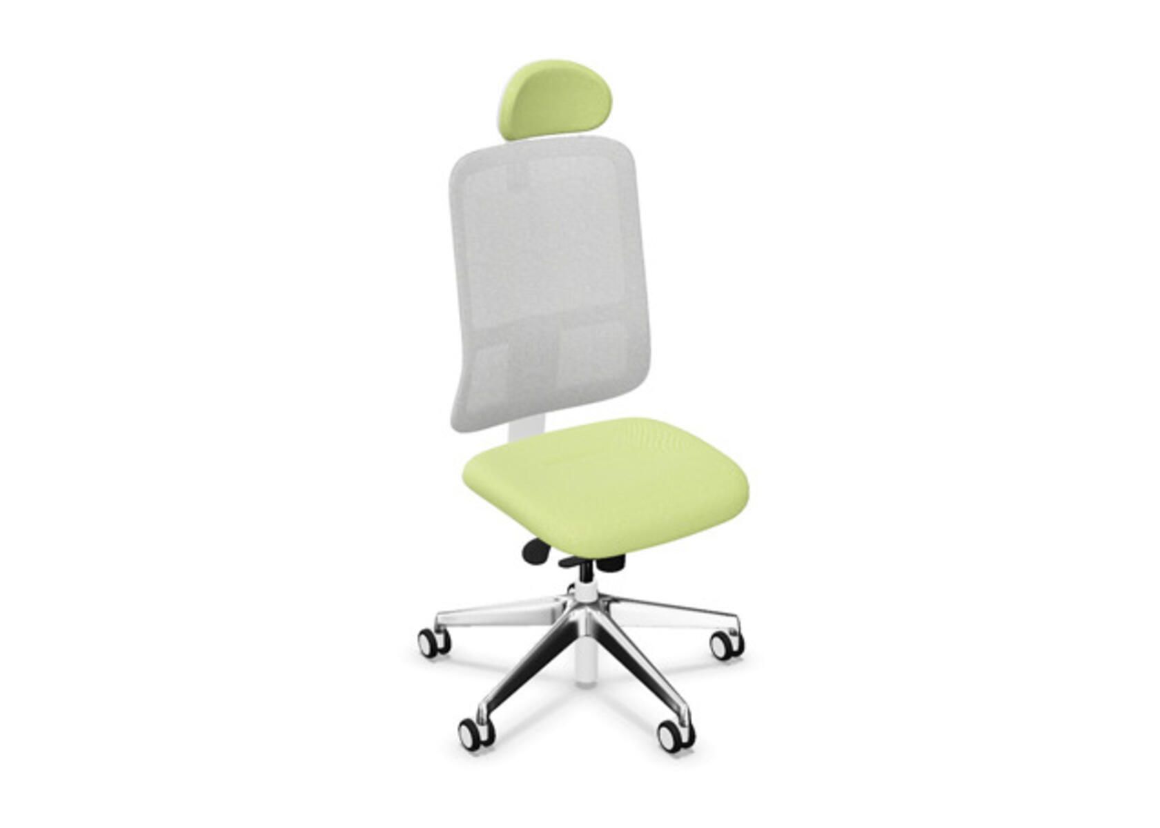 Ergonomisk kontorstol med mesh ryg og synkronmekanisme, designet til at give støtte ved aktiv siddestilling gennem hele arbejdsdagen. Sædet er betrukket med polyestert stof. Den synkroniserede bevægelse mellem ryg og sæde giver en aktiv og behagelig siddestilling. Ryglænets hældning er 20° og synkroniseret med sædets hældning på 11°. Ryglænet kan låses i 5 positioner, og modstanden justeres nemt med et drejegreb. Ryglænet kan højdejusteres 70 mm og har 5 låsepositioner. Det polstrede nakkestøtte kan justeres i dybde (20 mm), vinkel (70°) og højde (100 mm). Sædedybden kan justeres inden for 50 mm. Stolen har Anti-Shock funktion, som forhindrer, at ryglænet slår tilbage, når låsen frigøres. Vælg mellem kryds i lysegrå polyamid eller poleret aluminium samt selvbremsende hjul til både bløde og hårde gulve. Som tilvalg findes justerbart lændestøtte (15 mm i dybde og 20 mm i højde) Armlæn 2D, 3D eller 4D sælges separat.