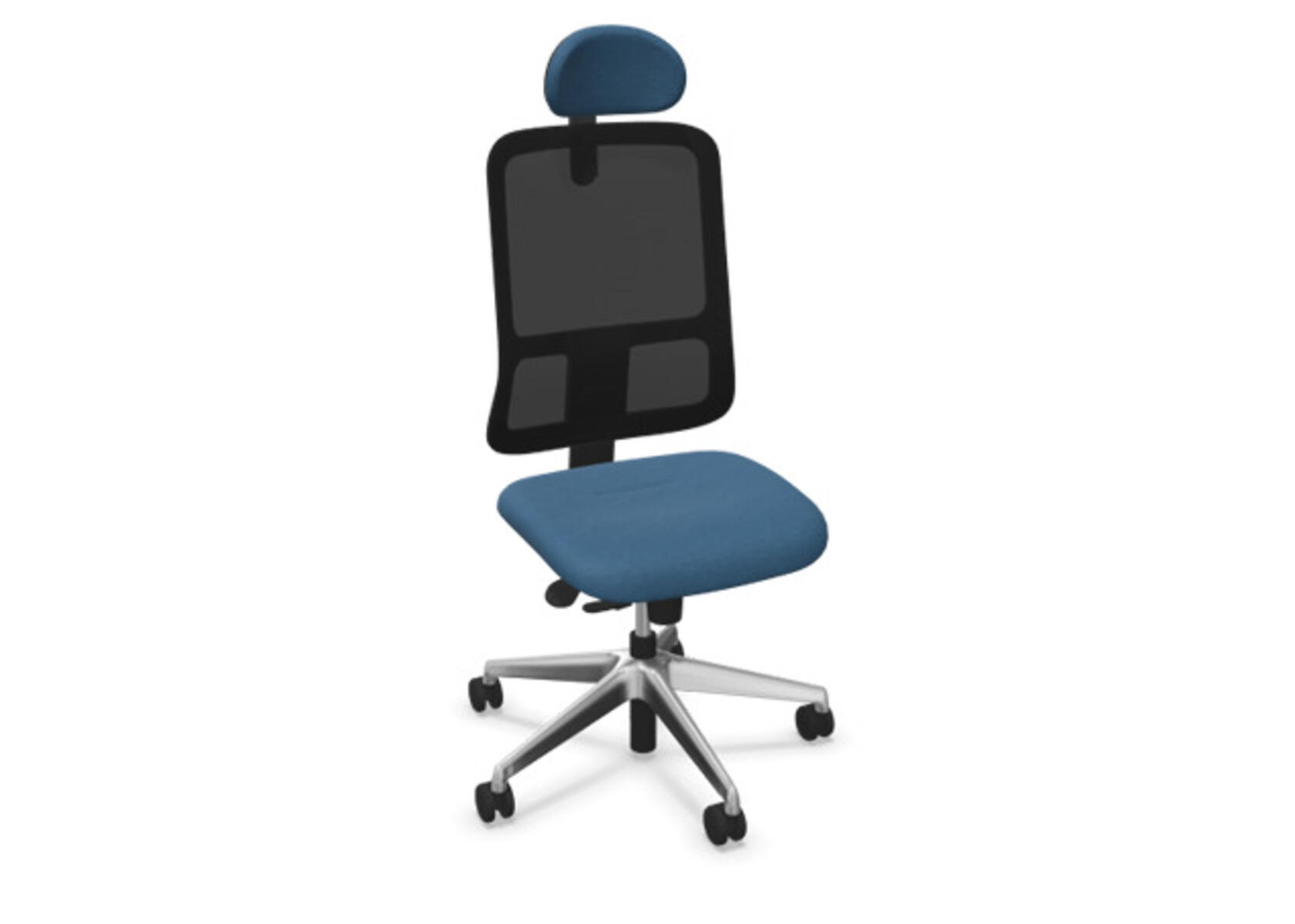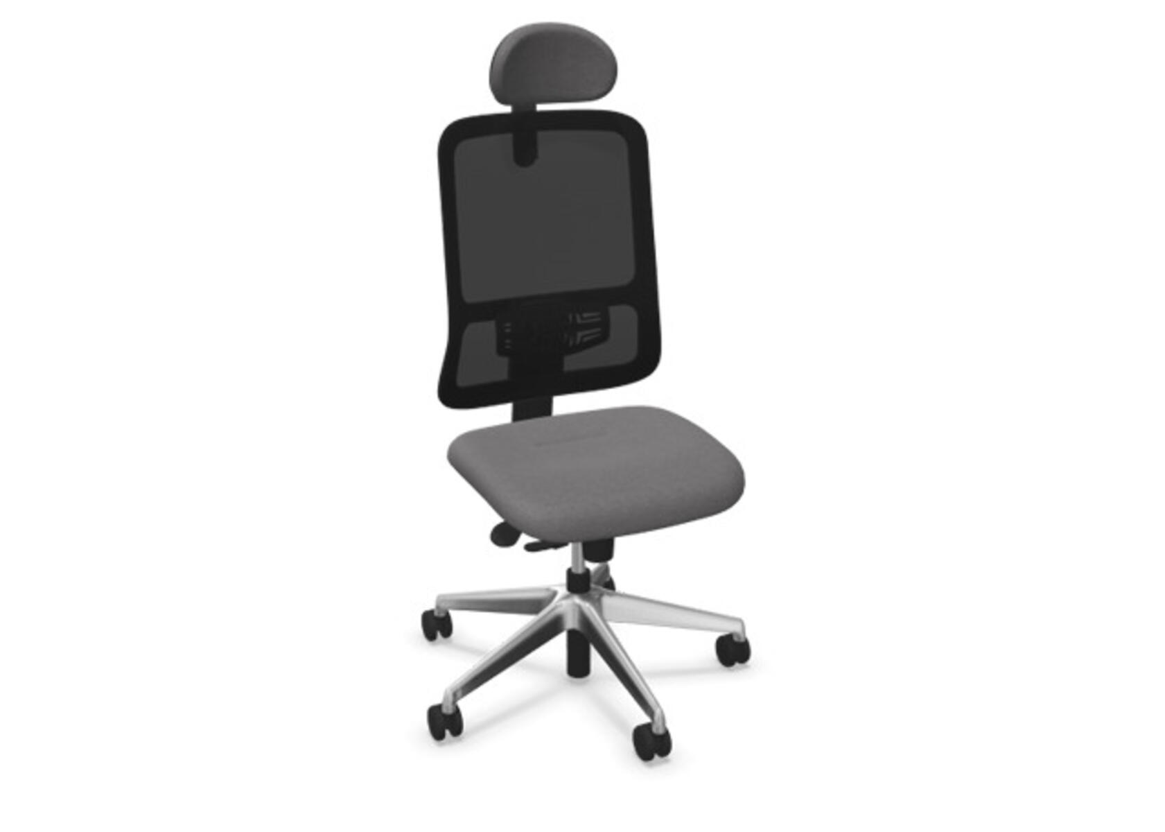 Ergonomisk kontorstol med mesh ryg og synkronmekanisme, designet til at give støtte ved aktiv siddestilling gennem hele arbejdsdagen. Sædet er betrukket med polyestert stof. Den synkroniserede bevægelse mellem ryg og sæde giver en aktiv og behagelig siddestilling. Ryglænets hældning er 20° og synkroniseret med sædets hældning på 11°. Ryglænet kan låses i 5 positioner, og modstanden justeres nemt med et drejegreb. Ryglænet kan højdejusteres 70 mm og har 5 låsepositioner. Det polstrede nakkestøtte kan justeres i dybde (20 mm), vinkel (70°) og højde (100 mm). Sædedybden kan justeres inden for 50 mm. Stolen har Anti-Shock funktion, som forhindrer, at ryglænet slår tilbage, når låsen frigøres. Vælg mellem kryds i lysegrå polyamid eller poleret aluminium samt selvbremsende hjul til både bløde og hårde gulve. Som tilvalg findes justerbart lændestøtte (15 mm i dybde og 20 mm i højde) Armlæn 2D, 3D eller 4D sælges separat.