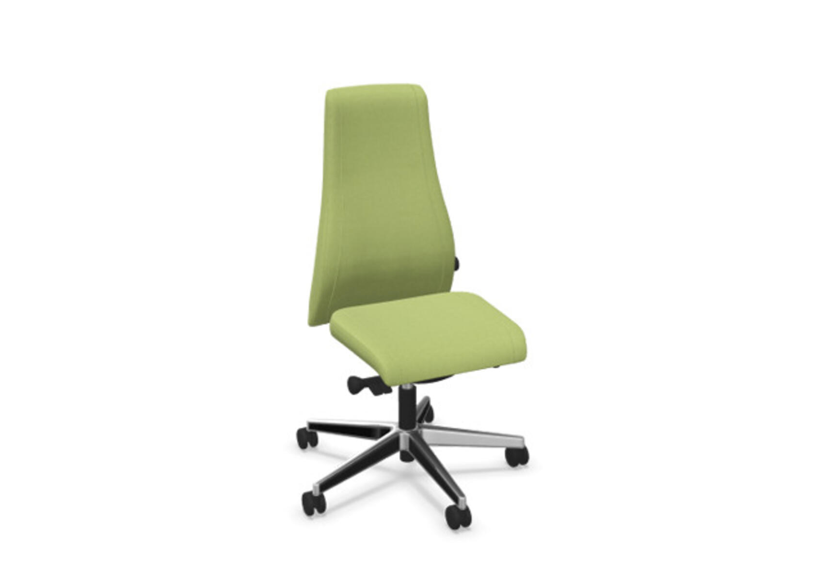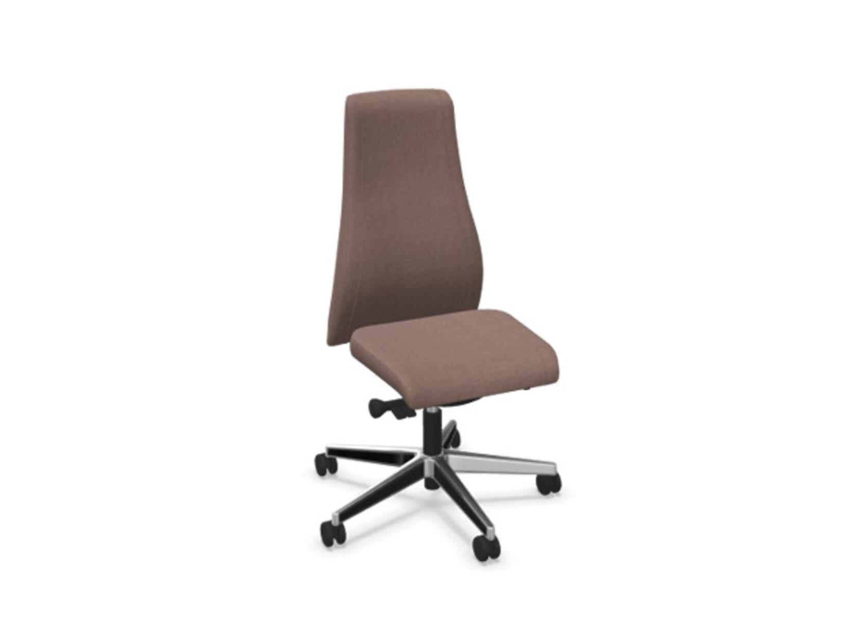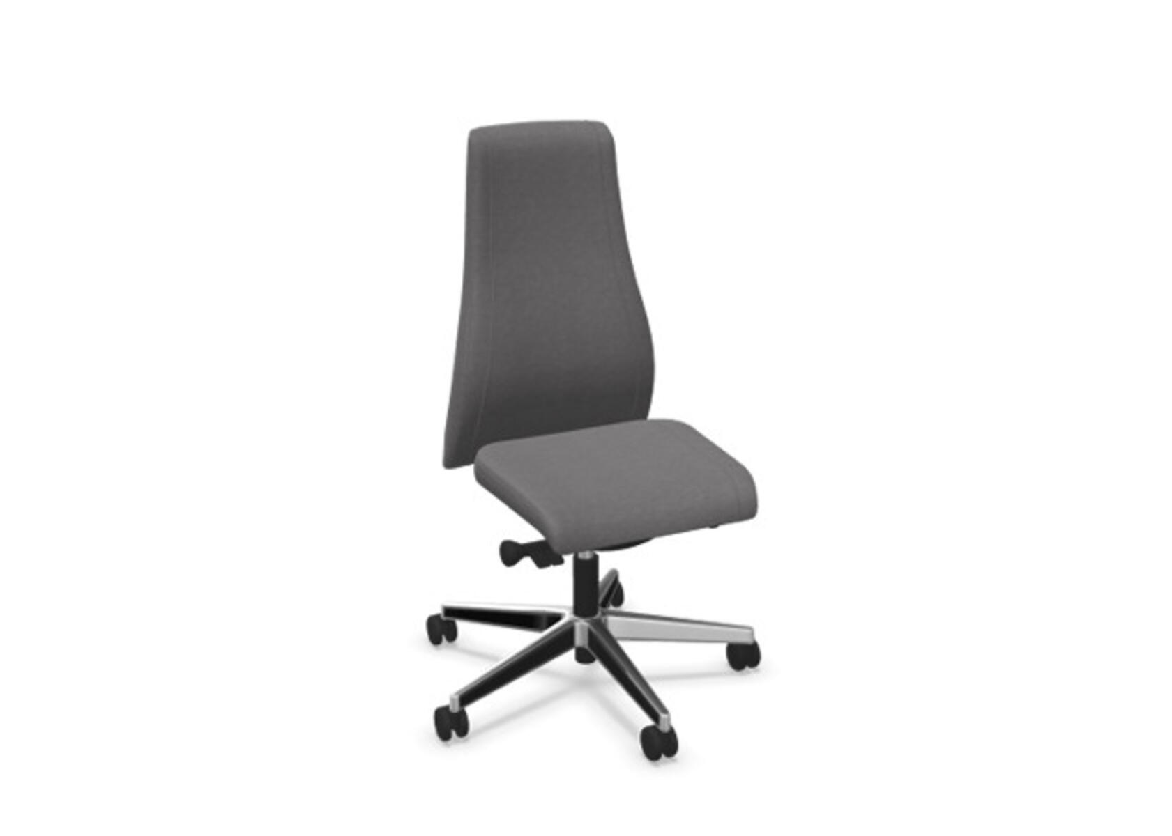 En stilren og ergonomisk kontorstol med fuldpolstret høj ryg og synkronmekanisme, designet til at give støtte ved aktiv siddestilling gennem hele arbejdsdagen. Polstret i slidstærkt polyesterstof. Den synkroniserede bevægelse mellem ryg og sæde giver en aktiv og behagelig siddestilling; ryglænet har en hældning på 20° synkroniseret med sædets 11°. Ryglænet kan låses i 5 positioner, og modstanden kan justeres via et drejehåndtag. Ryglænet kan højdejusteres 70 mm med 13 låsepositioner. Stolen har Anti-Shock-funktion, som forhindrer ryglænet i at slå frem, når låsen frigives. Vælg mellem kryds i sort polyamid eller poleret aluminium samt selvbremsende hjul til både hårde og bløde gulve. Som tilvalg kan der vælges lændestøtte, manuelt justerbar i dybden (20 mm) via et drejehåndtag. Armlæn i 2D, 3D eller 4D købes separat.